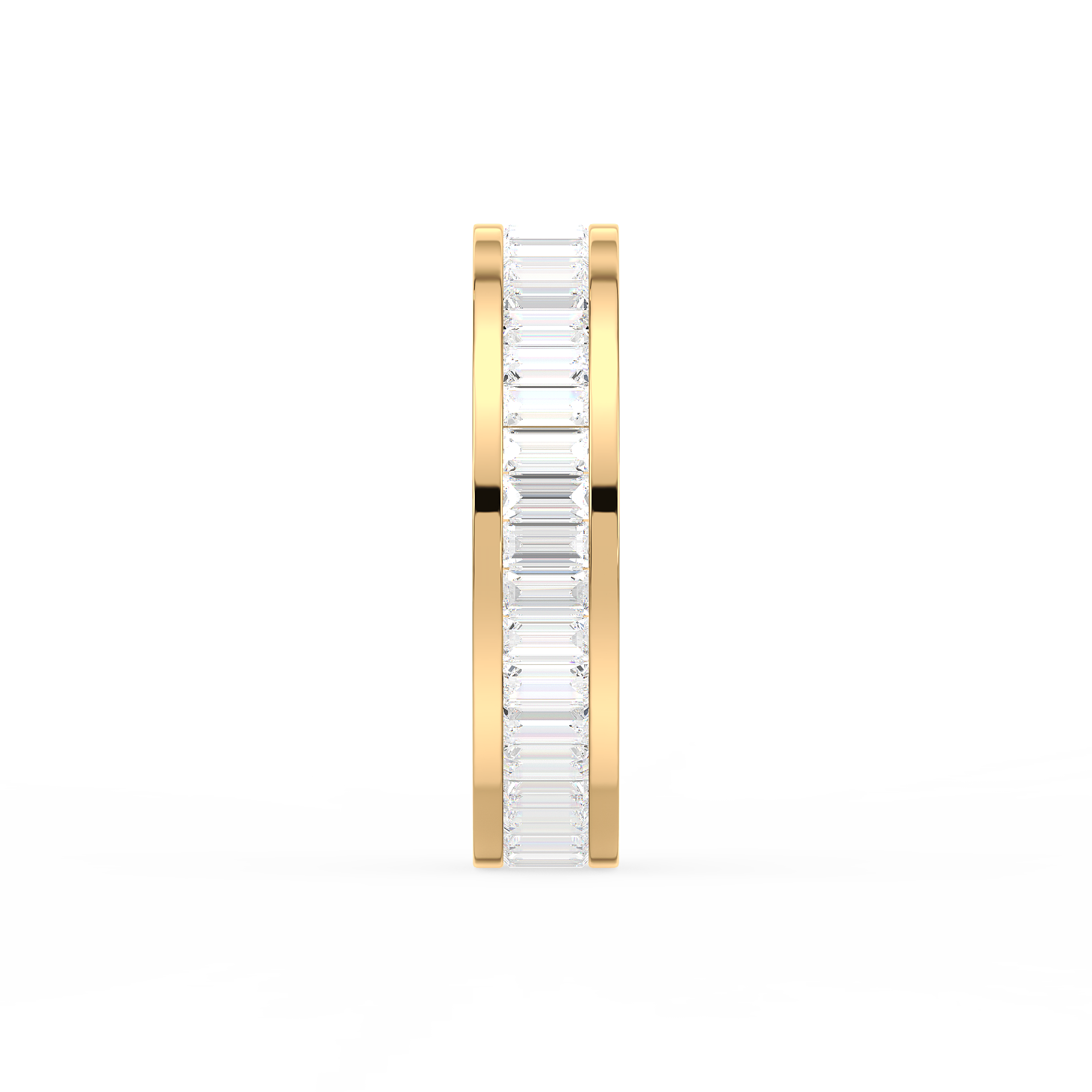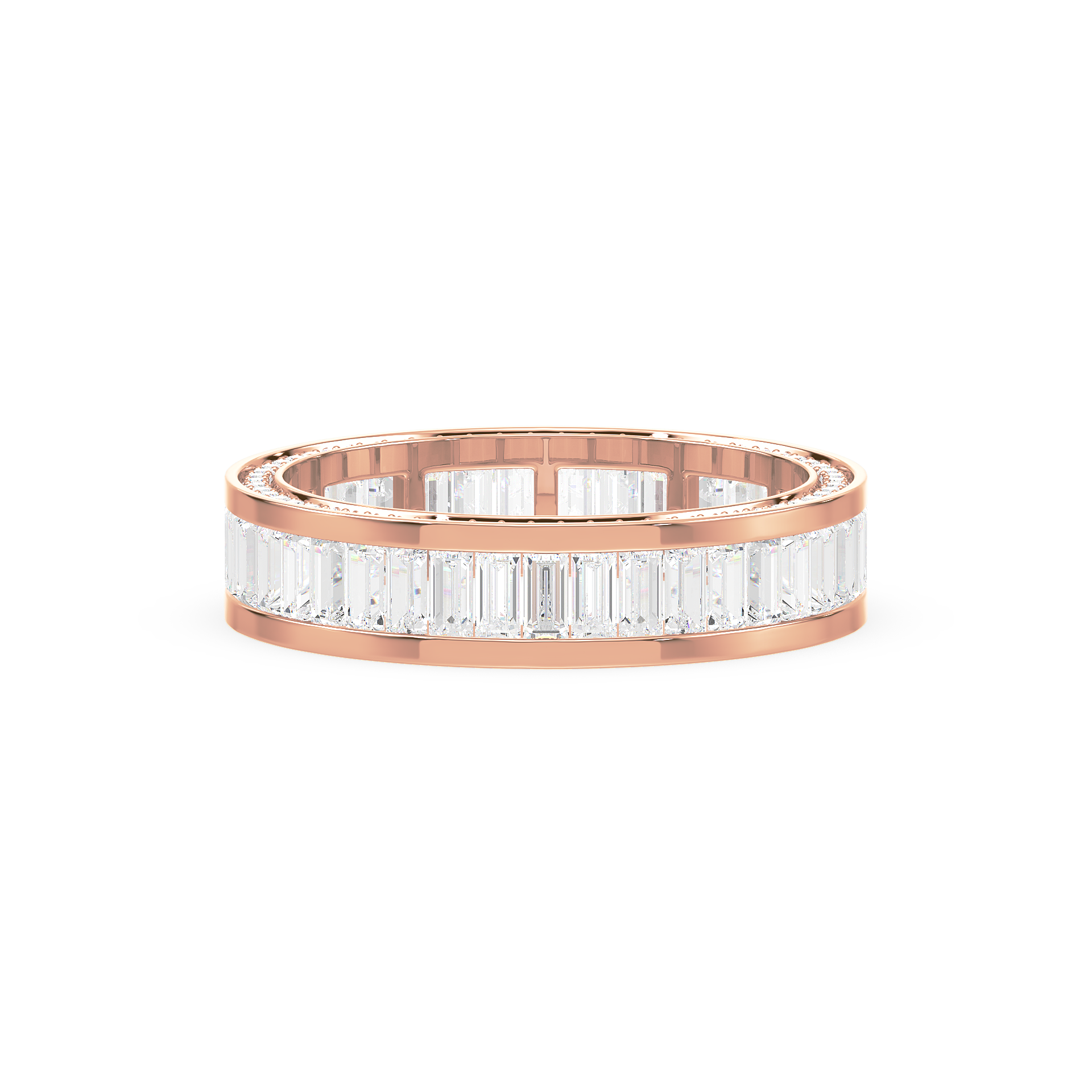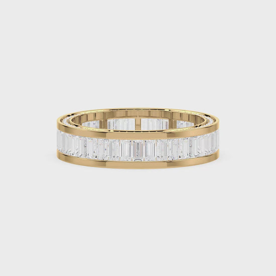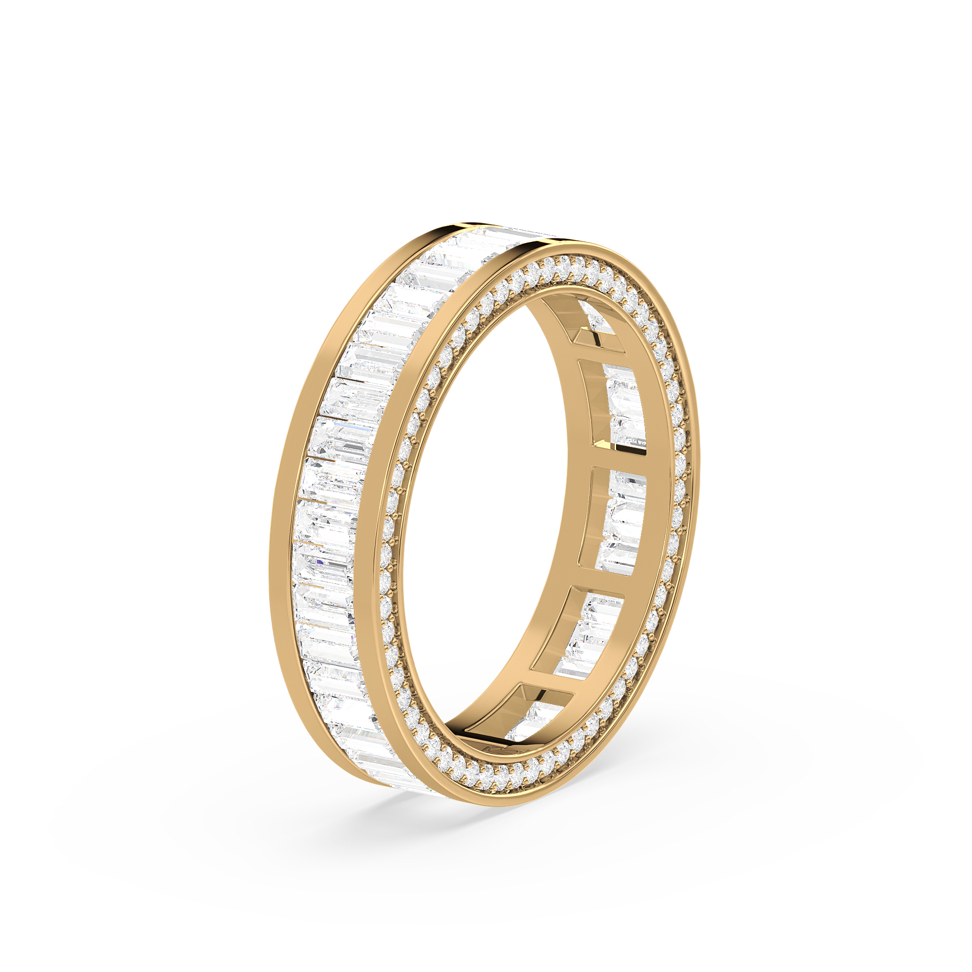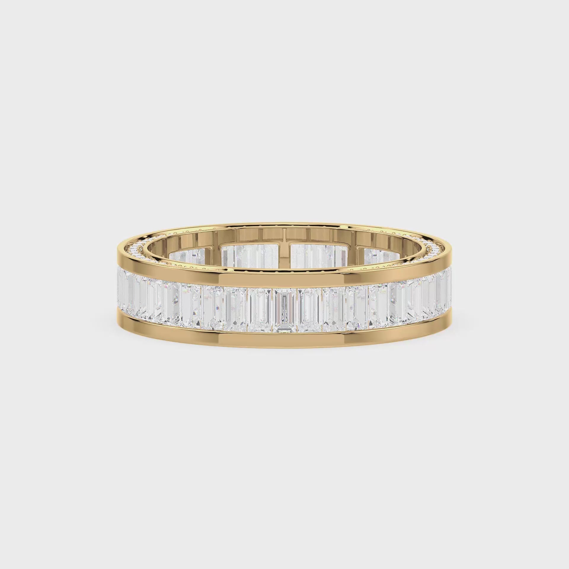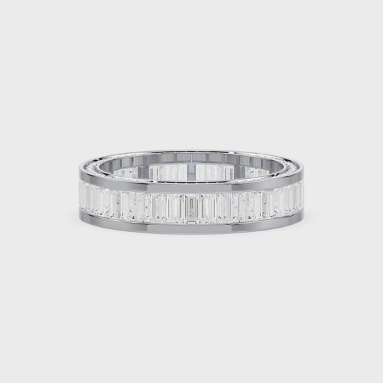 A stunning fusion of baguette cut and pavé set diamonds, the Baguette Pave Eternity Band creates a captivating visual effect. The alternating cuts add texture and brilliance, making it the perfect accessory for those who love sophisticated, modern designs.