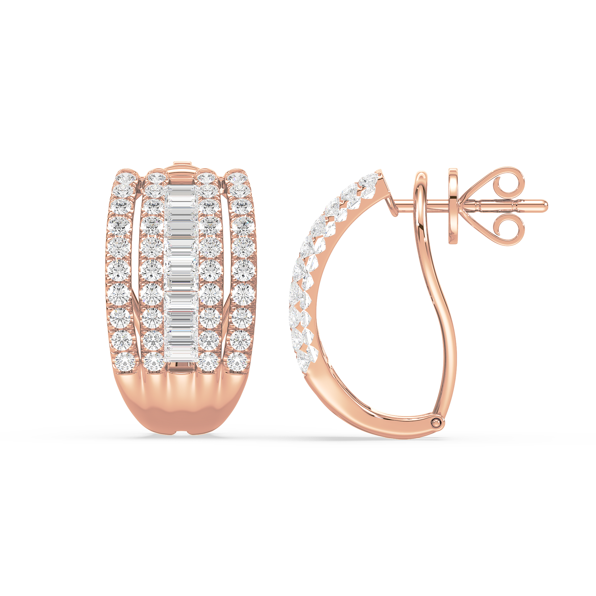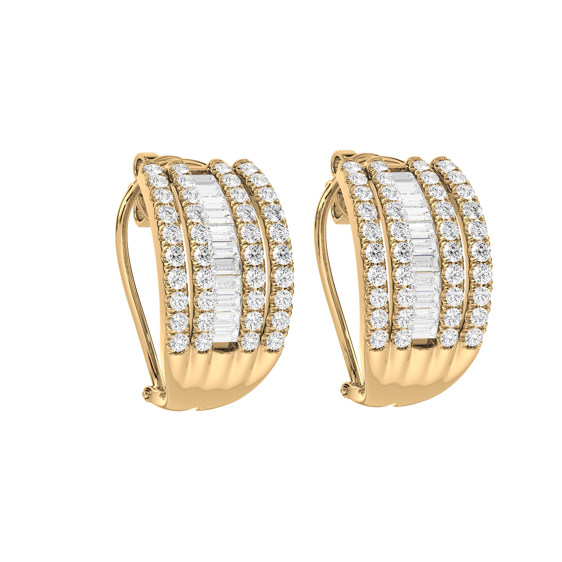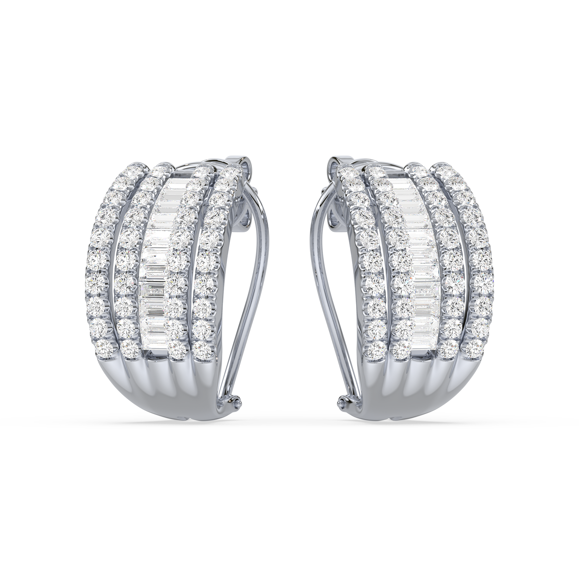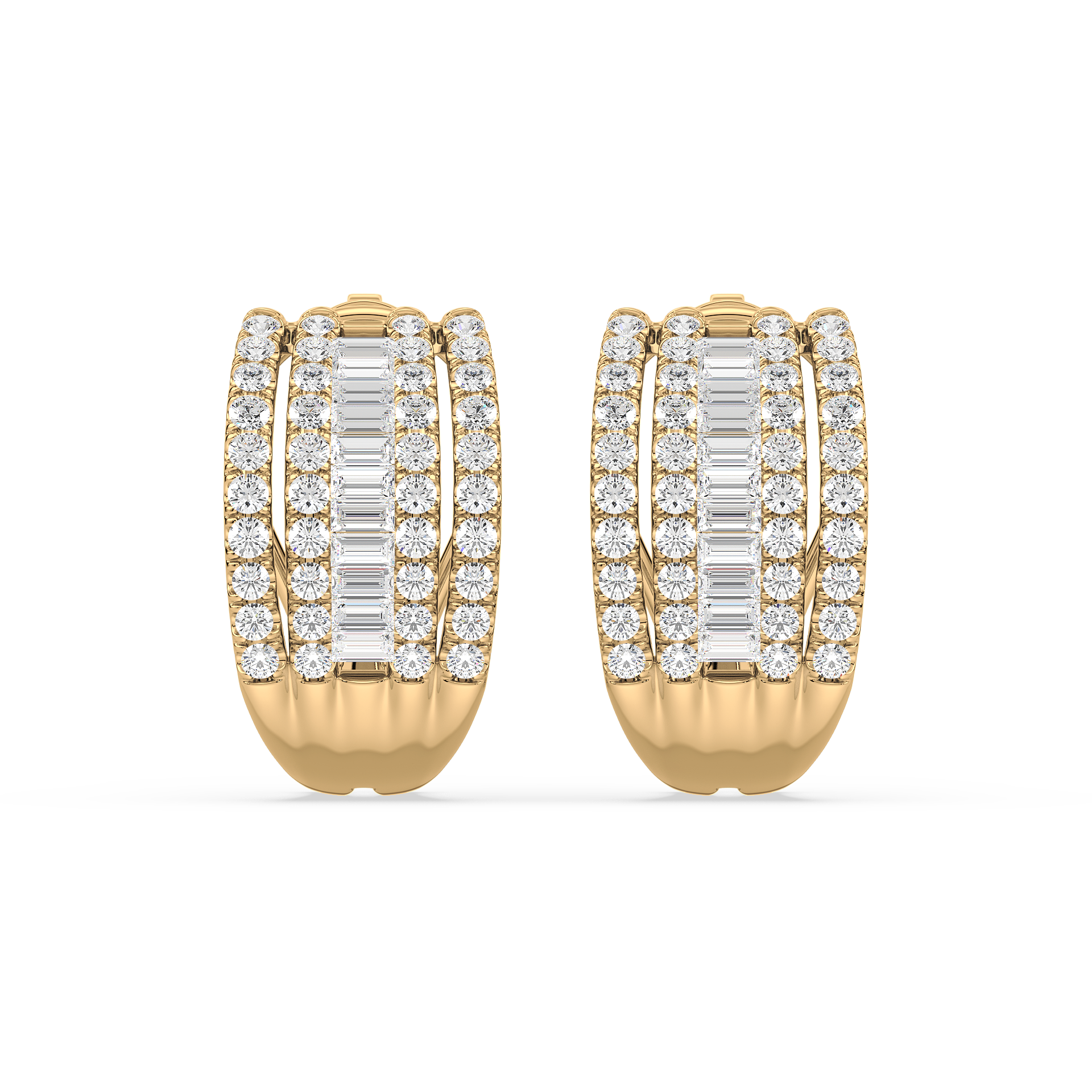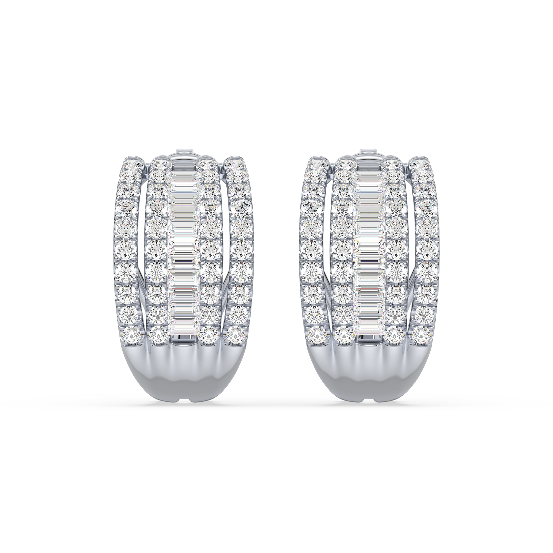 These chic hoop earrings feature a row of baguette diamonds set in a rail design, offering a unique twist on the traditional hoop style. The baguette stones add geometric elegance, making these earrings perfect for those who seek a modern yet sophisticated look.