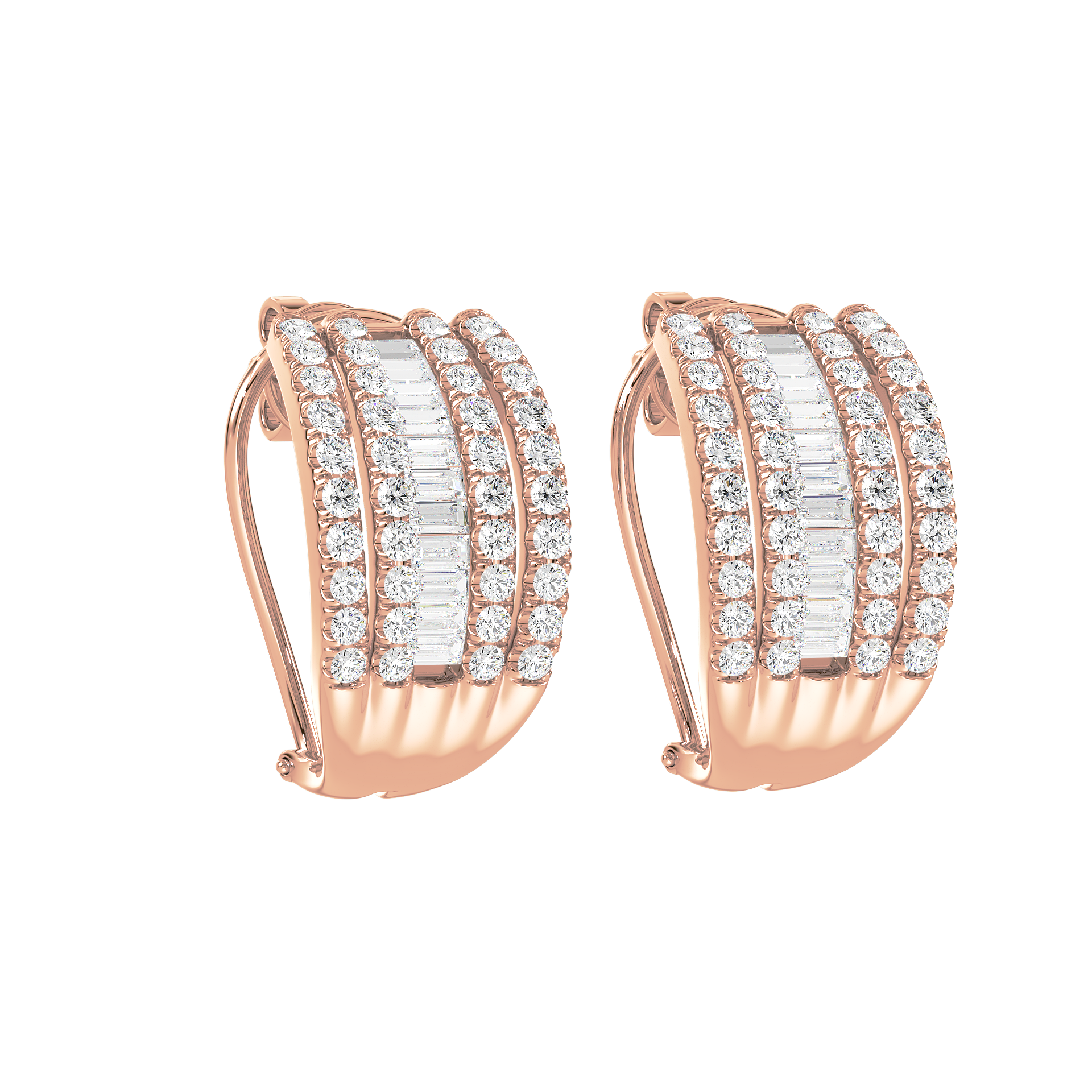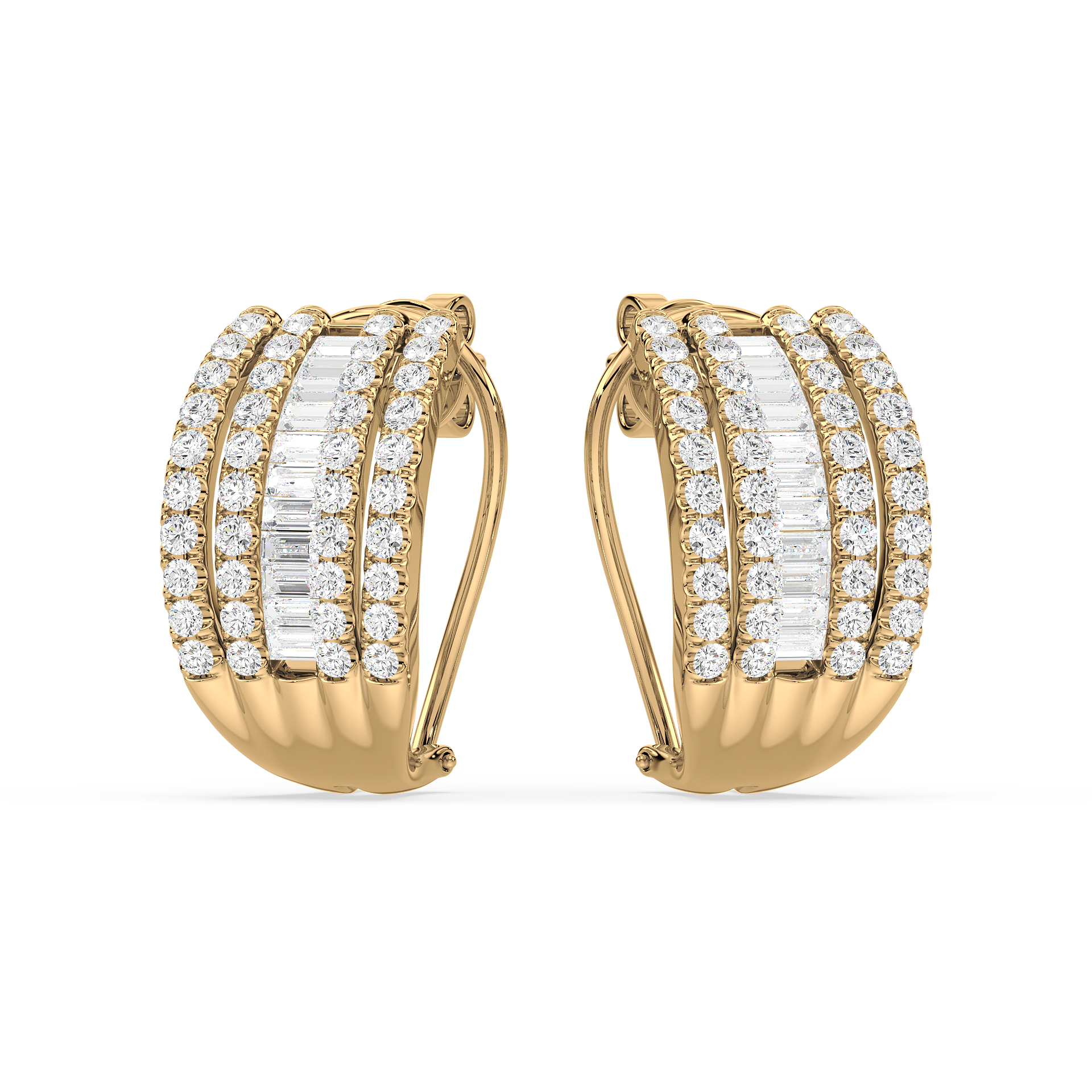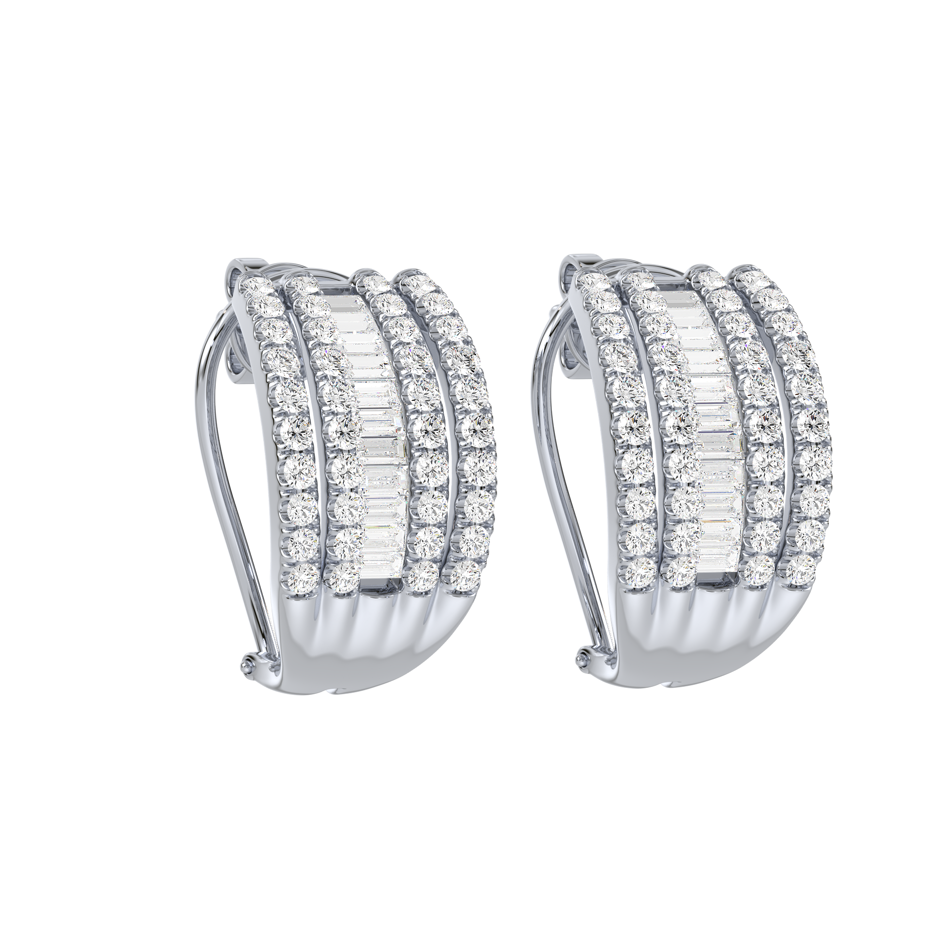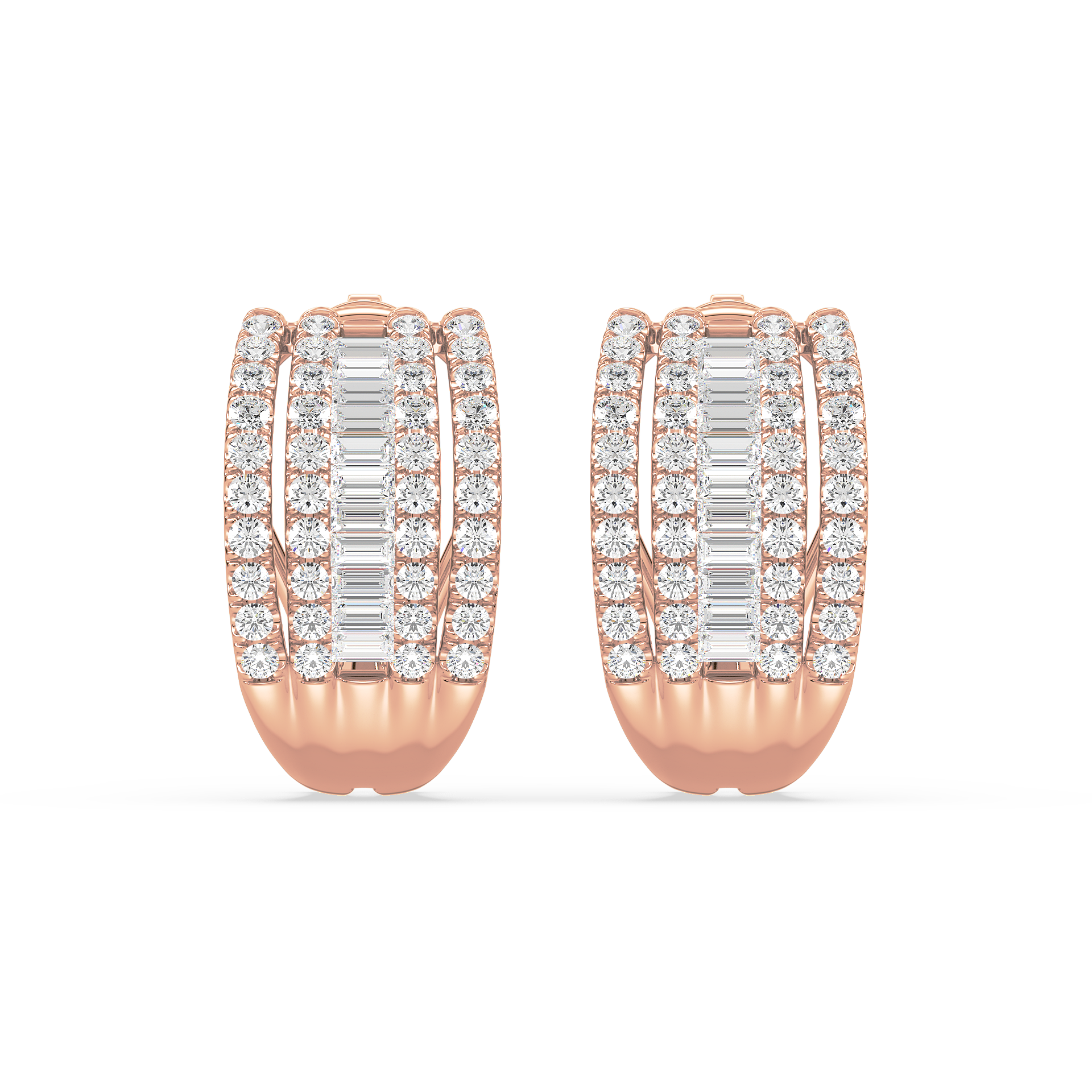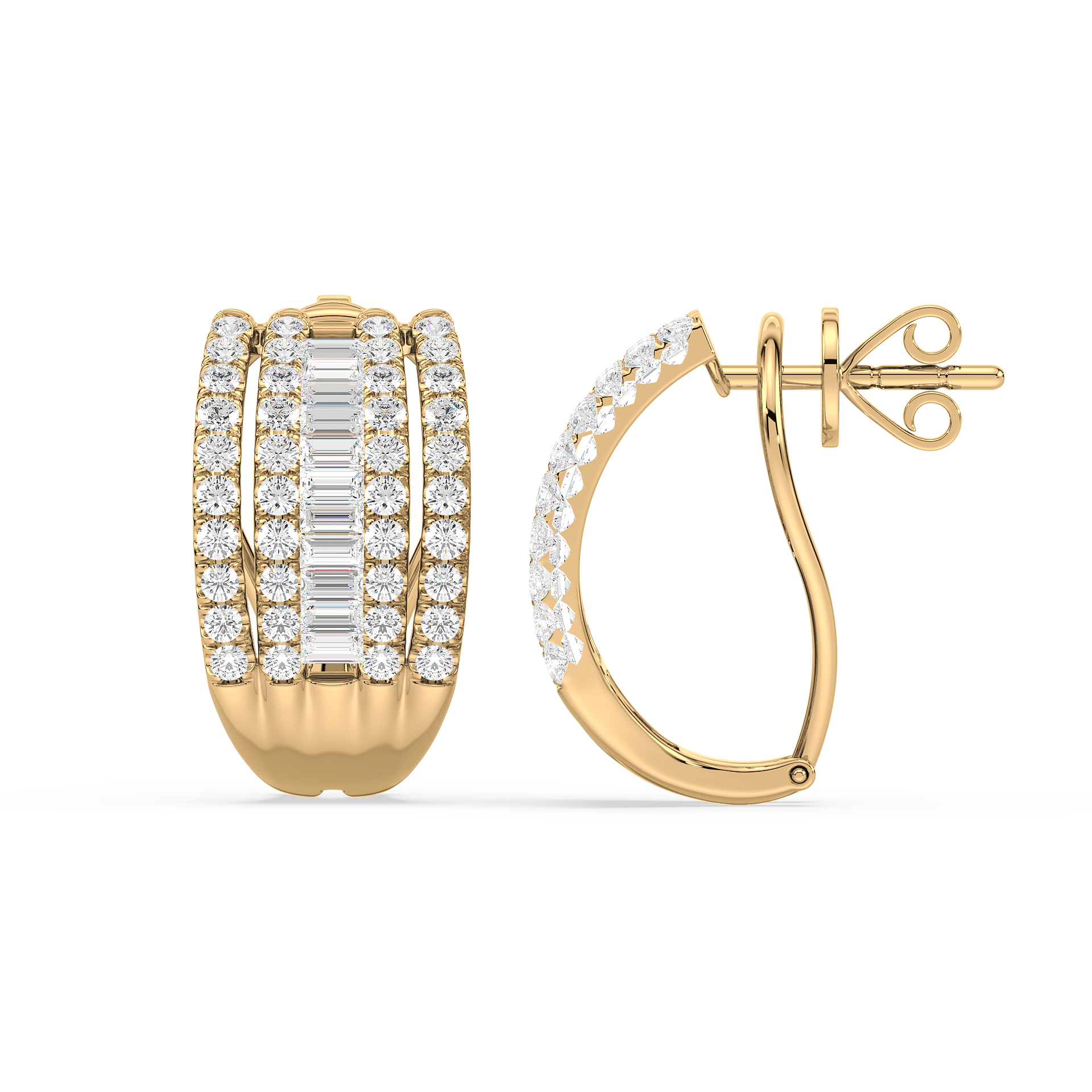 These chic hoop earrings feature a row of baguette diamonds set in a rail design, offering a unique twist on the traditional hoop style. The baguette stones add geometric elegance, making these earrings perfect for those who seek a modern yet sophisticated look.
