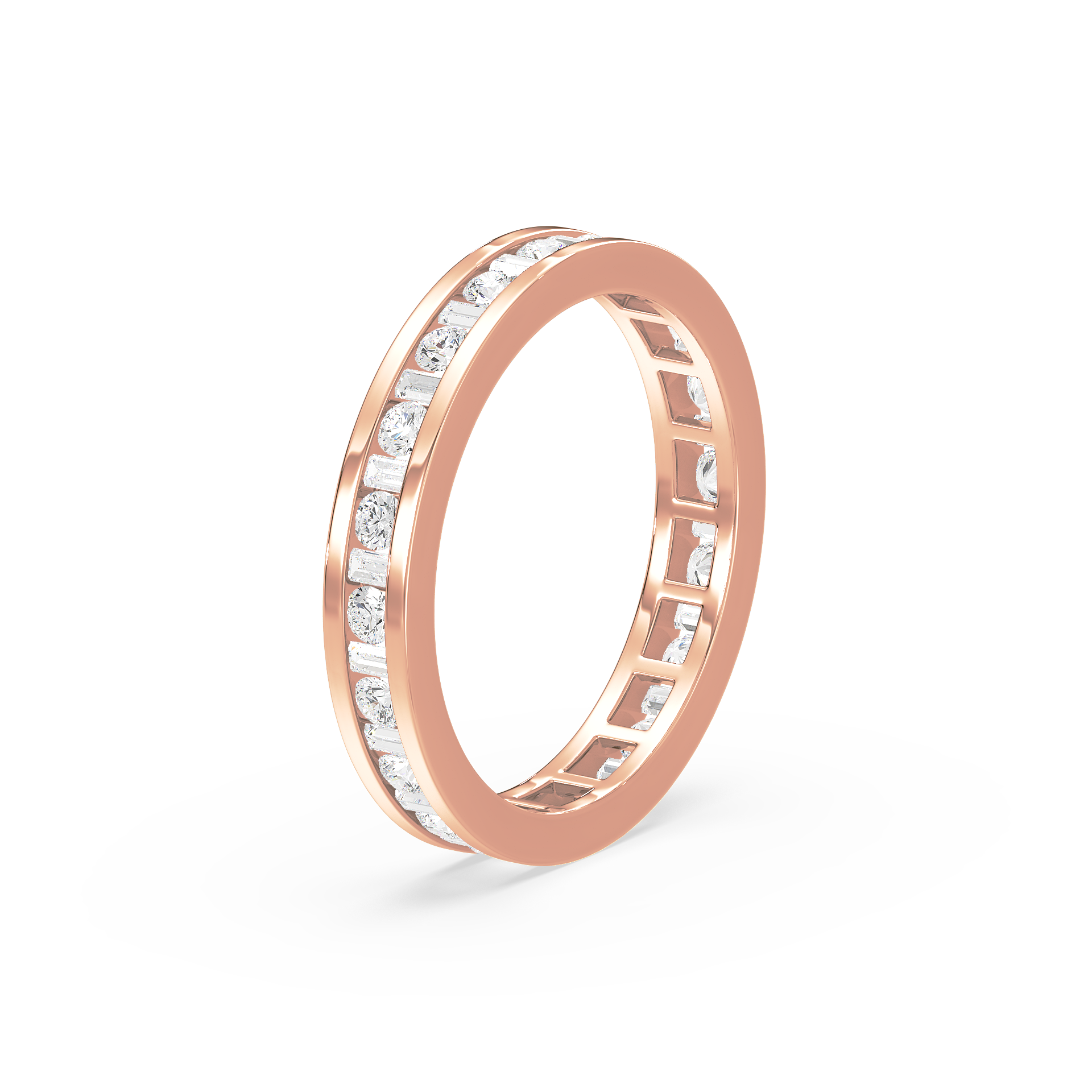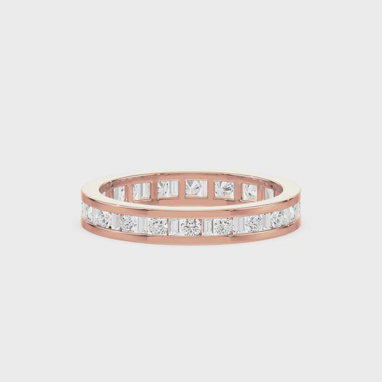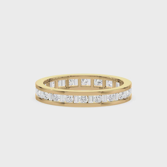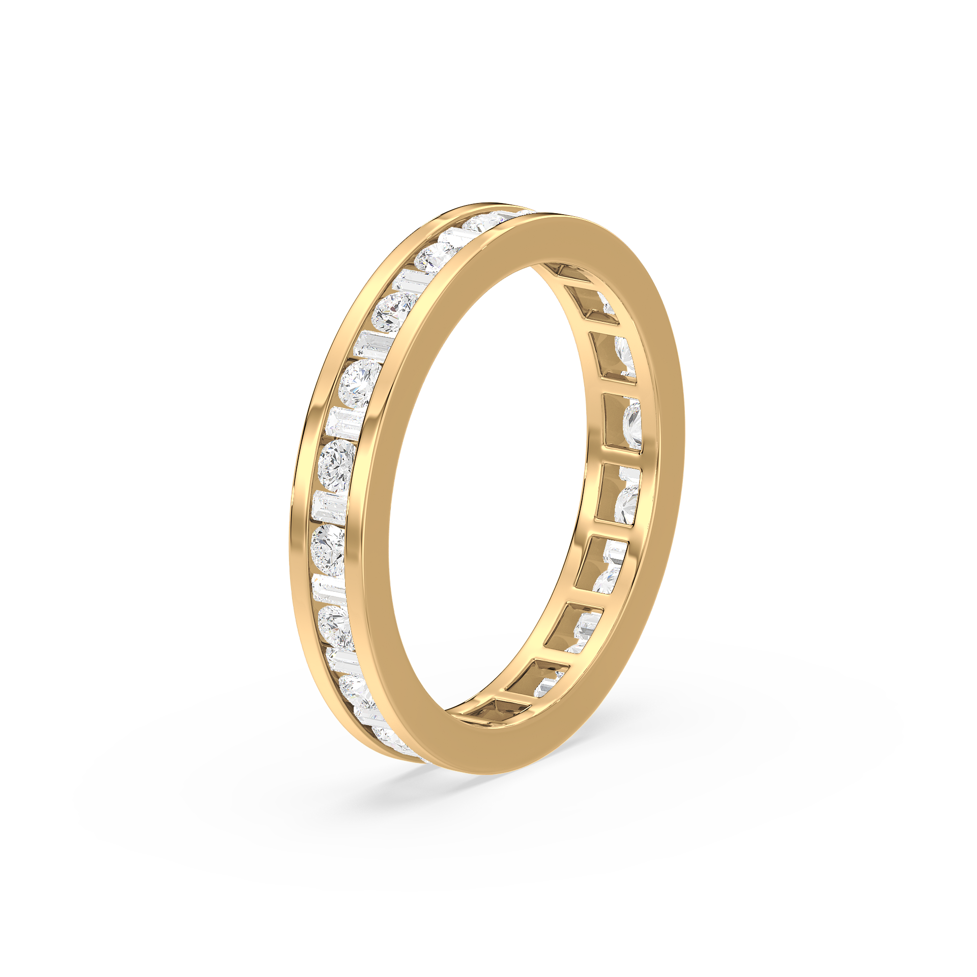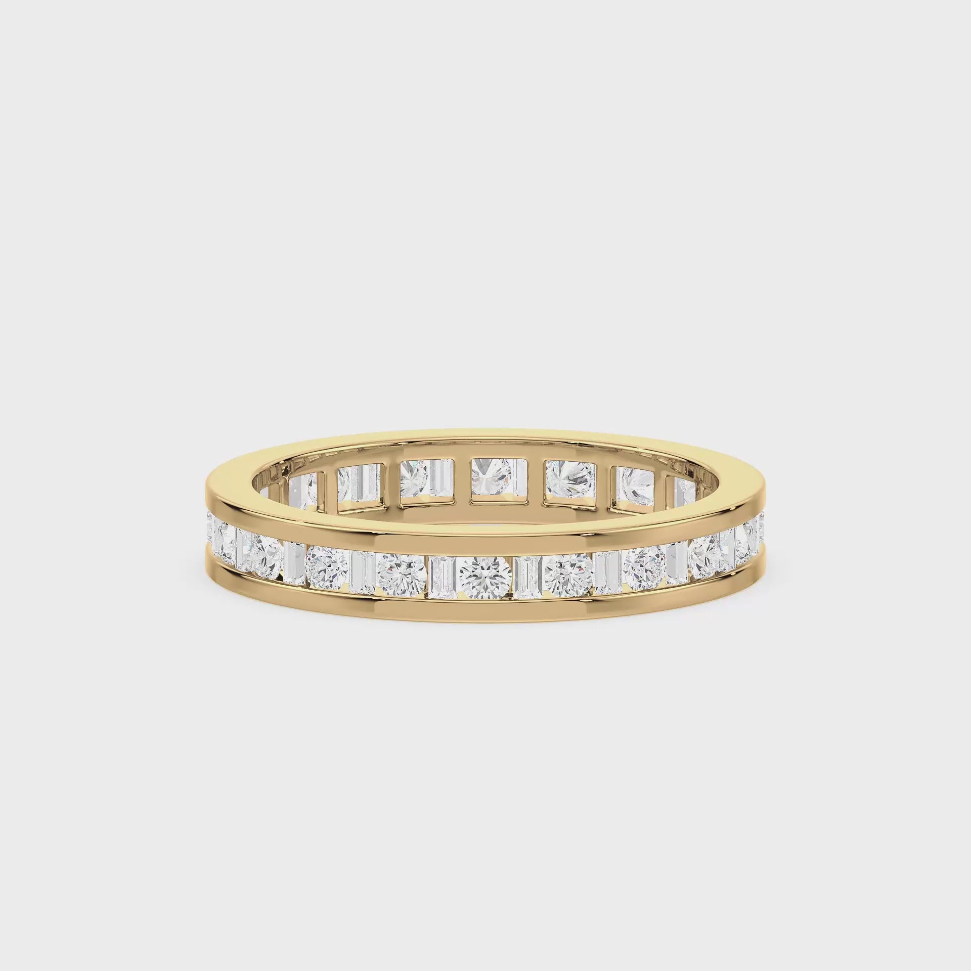 This Baguette-Round Channel Eternity Ring showcases alternating baguette and round diamonds, all securely set in a channel setting for a sleek, contemporary look. Its continuous design creates a timeless symbol of love that shines from every angle.