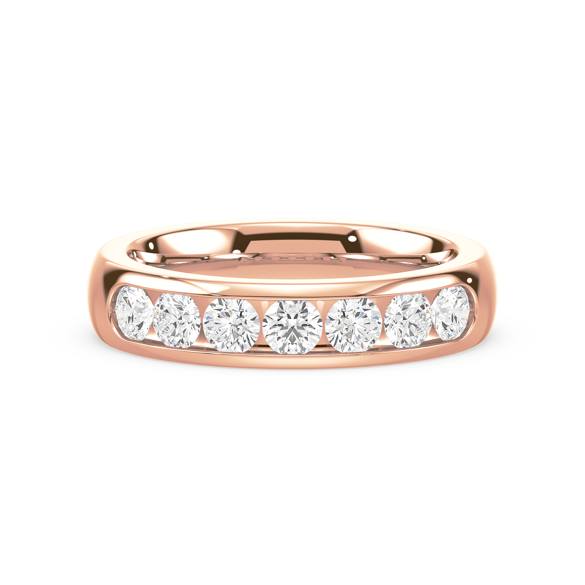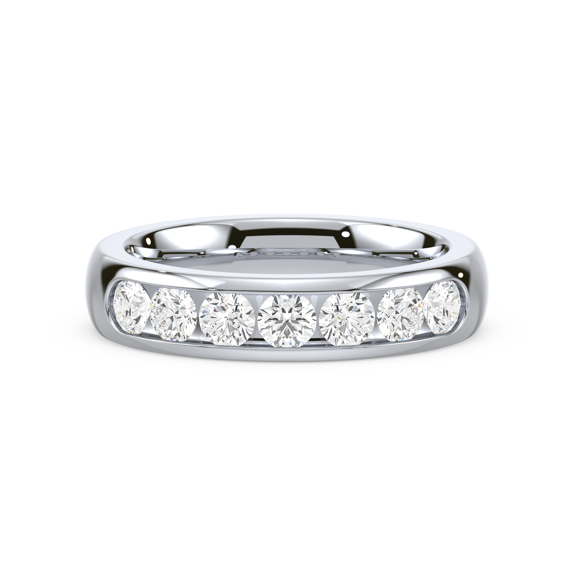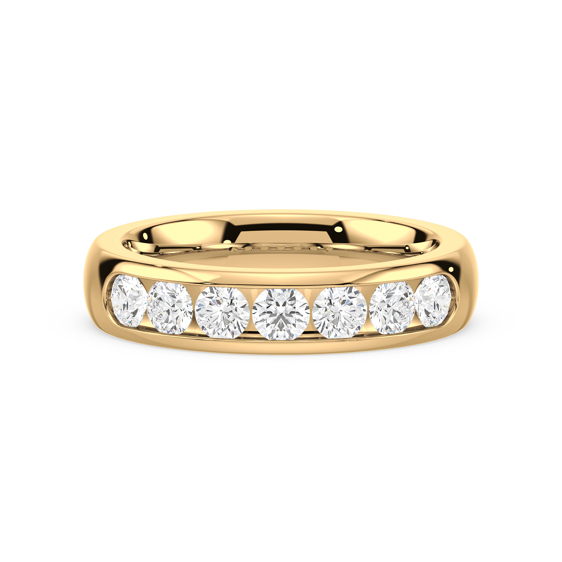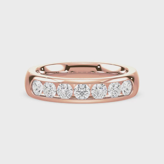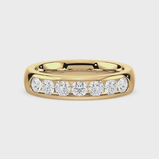This channel-set seven-stone ring features a row of sparkling diamonds arranged in a sleek, seamless design. Ideal as an anniversary band or a stand-alone piece, its modern elegance is perfect for everyday wear.