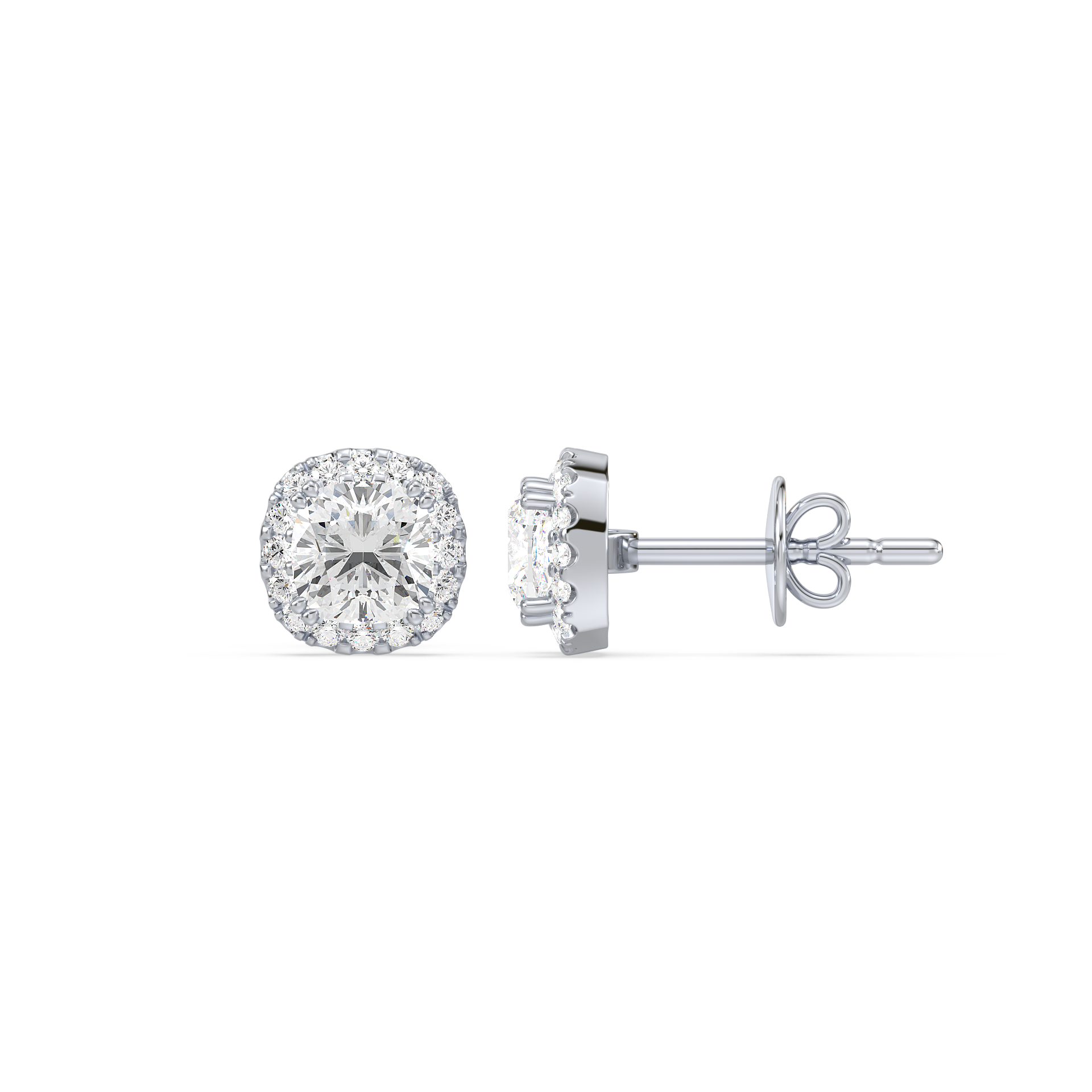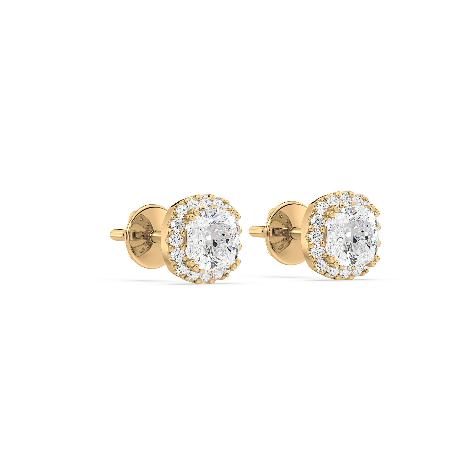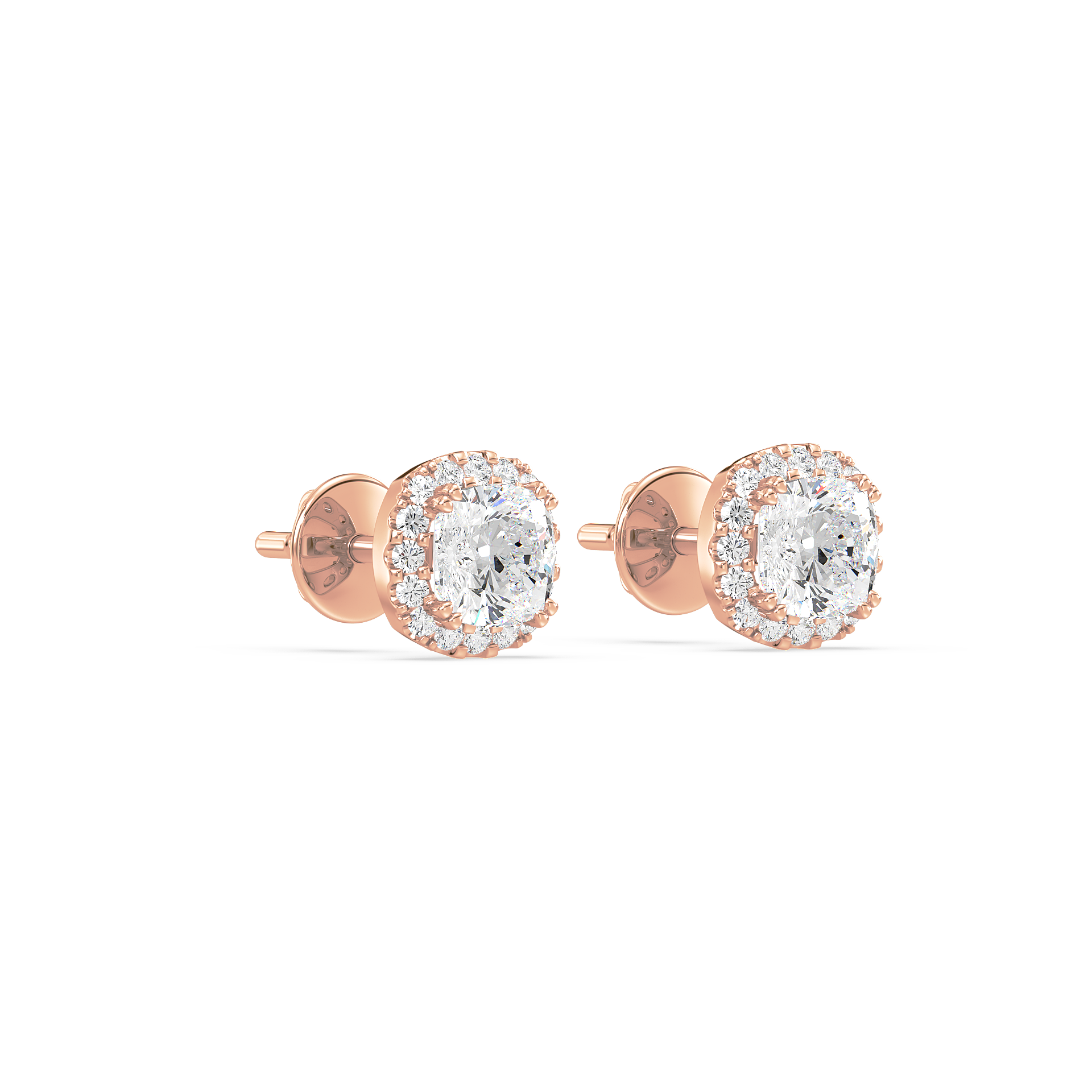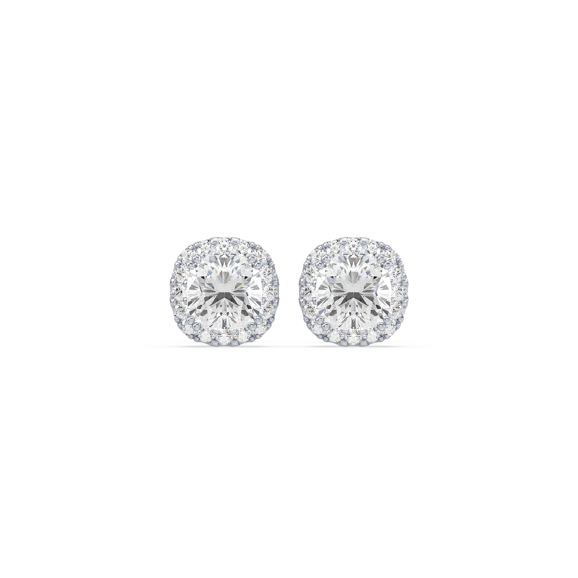 These cushion-cut diamond studs are surrounded by a halo of smaller diamonds, amplifying their beauty and sparkle. The soft, rounded edges of the cushion shape, combined with the halo, create a romantic and timeless appeal.