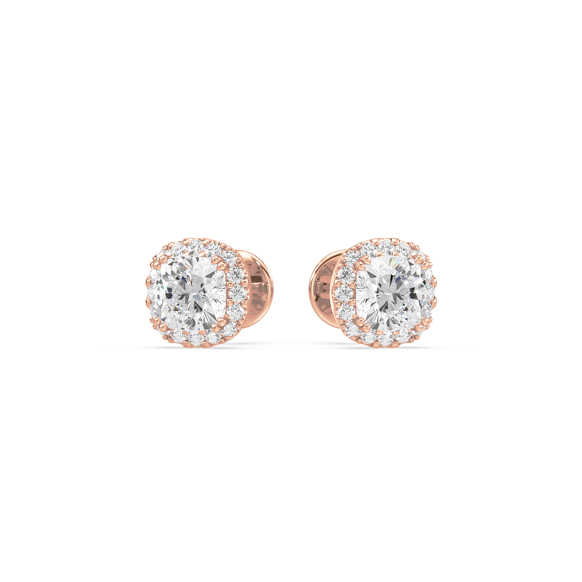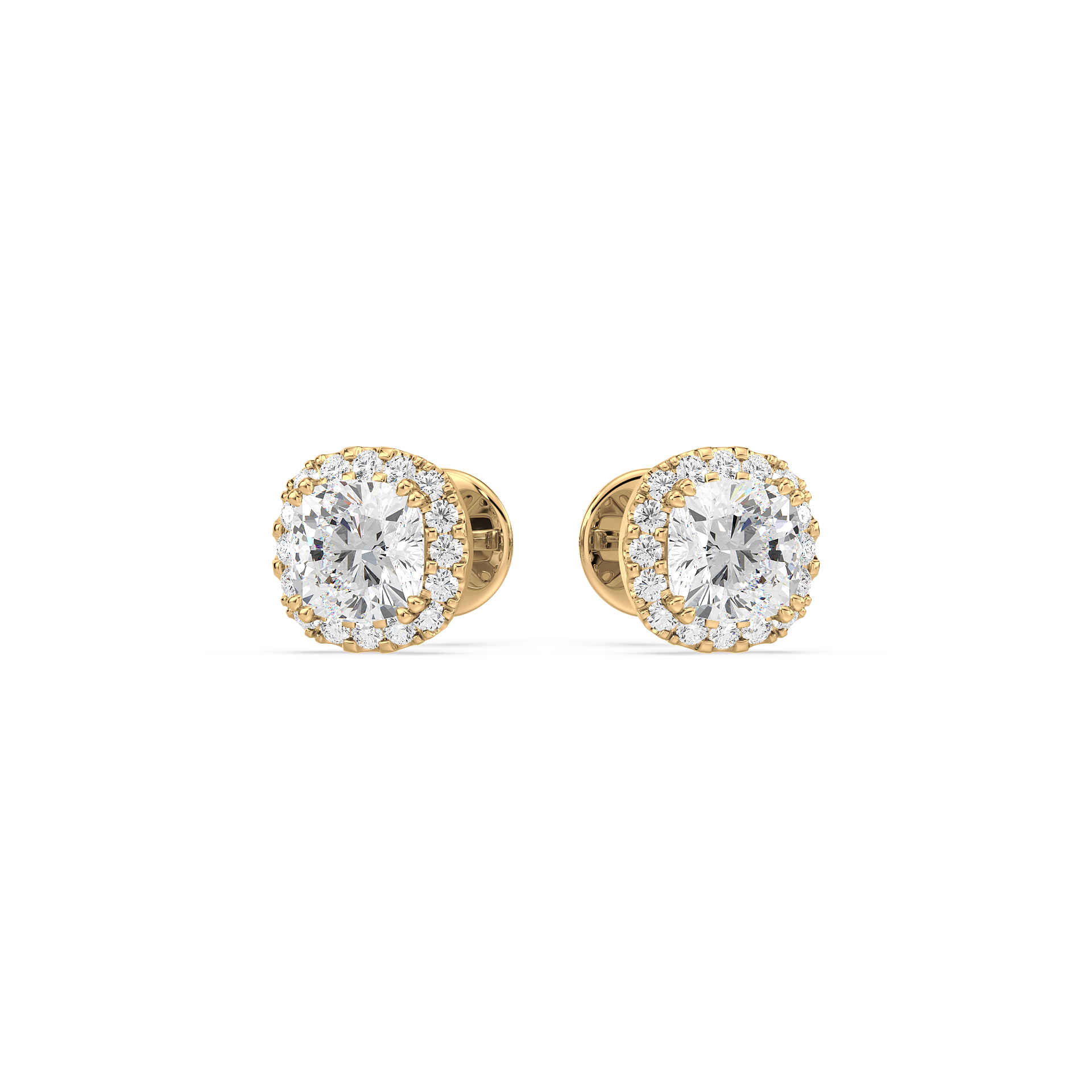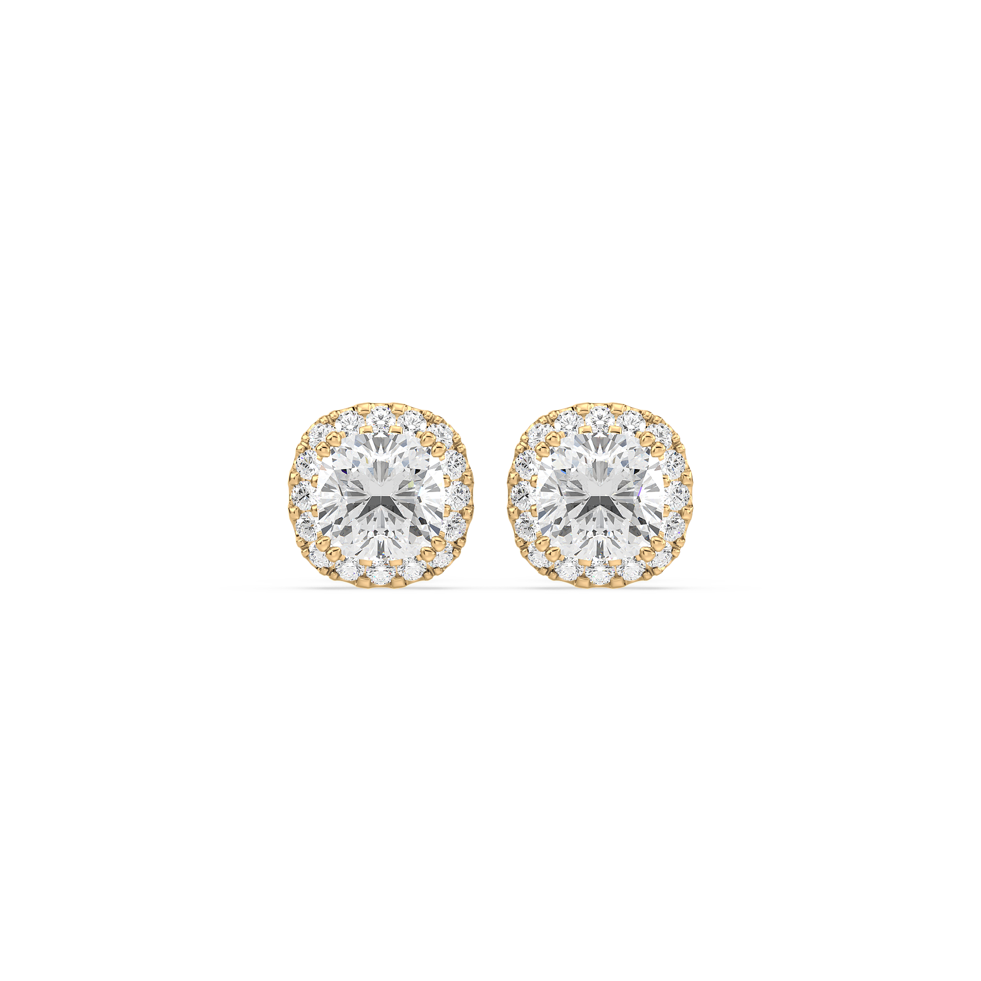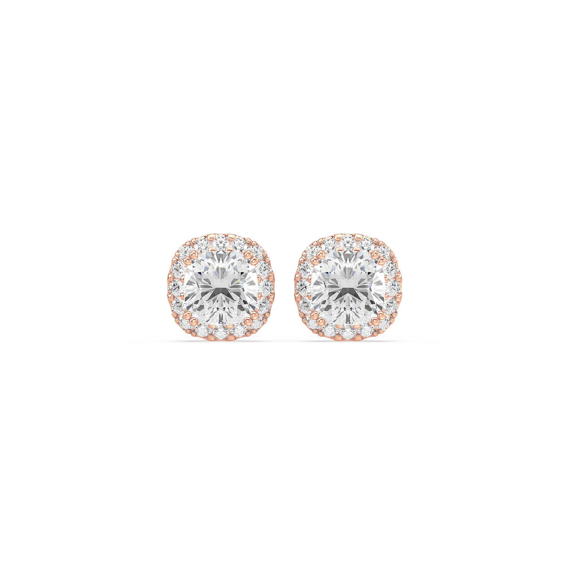 These cushion-cut diamond studs are surrounded by a halo of smaller diamonds, amplifying their beauty and sparkle. The soft, rounded edges of the cushion shape, combined with the halo, create a romantic and timeless appeal.