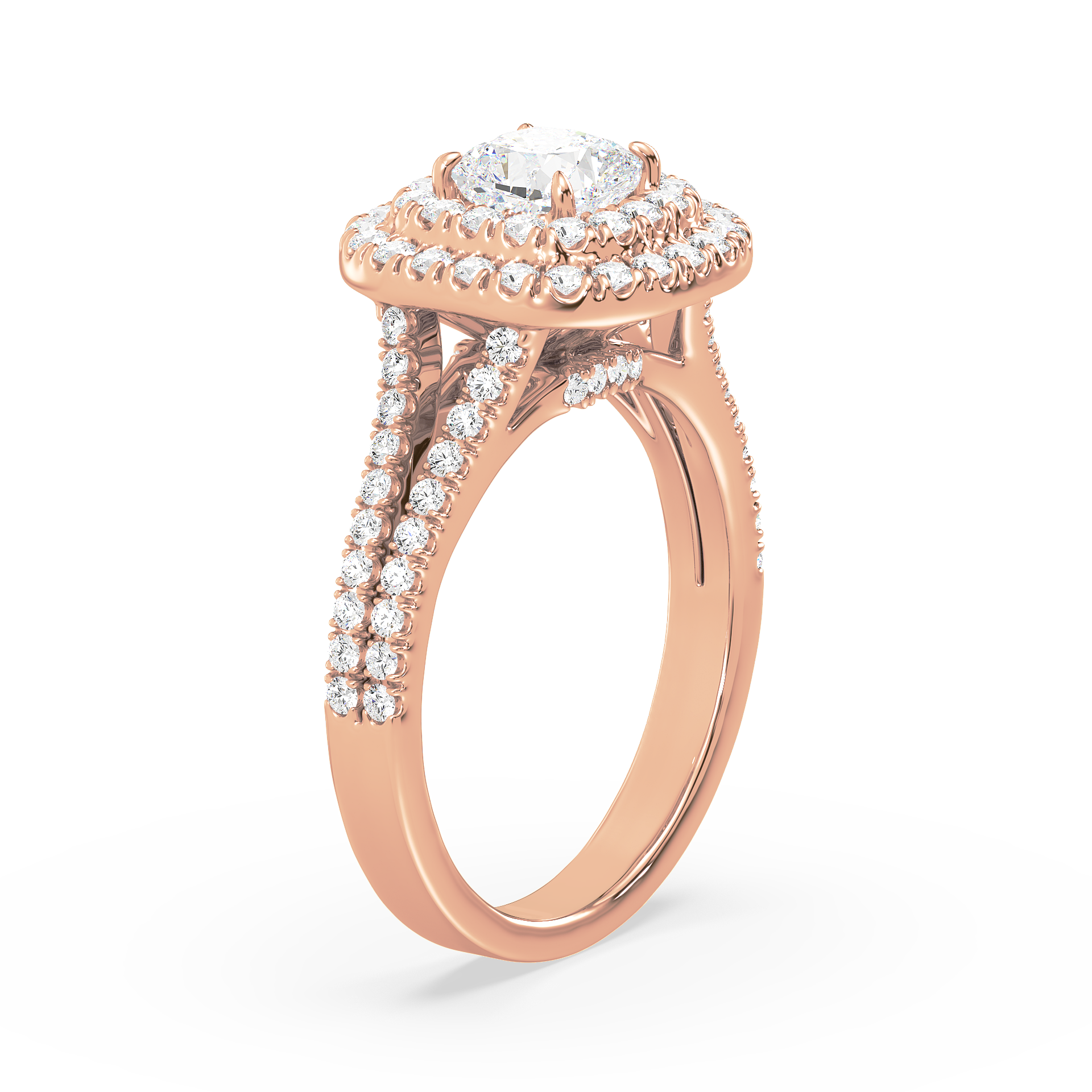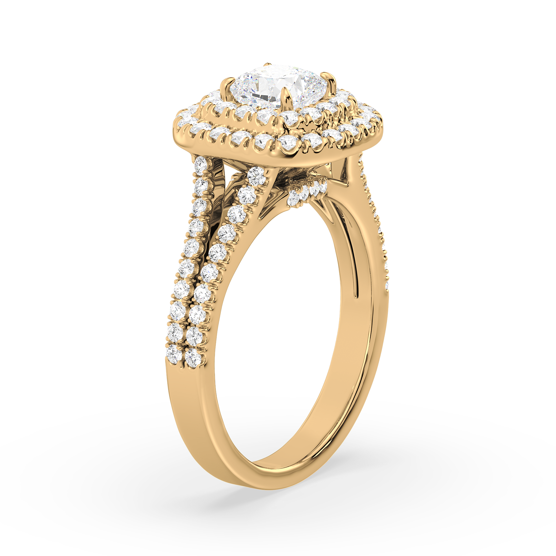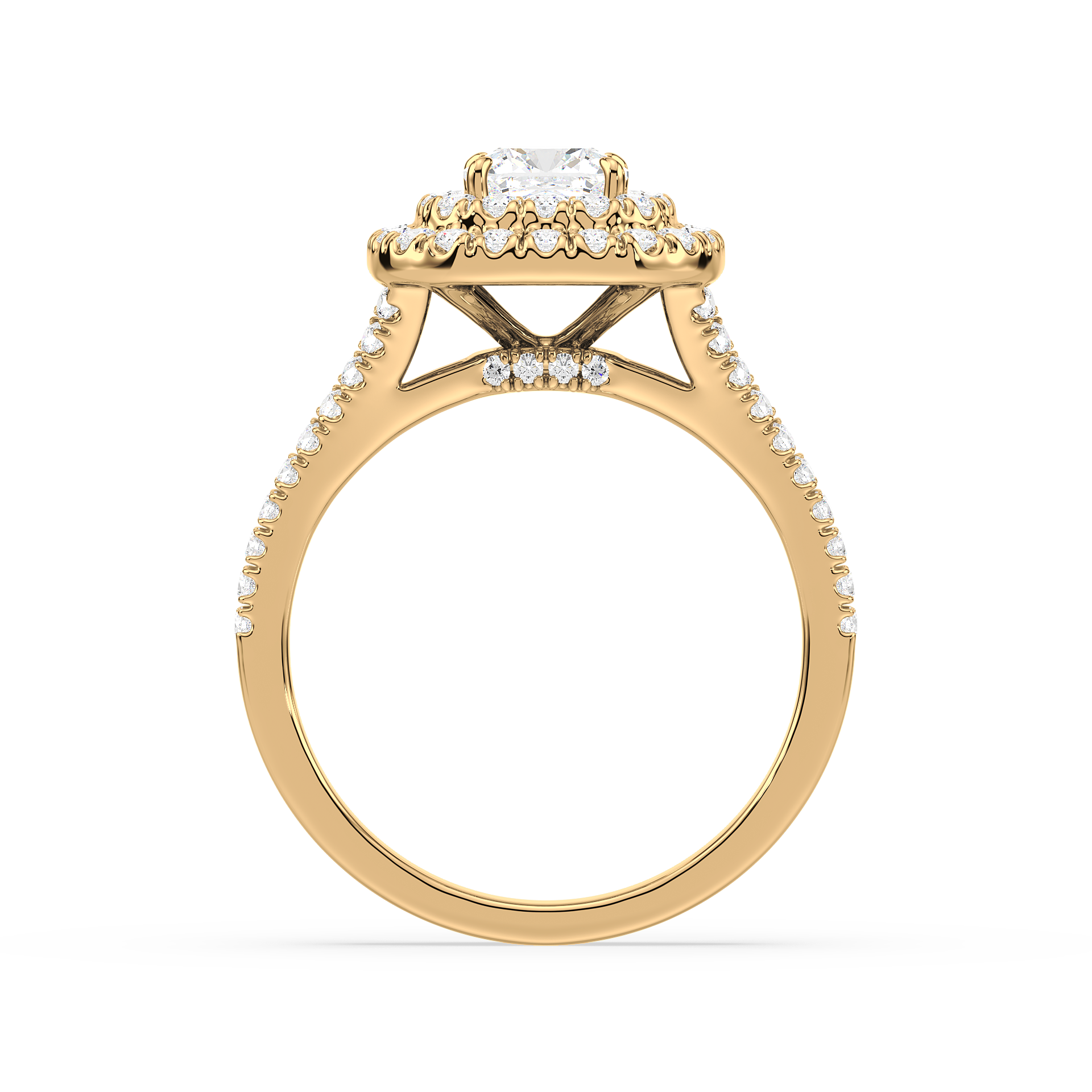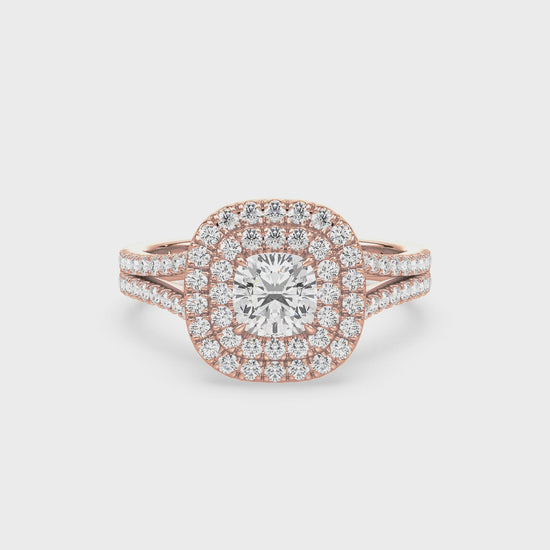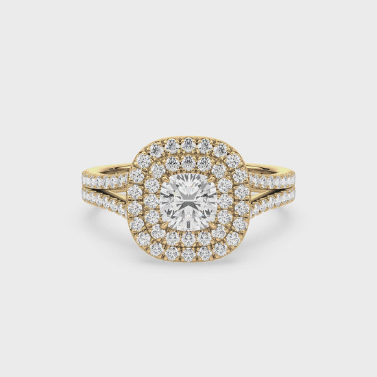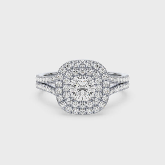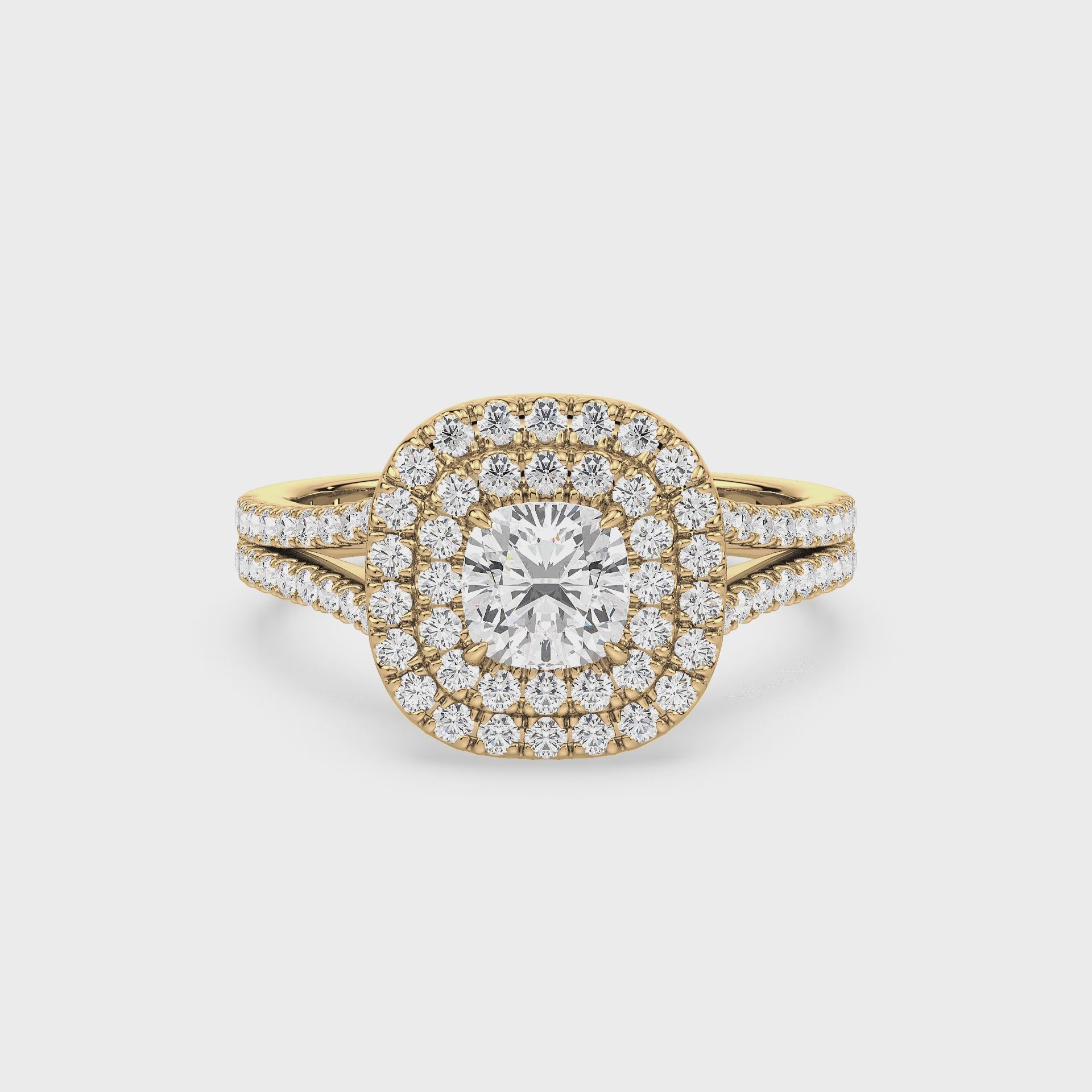 A true statement piece, the Cushion Solitaire Double Halo Shank Ring features a brilliant cushion-cut diamond encircled by two radiant halos of smaller diamonds. Set on a diamond-encrusted shank, this design offers unparalleled brilliance and luxury.