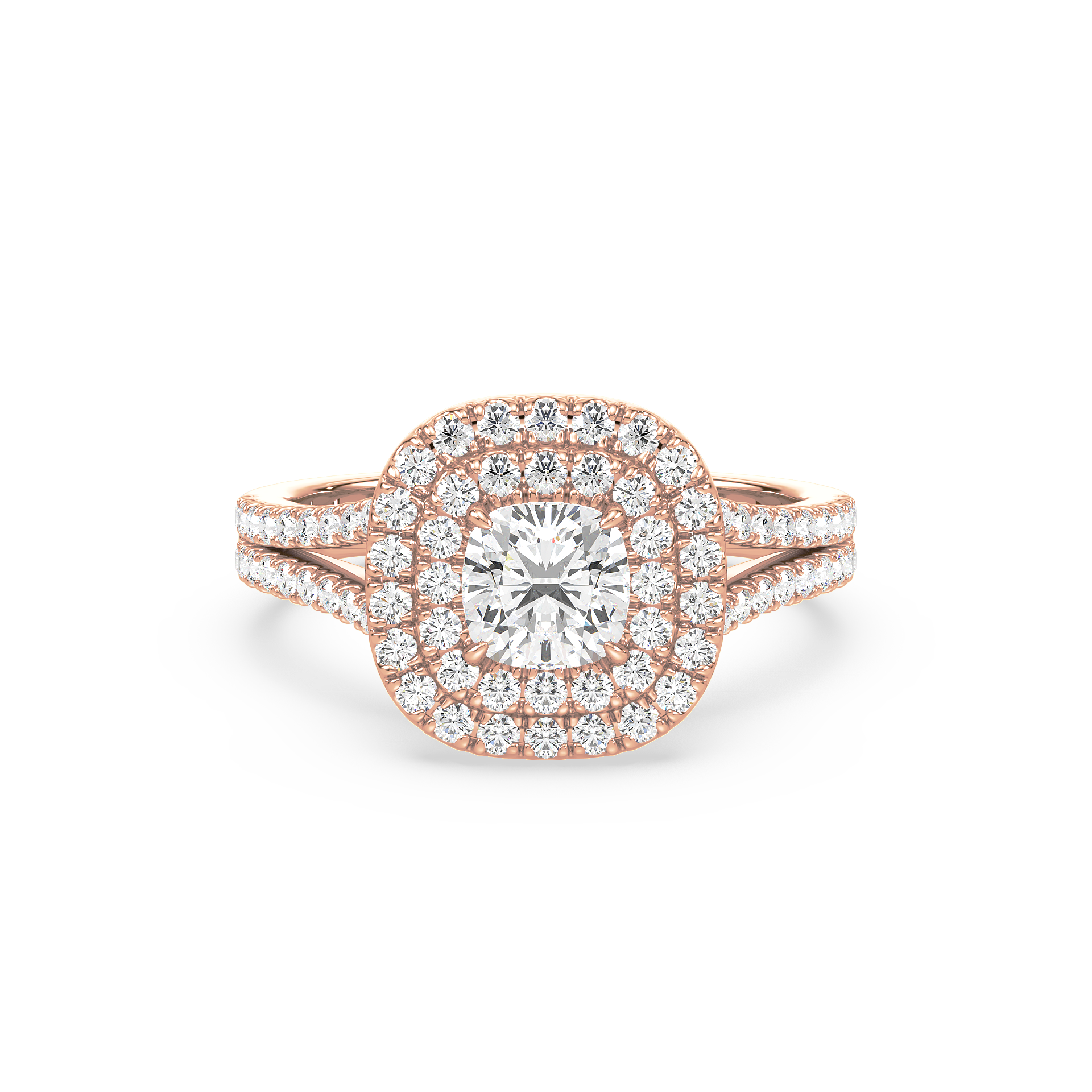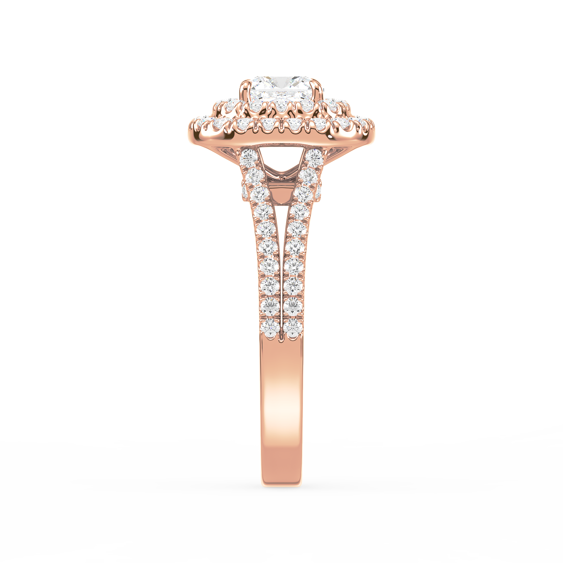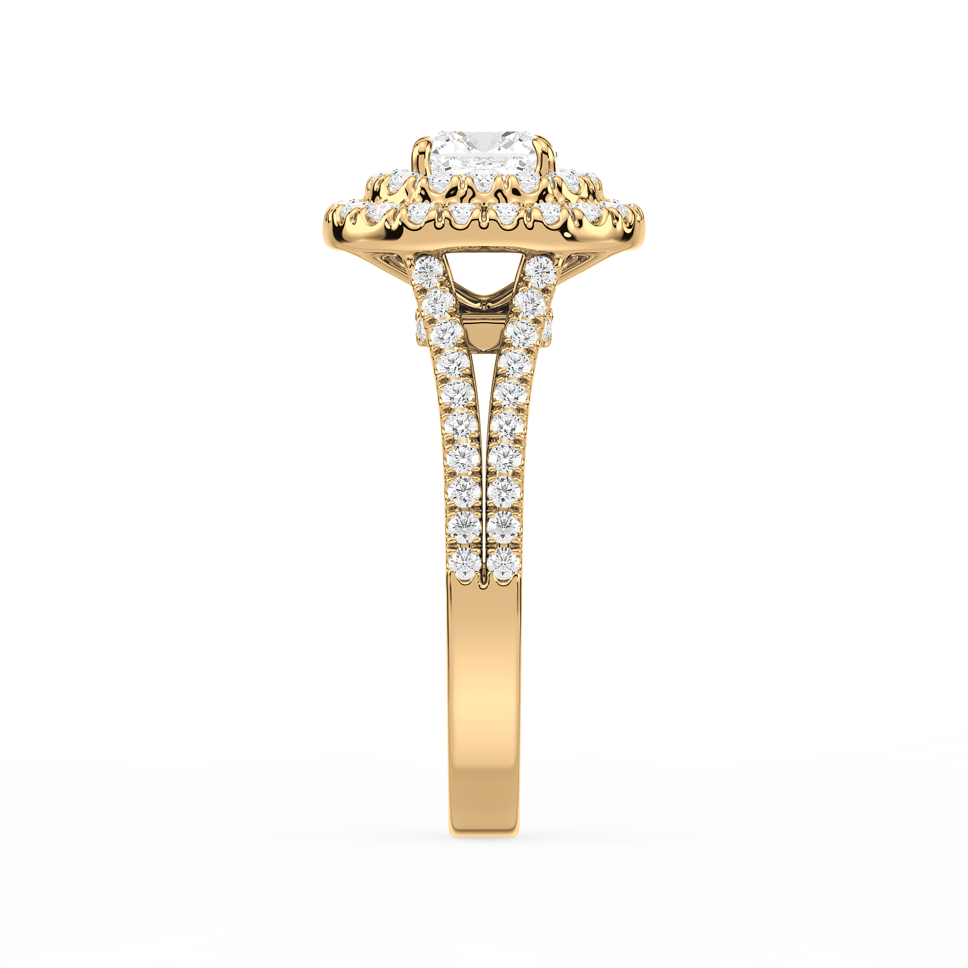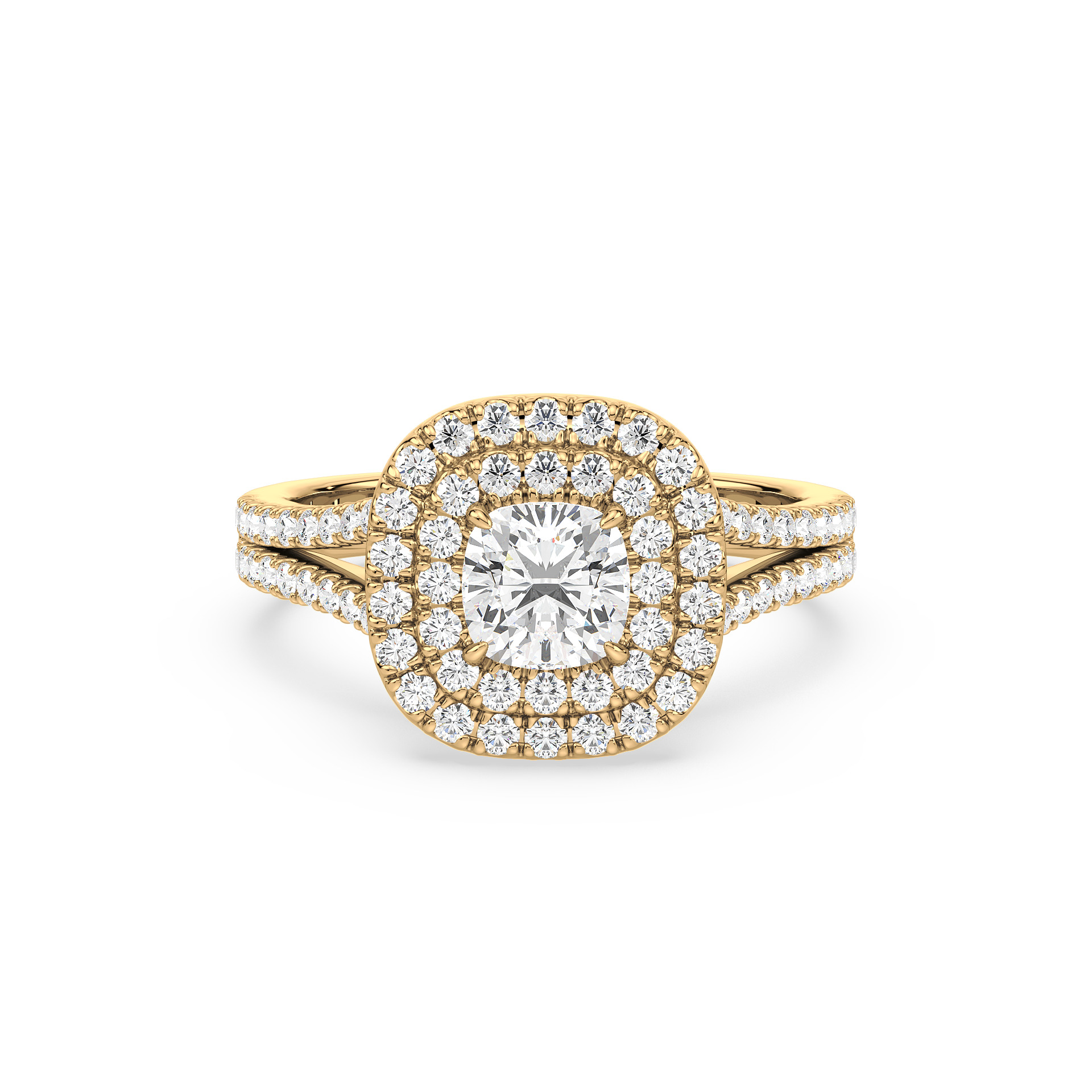 A true statement piece, the Cushion Solitaire Double Halo Shank Ring features a brilliant cushion-cut diamond encircled by two radiant halos of smaller diamonds. Set on a diamond-encrusted shank, this design offers unparalleled brilliance and luxury.