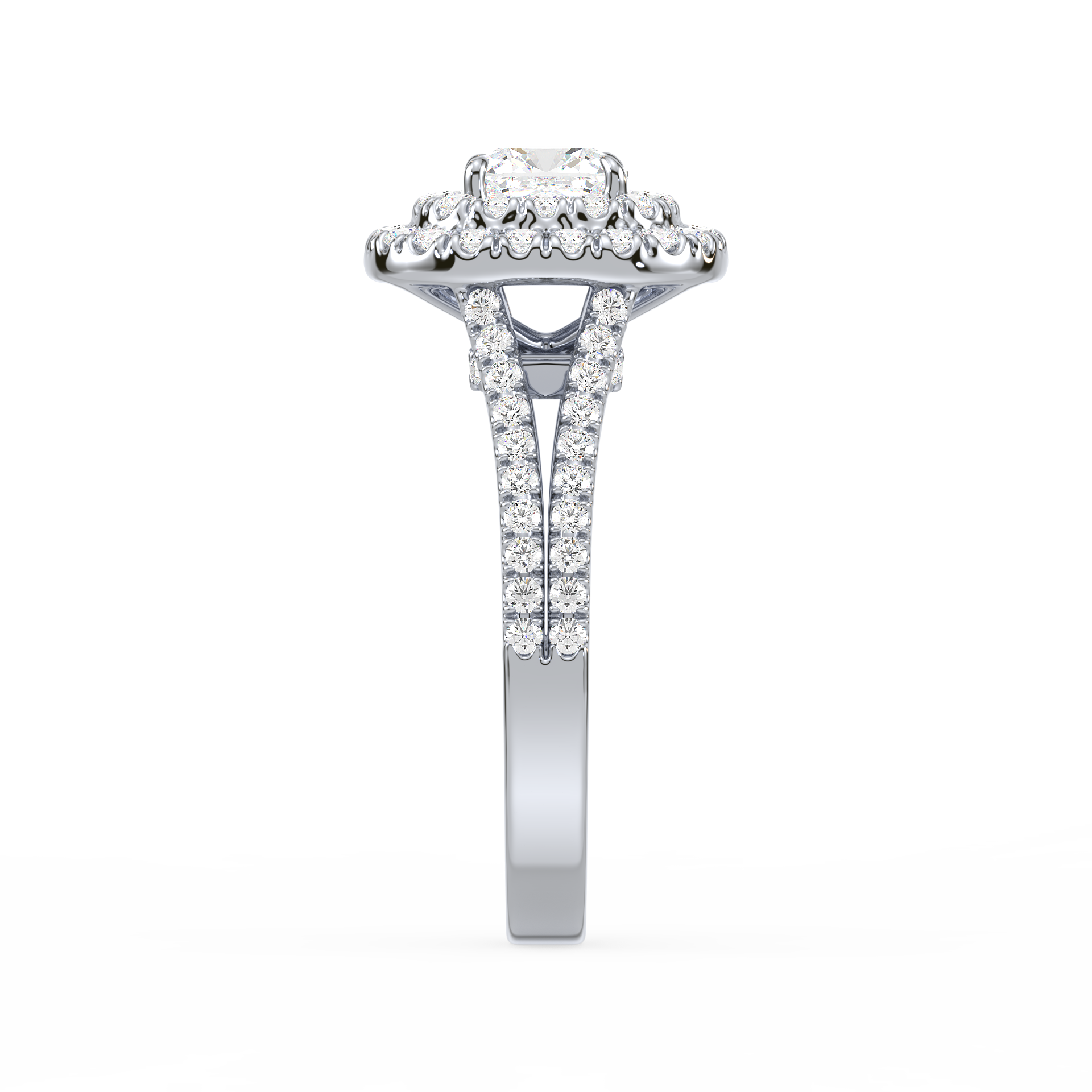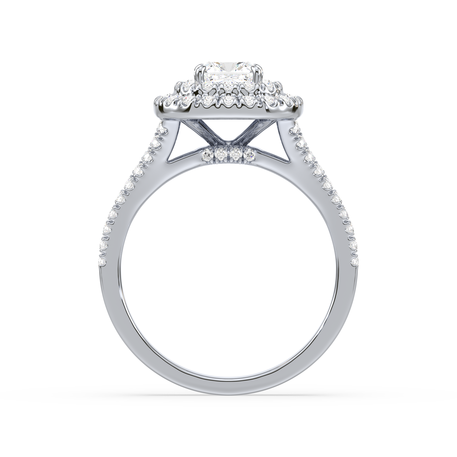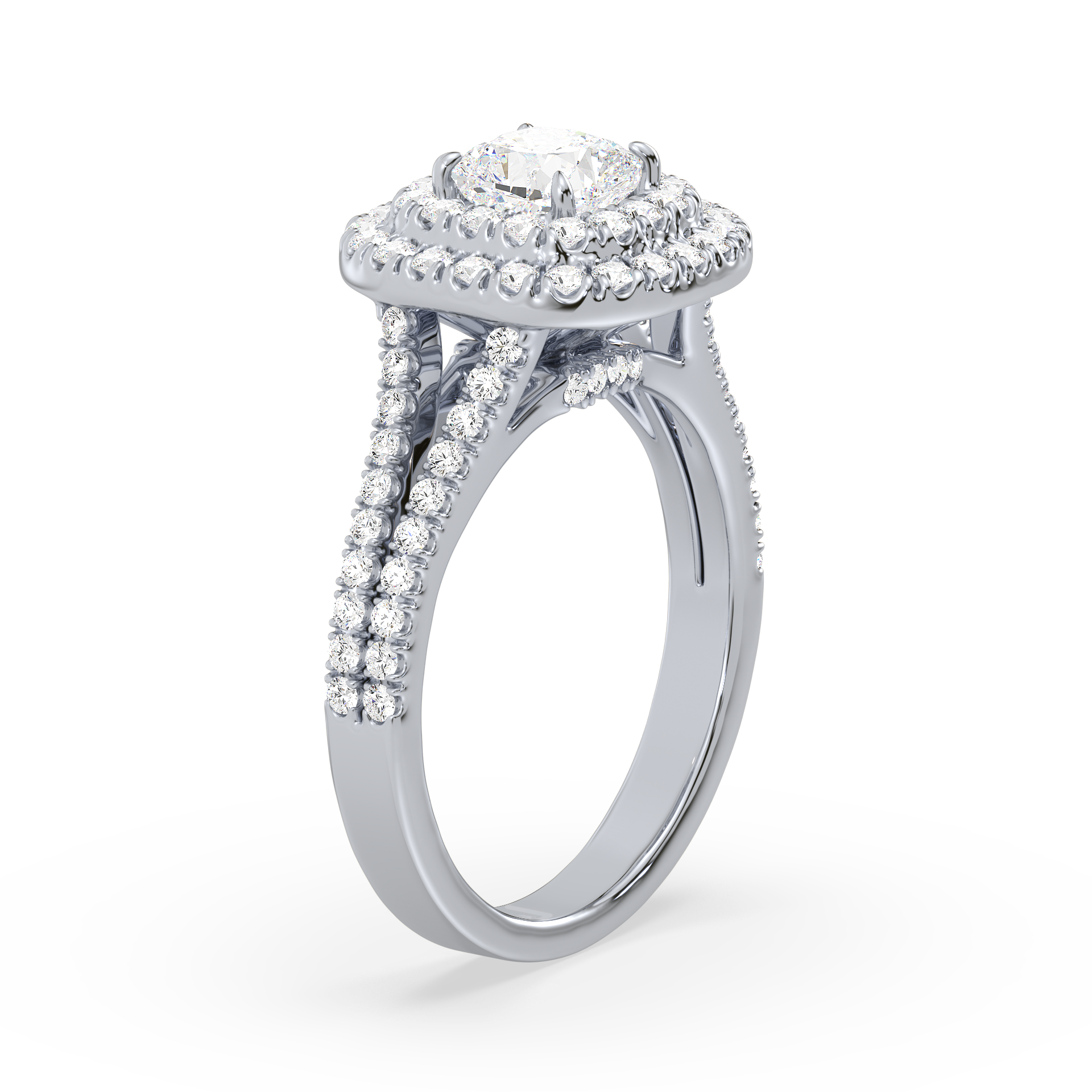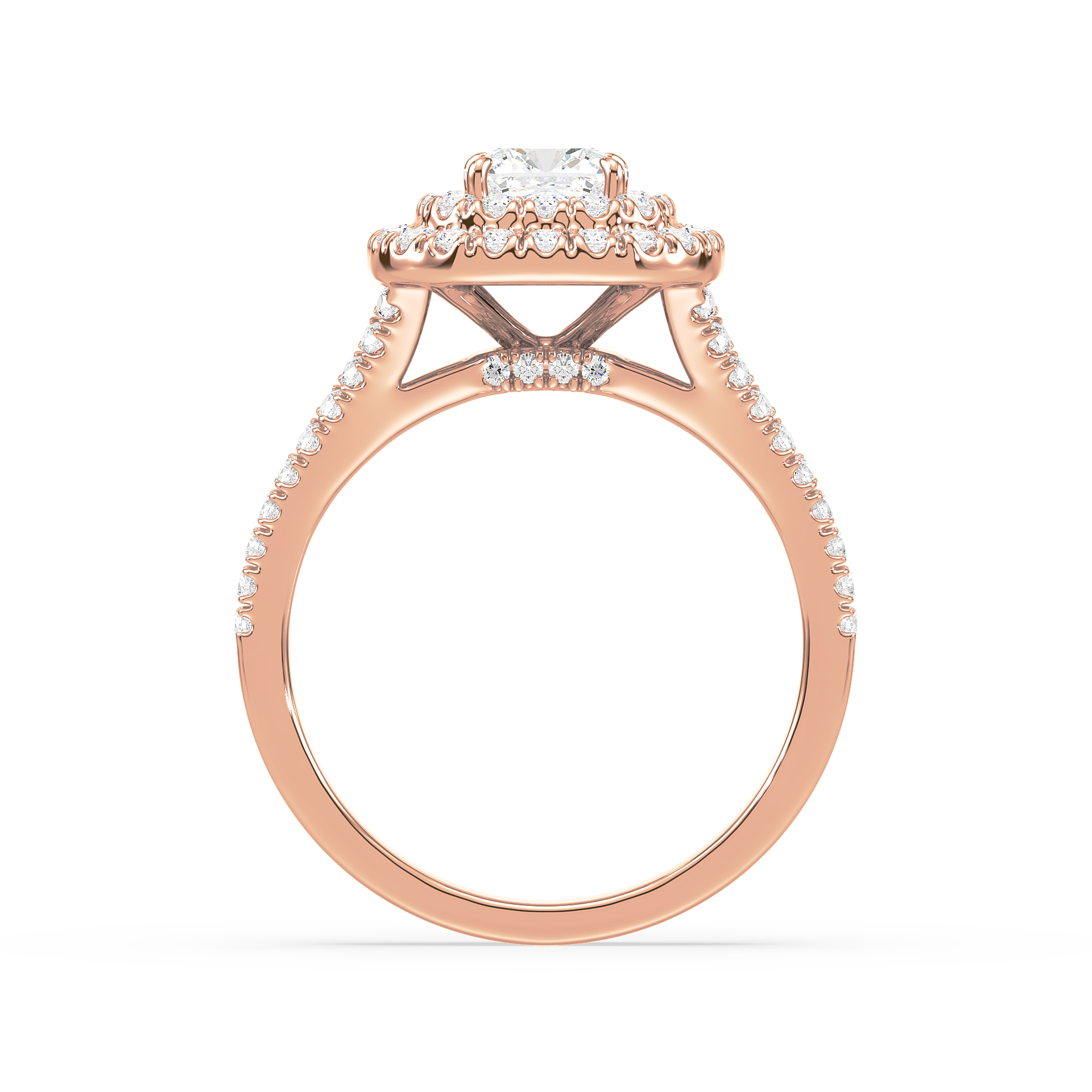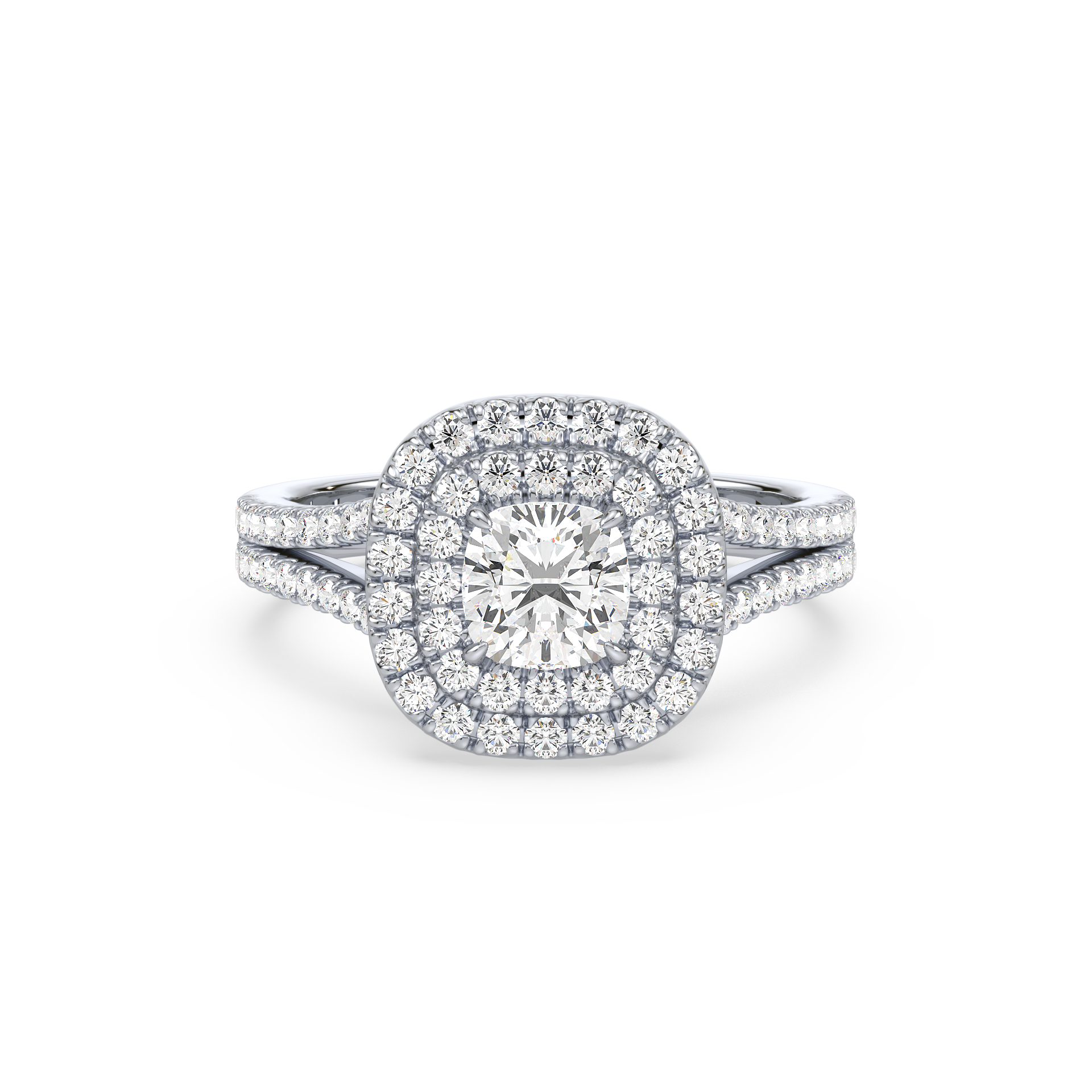 A true statement piece, the Cushion Solitaire Double Halo Shank Ring features a brilliant cushion-cut diamond encircled by two radiant halos of smaller diamonds. Set on a diamond-encrusted shank, this design offers unparalleled brilliance and luxury.