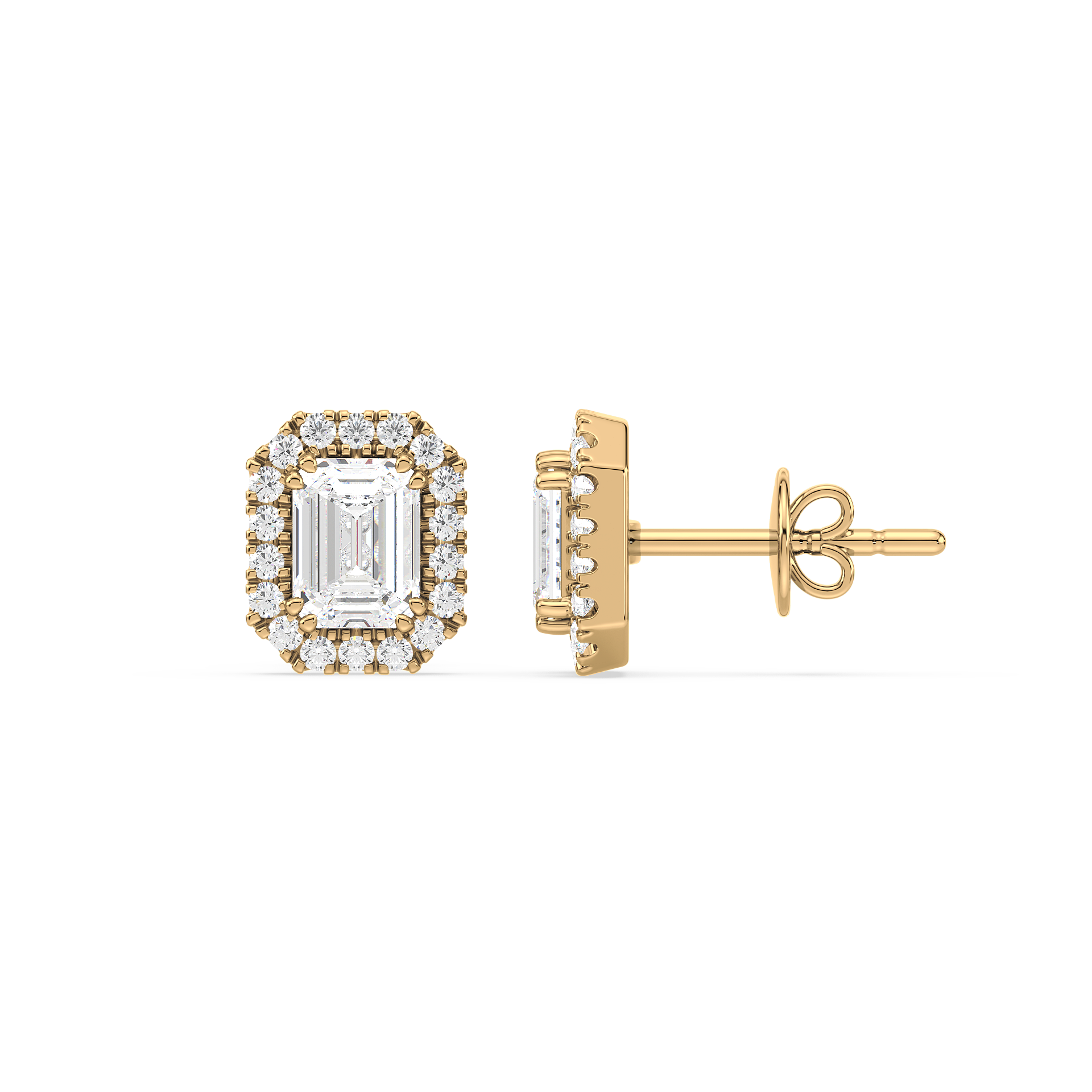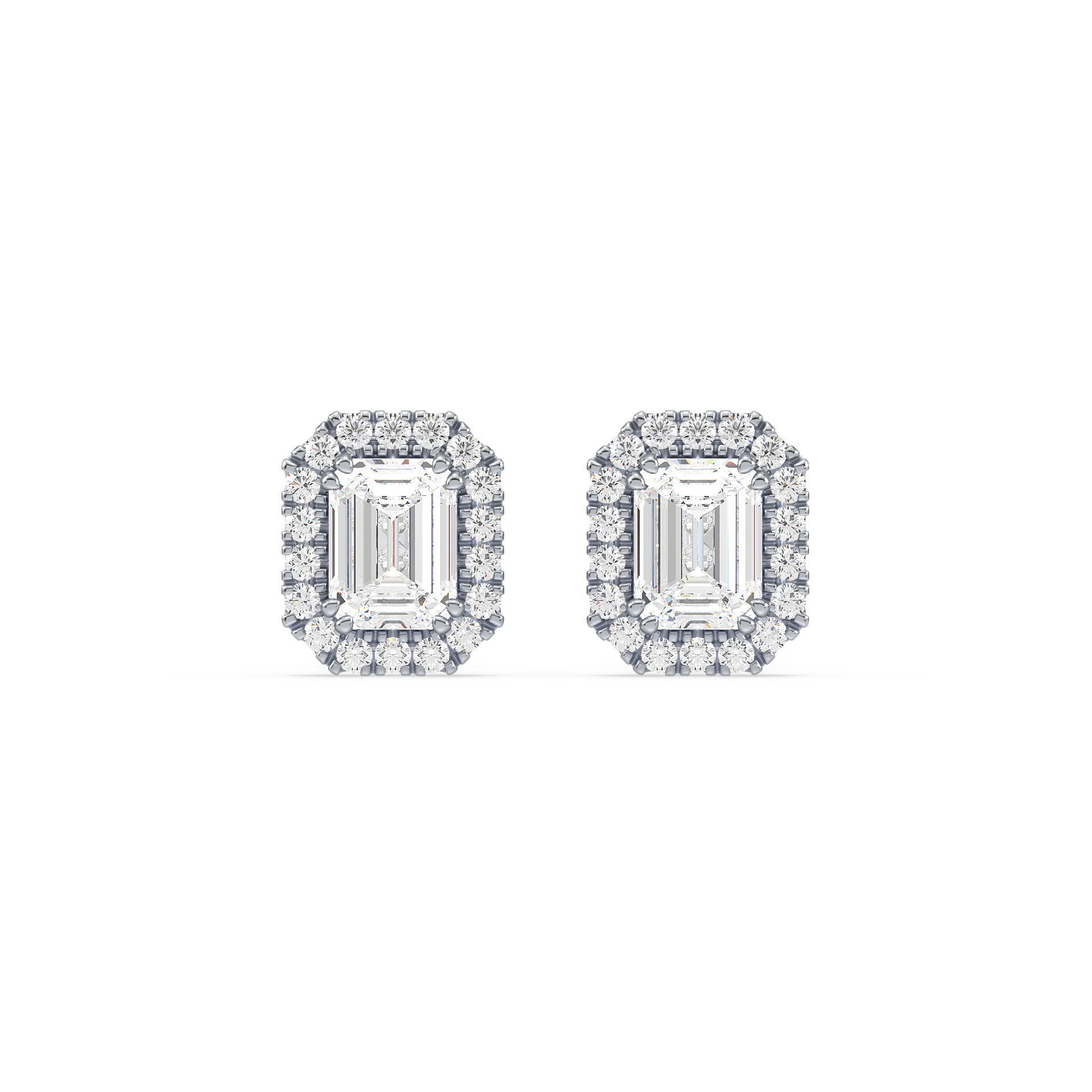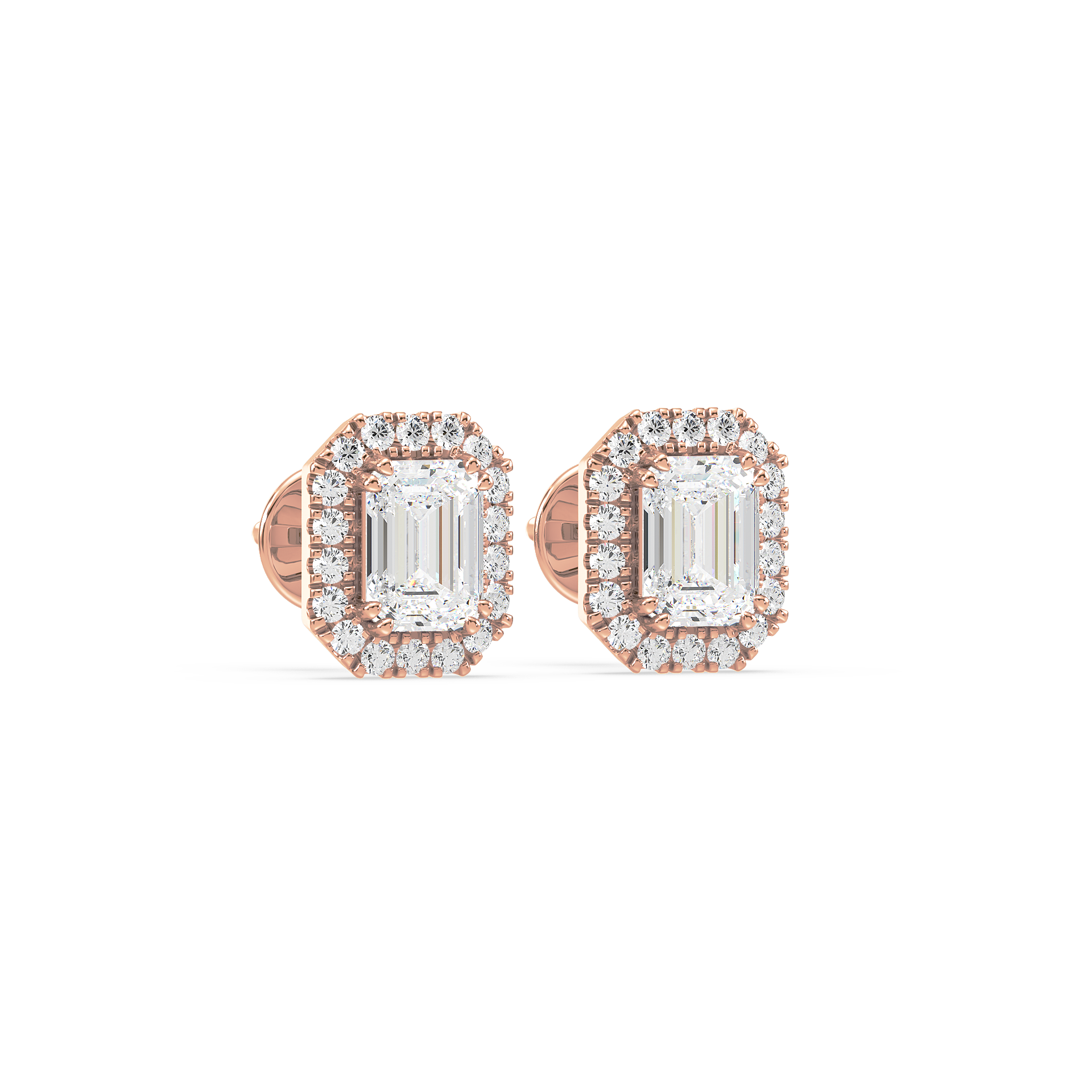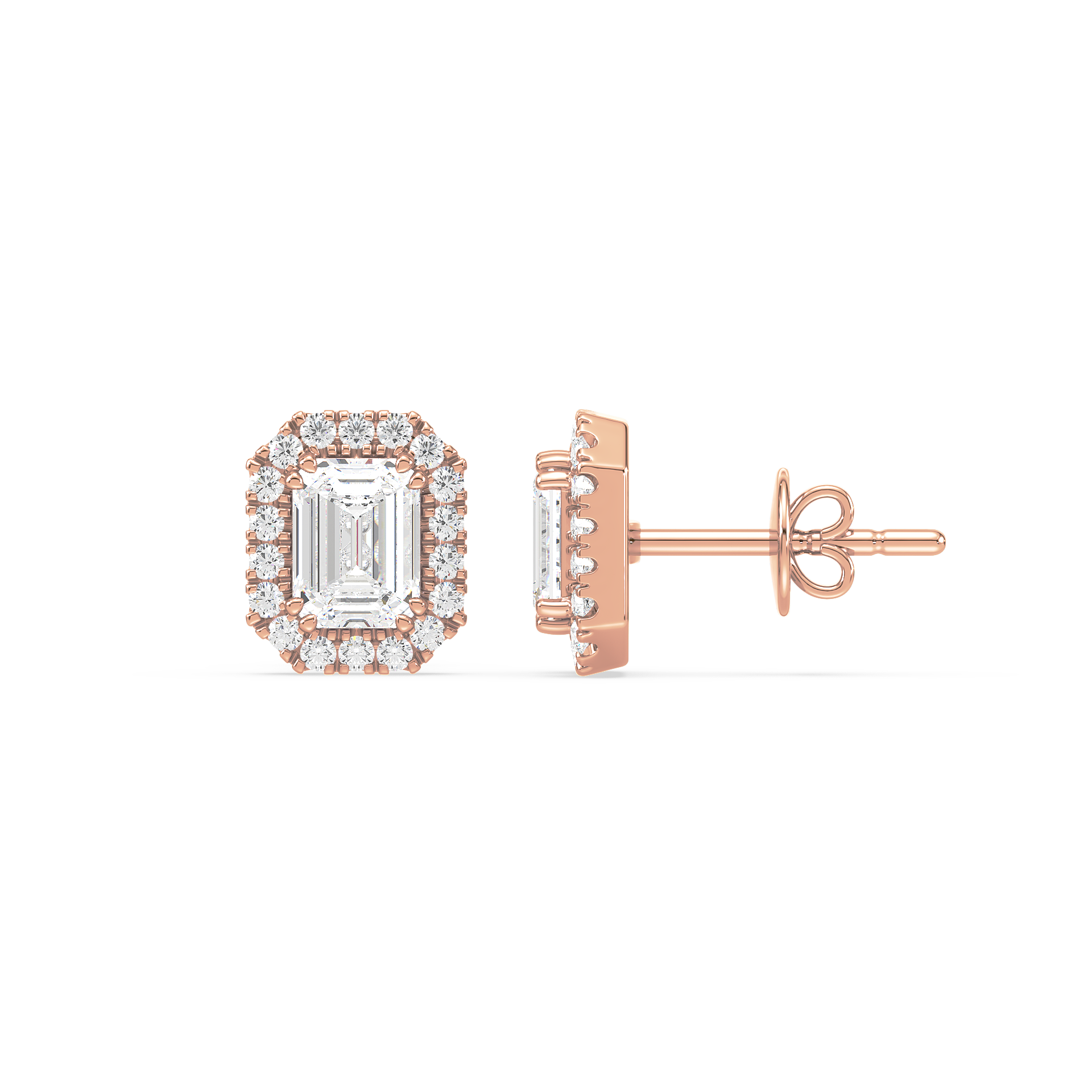 These unique stud earrings feature emerald cut diamonds, surrounded by a halo of smaller diamonds for added elegance. The sleek lines of the emerald cut paired with the radiant halo create a sophisticated and striking look.