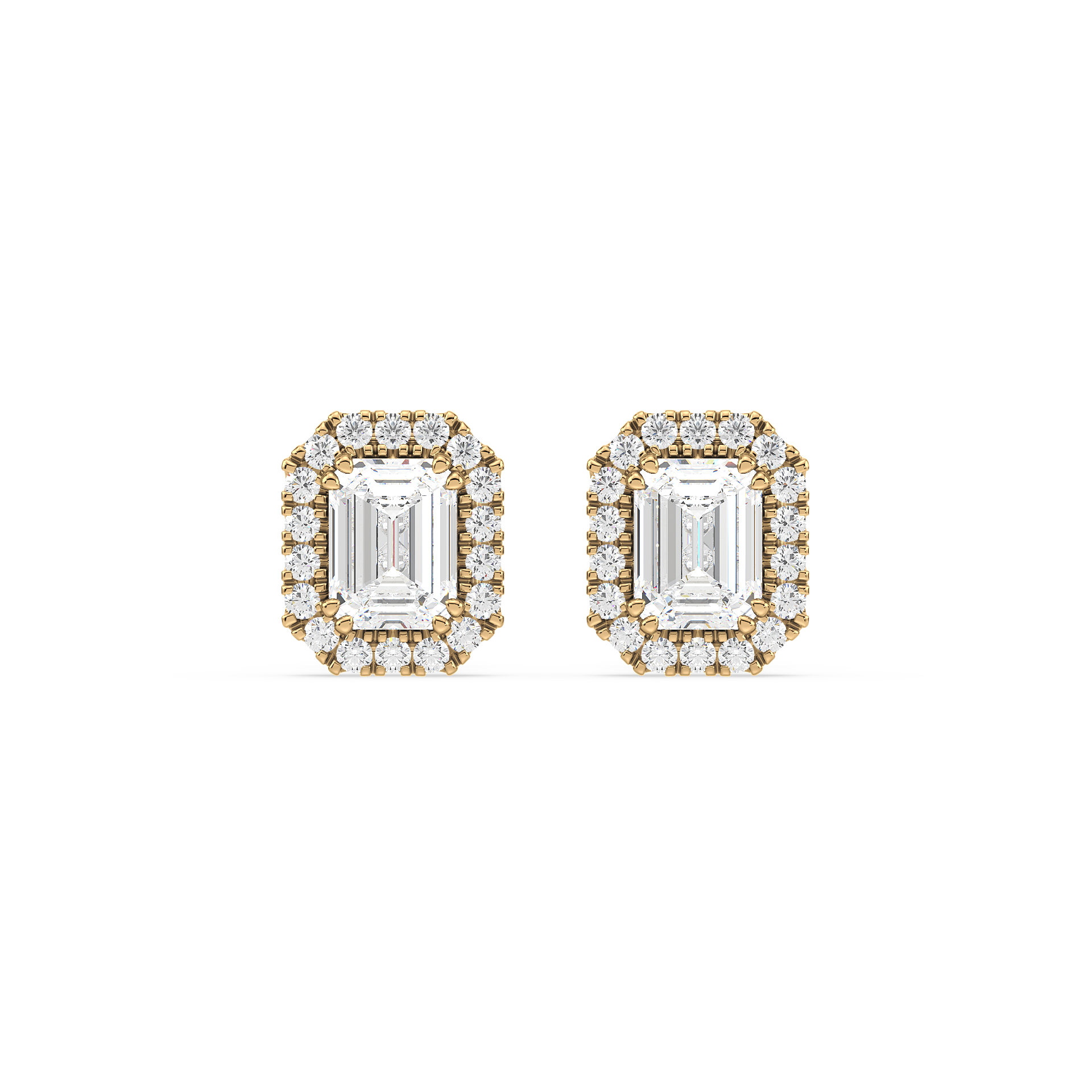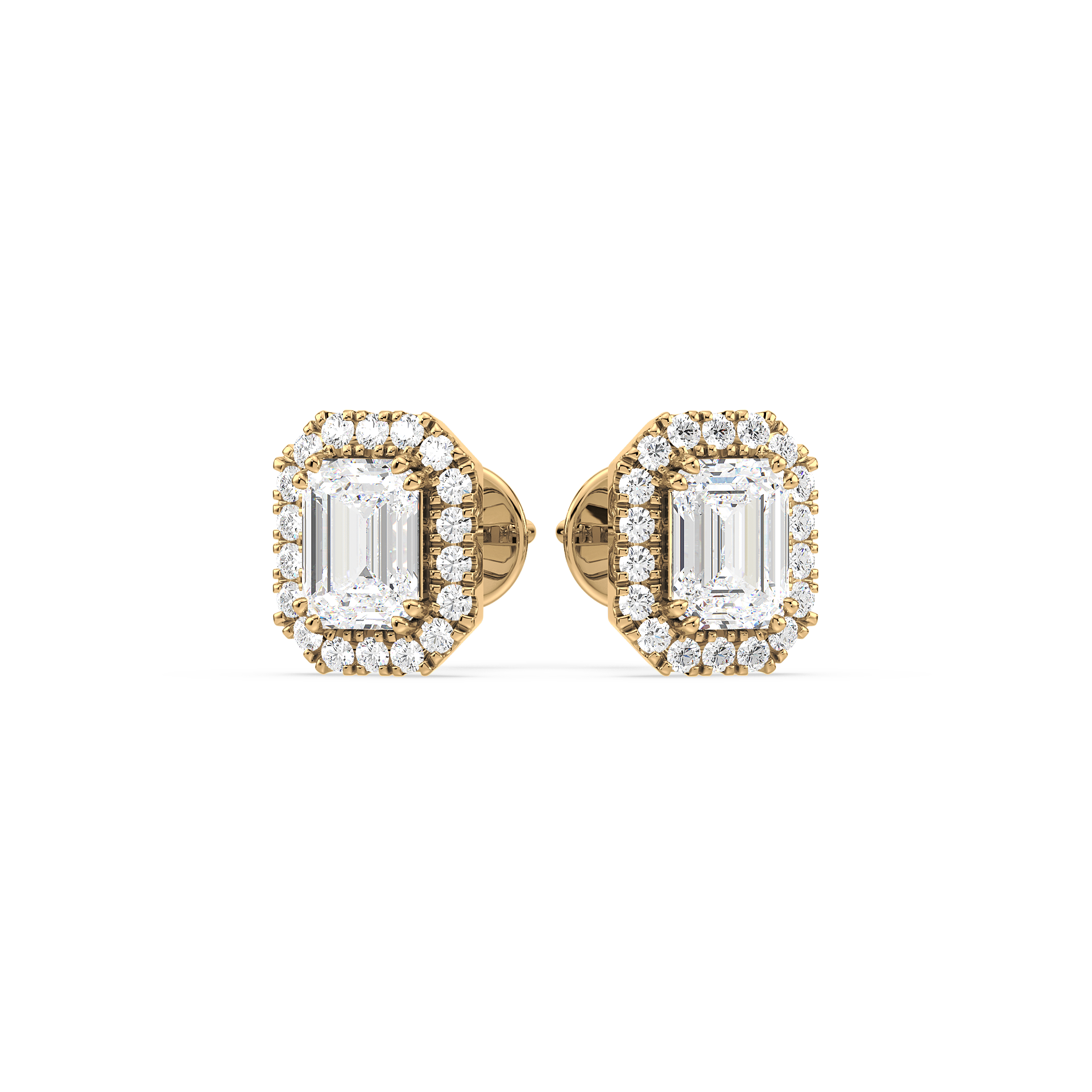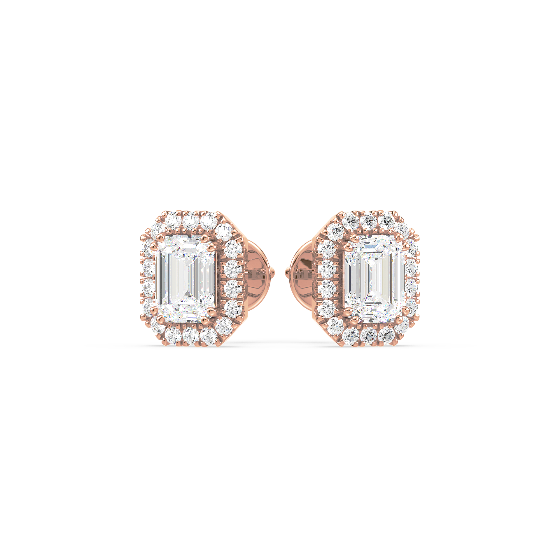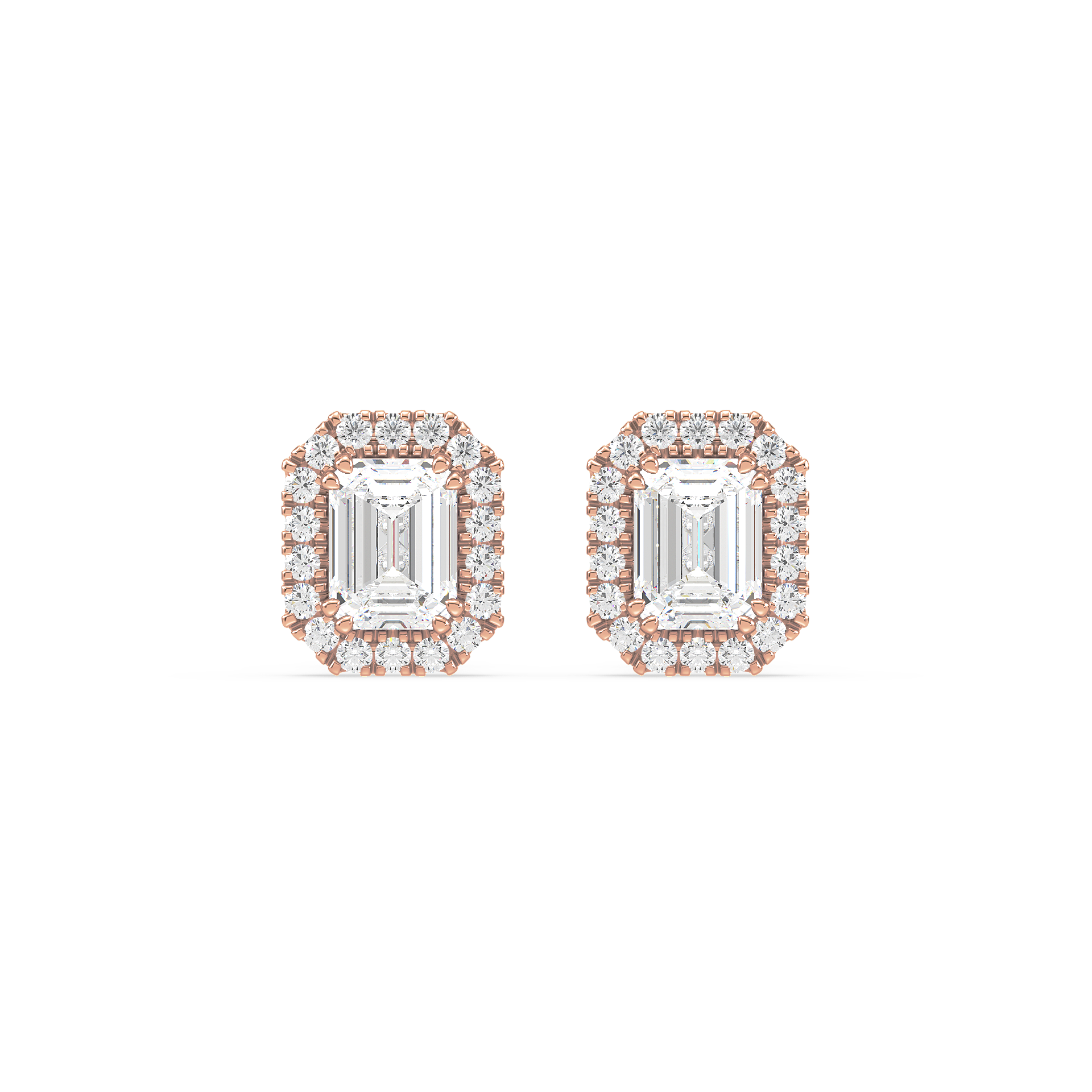 These unique stud earrings feature emerald cut diamonds, surrounded by a halo of smaller diamonds for added elegance. The sleek lines of the emerald cut paired with the radiant halo create a sophisticated and striking look.