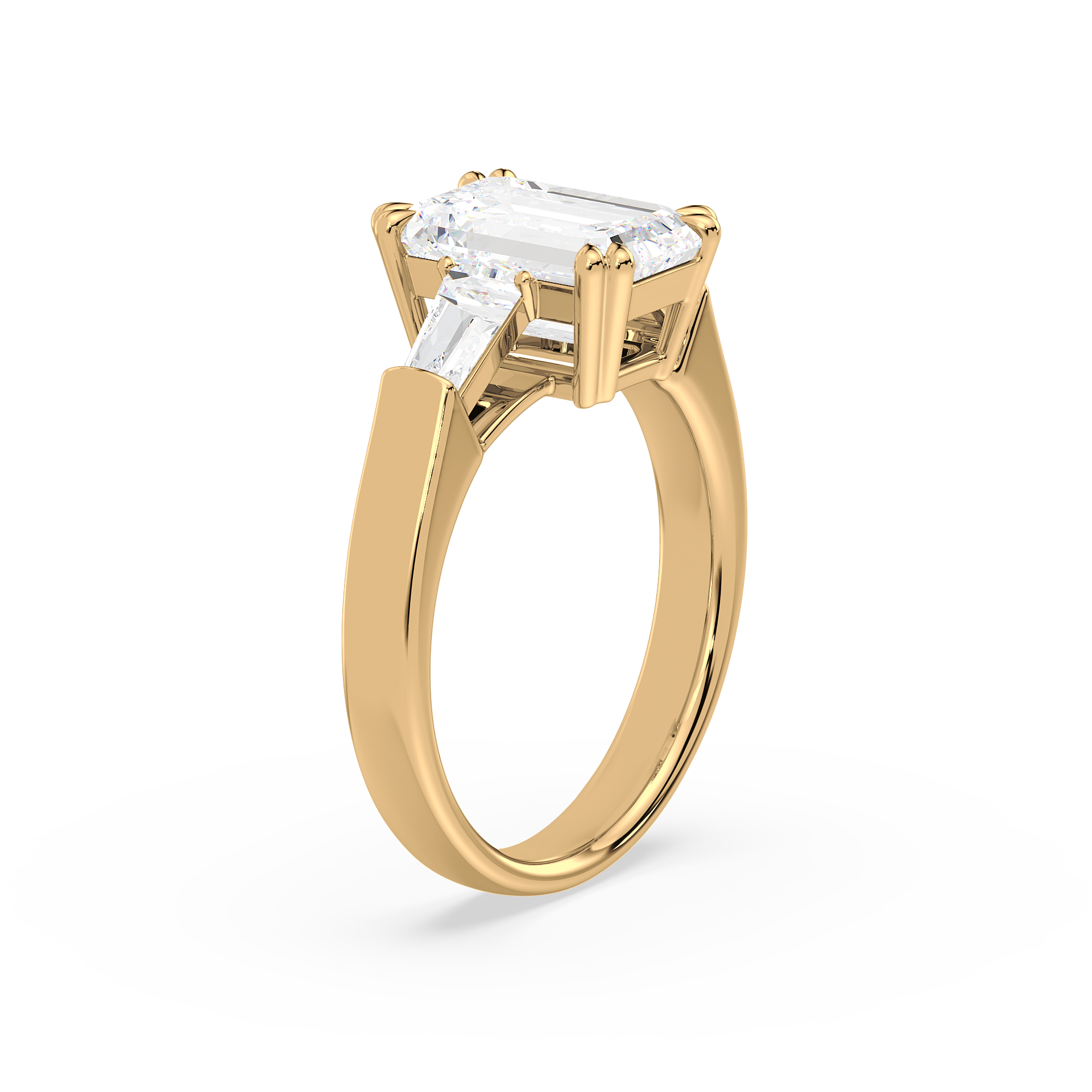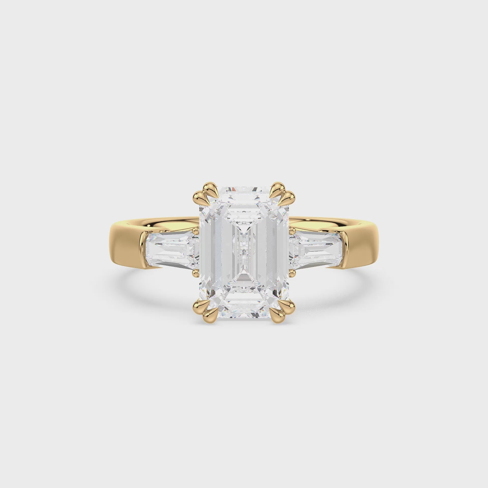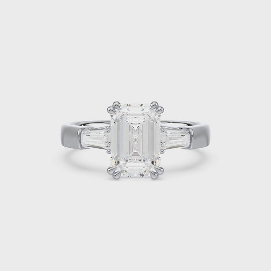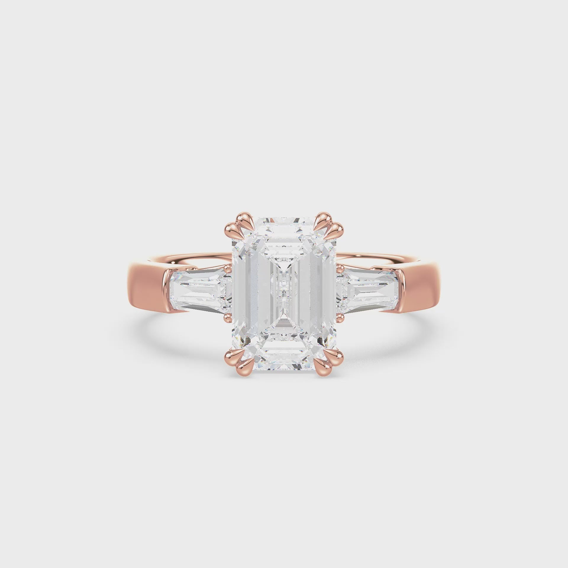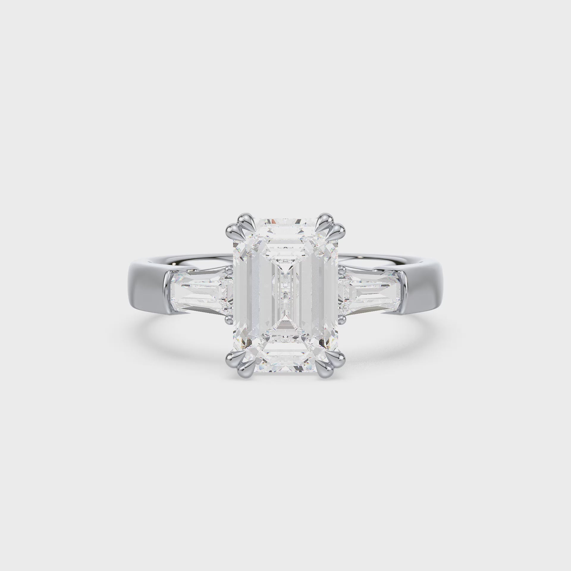 This Three Stone Wall Setting Ring features an elegant emerald cut centre stone, flanked by two kite shaped diamonds. The unique setting offers a modern, architectural aesthetic, while the combination of cuts adds depth and intrigue to this sophisticated design.