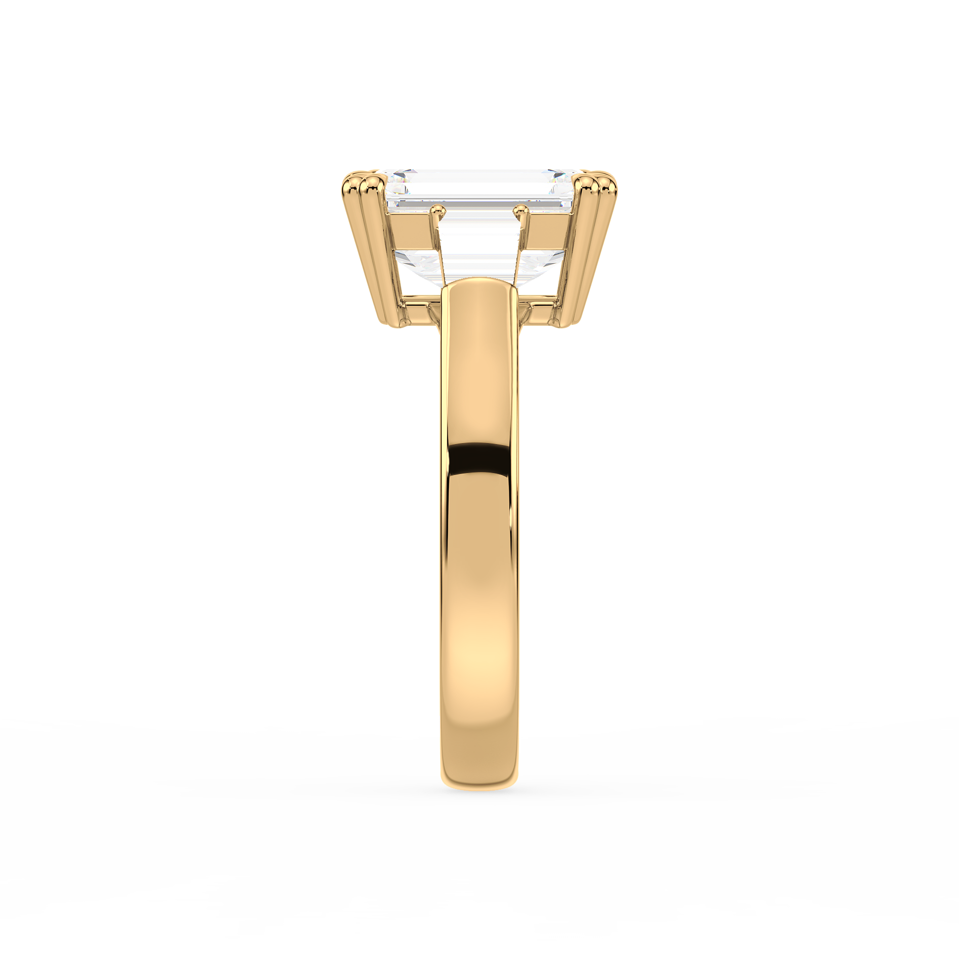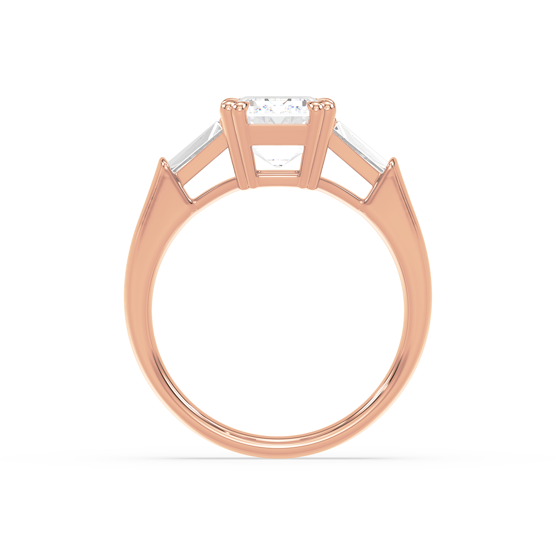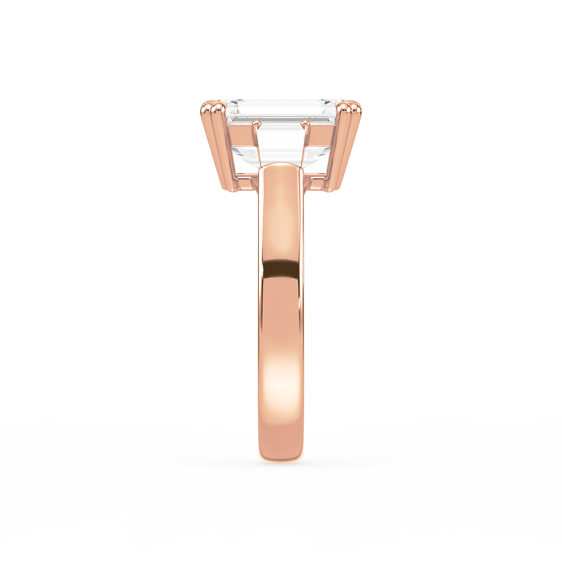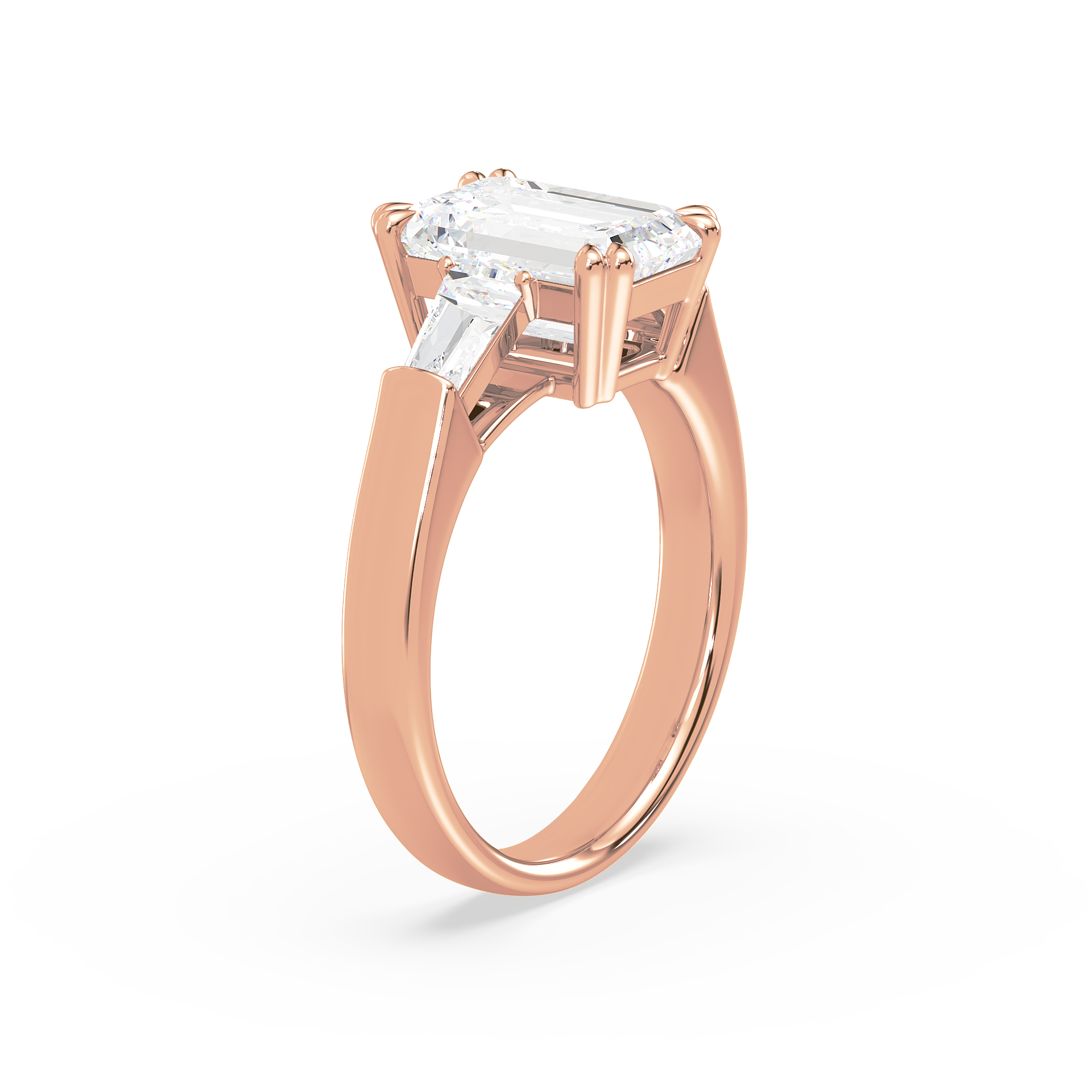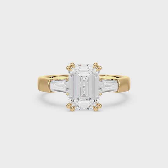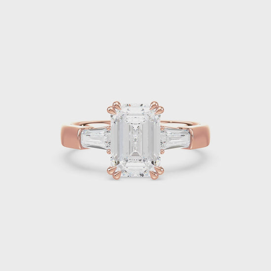 This Three Stone Wall Setting Ring features an elegant emerald cut centre stone, flanked by two kite shaped diamonds. The unique setting offers a modern, architectural aesthetic, while the combination of cuts adds depth and intrigue to this sophisticated design.