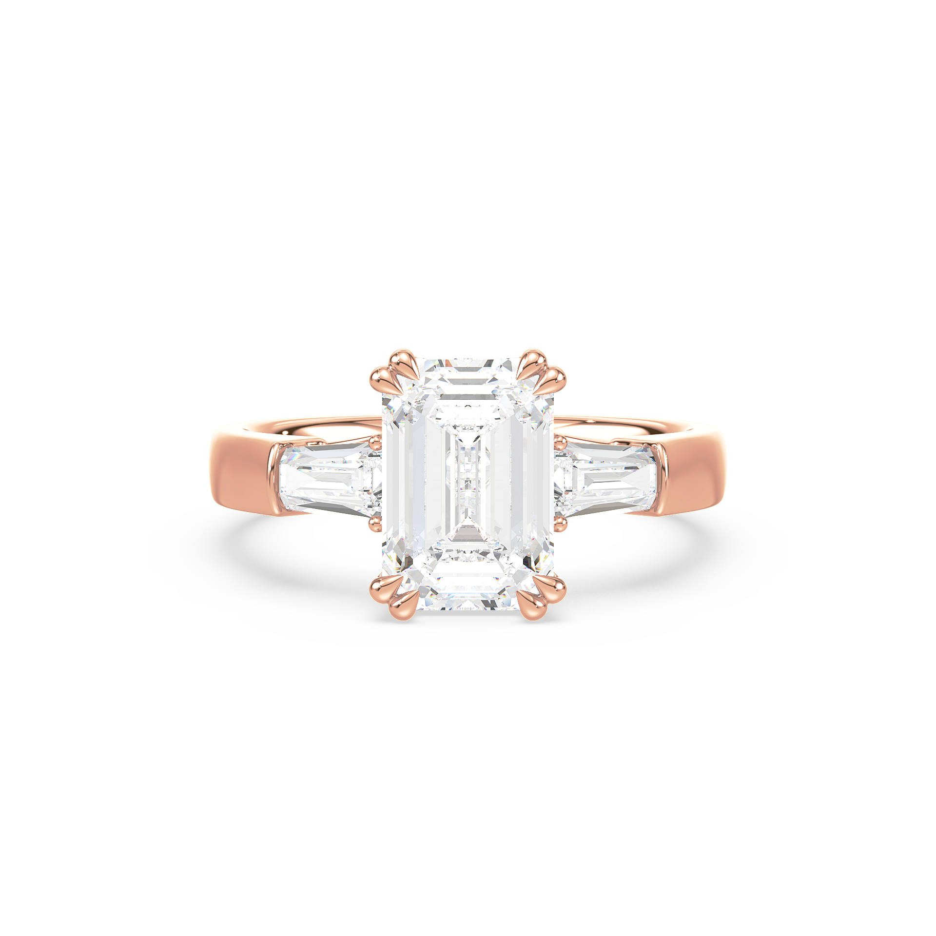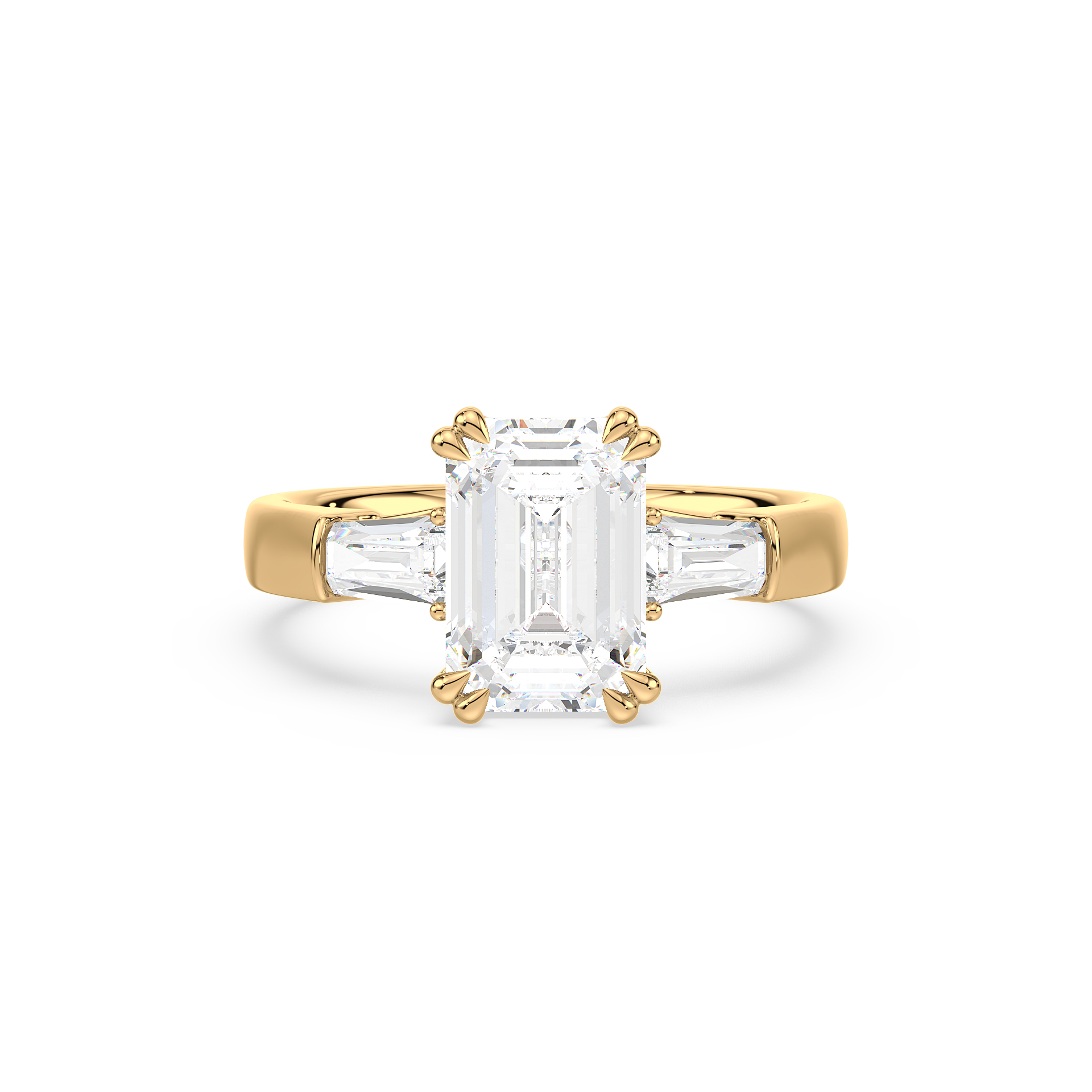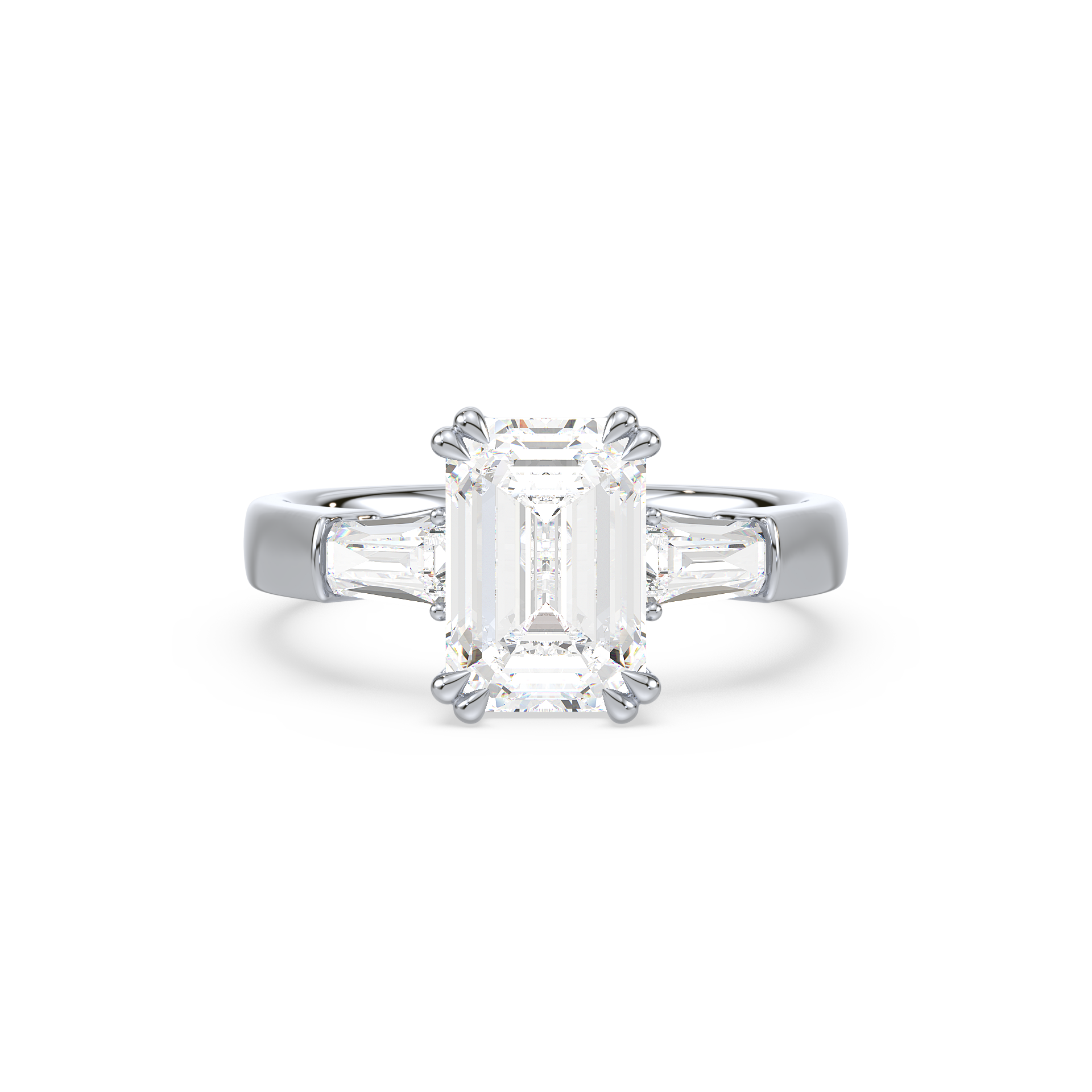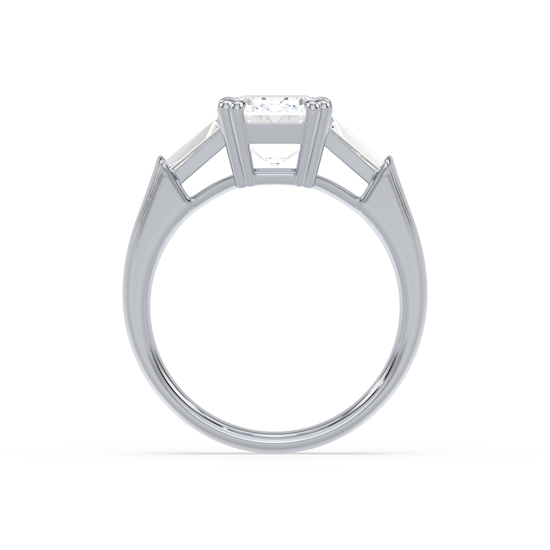 This Three Stone Wall Setting Ring features an elegant emerald cut centre stone, flanked by two kite shaped diamonds. The unique setting offers a modern, architectural aesthetic, while the combination of cuts adds depth and intrigue to this sophisticated design.