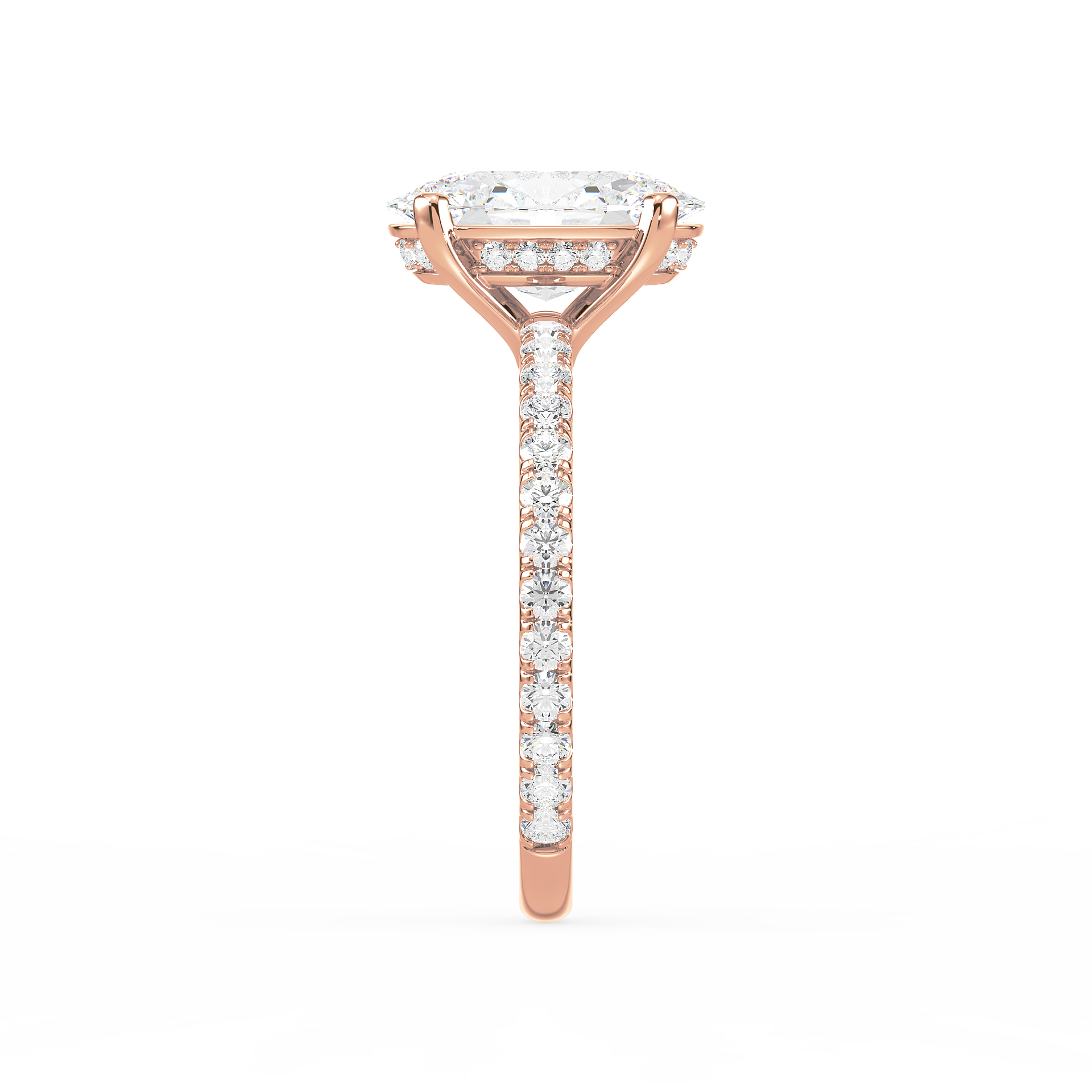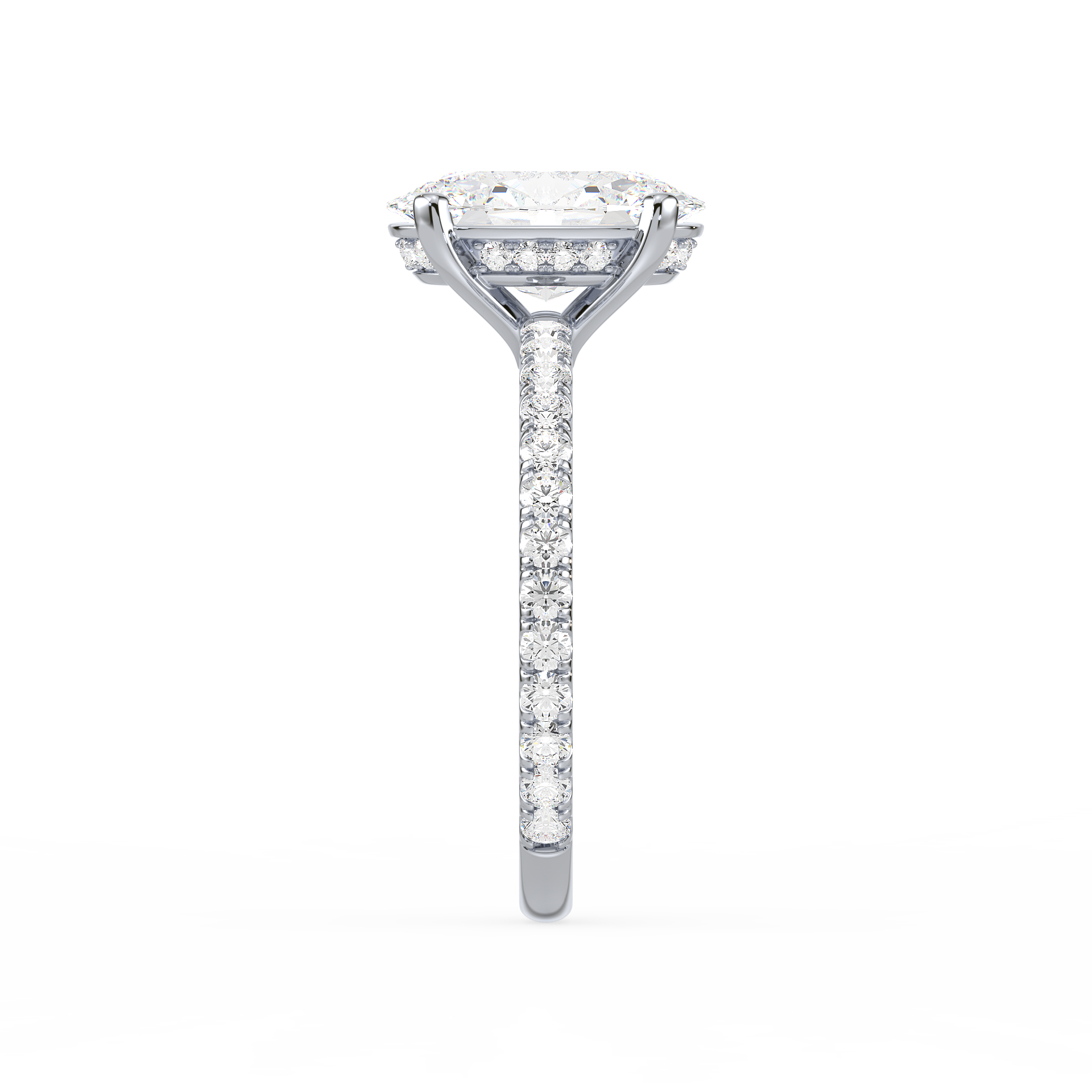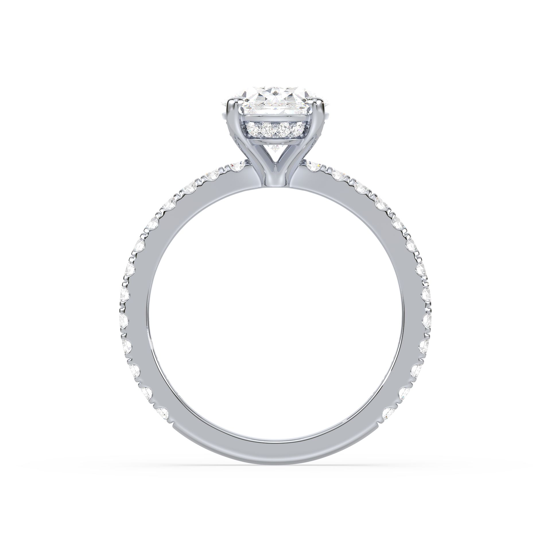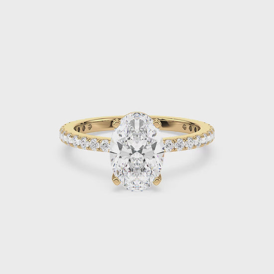 The Hidden Halo Oval Radiance ring is a unique piece, featuring an oval diamond at its core with a hidden halo that adds extra sparkle from the side. A stunning design that remains understated from the top.