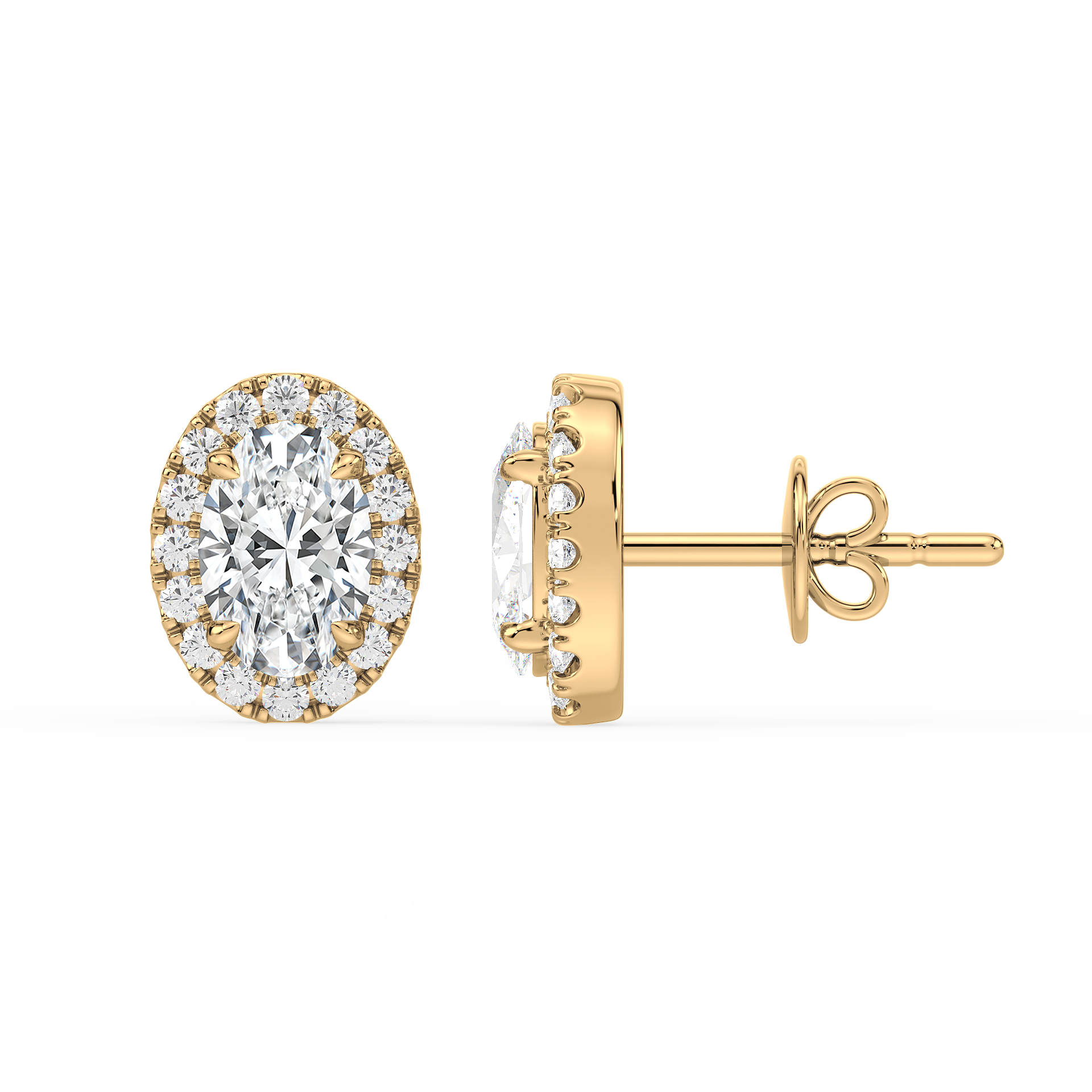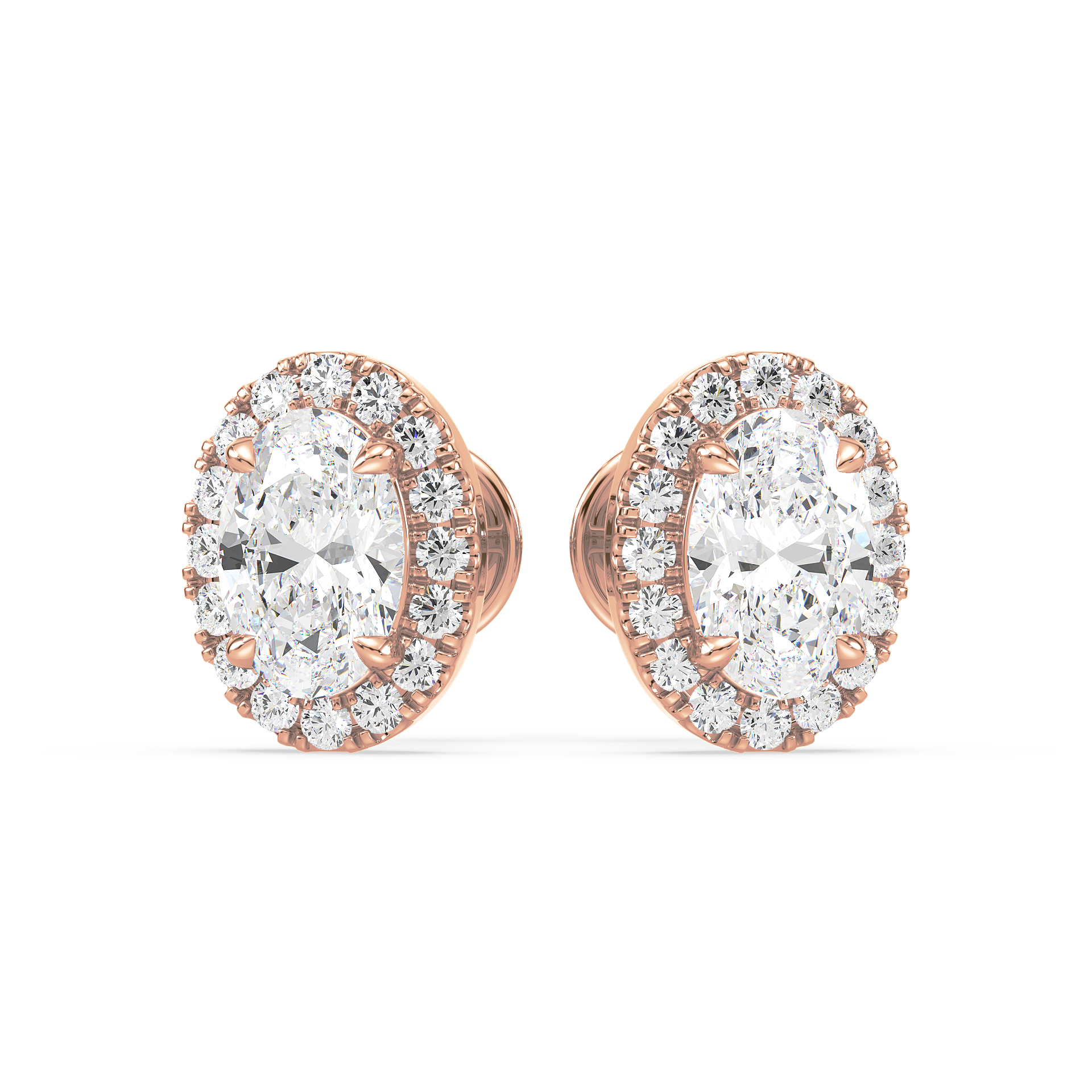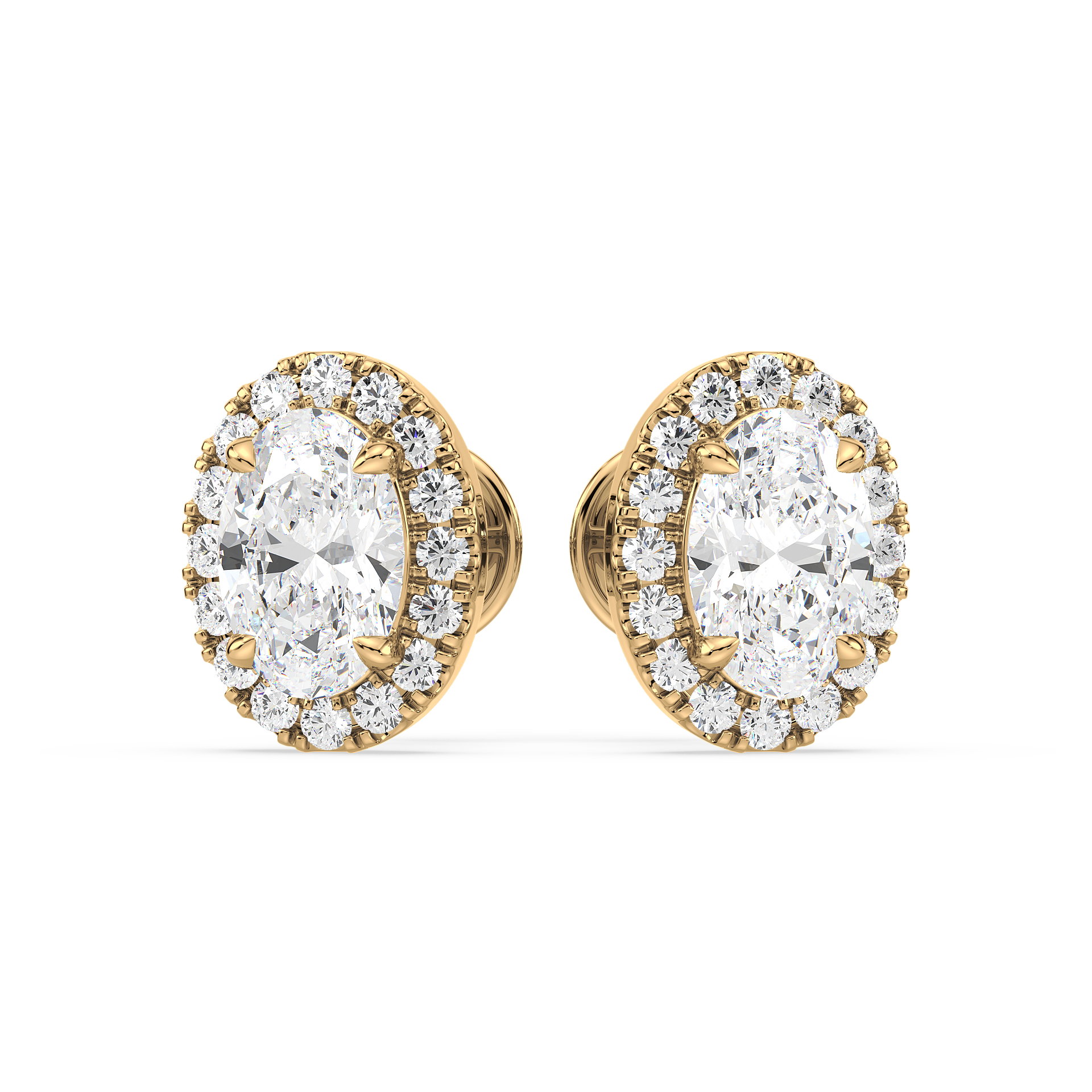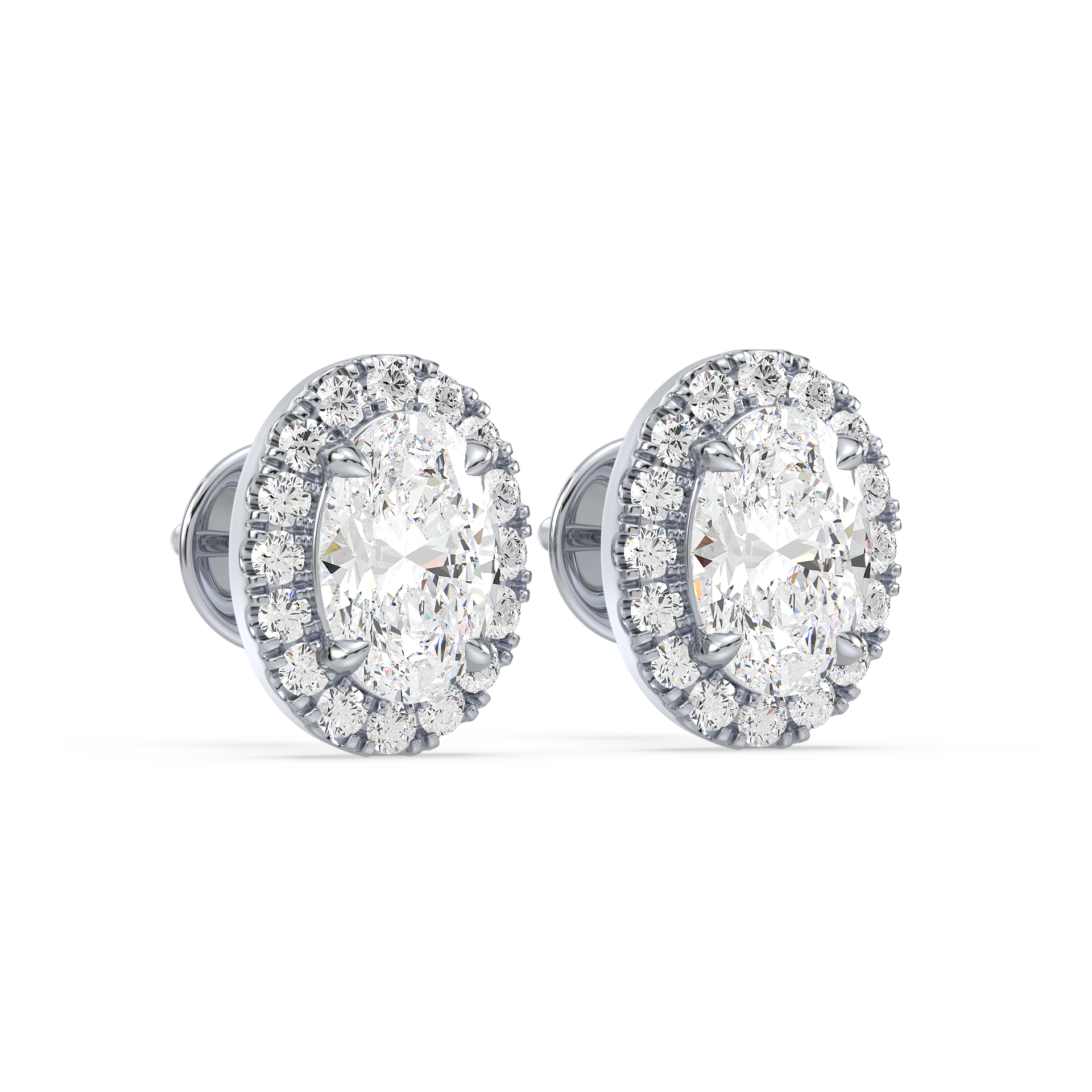 These oval cut diamond studs are encircled by a sparkling halo of smaller diamonds, amplifying their brilliance and creating a flattering, elongated shape. A modern take on a classic design, these studs are perfect for adding a bit of luxury to your everyday look.