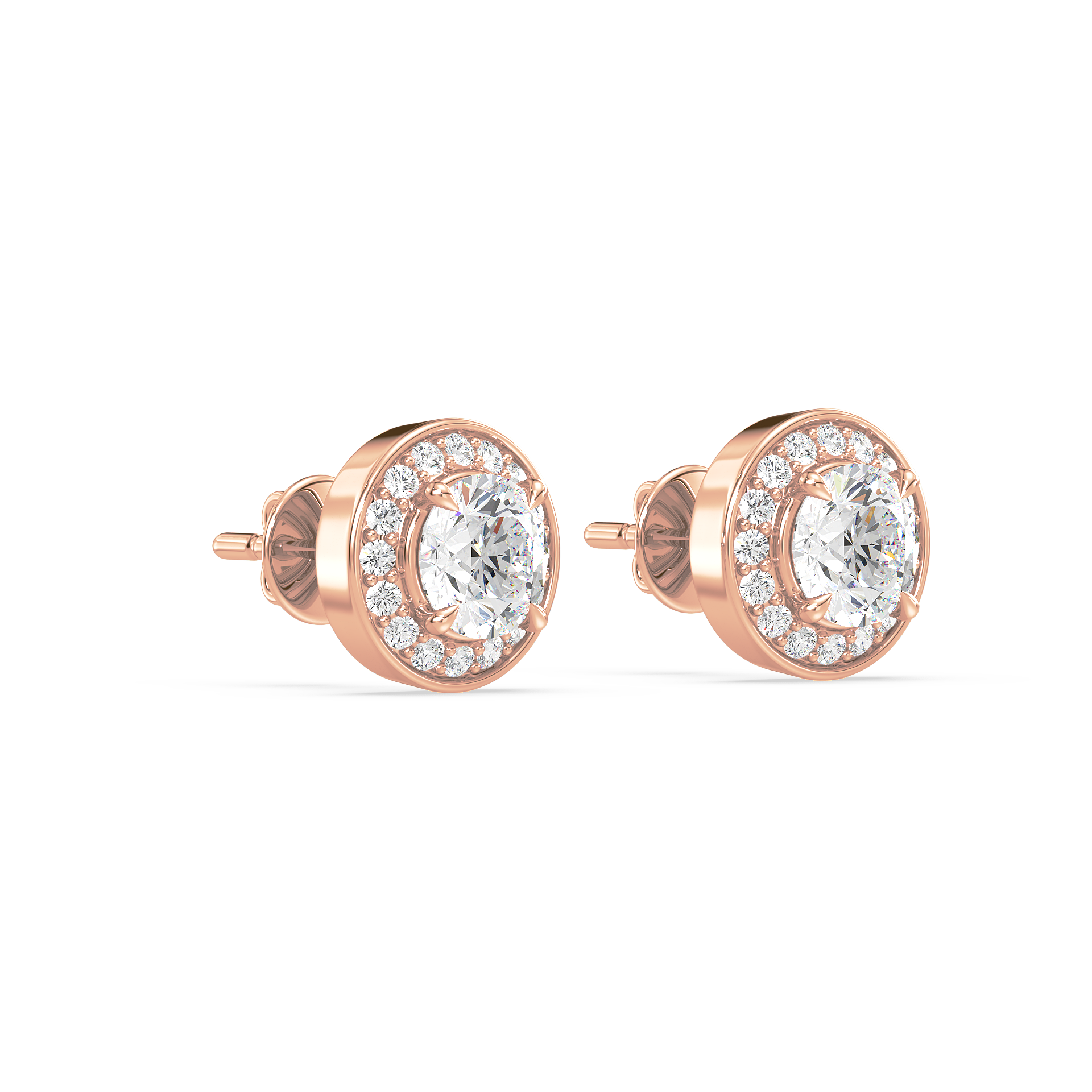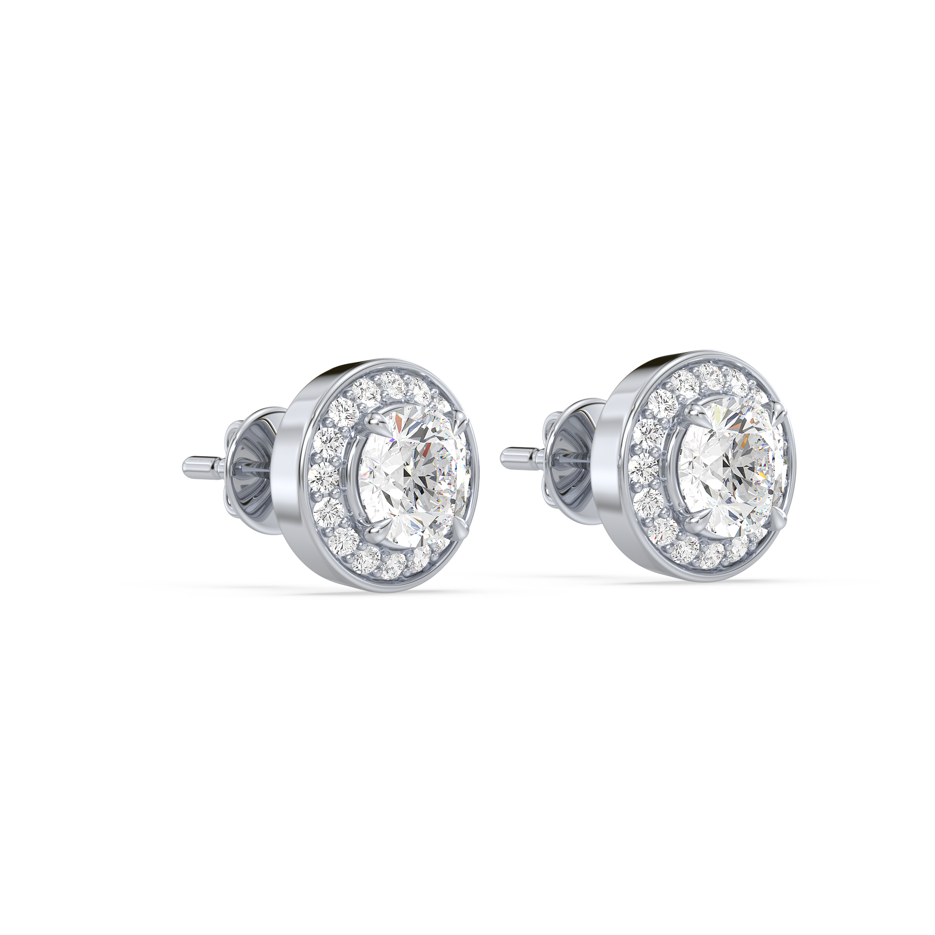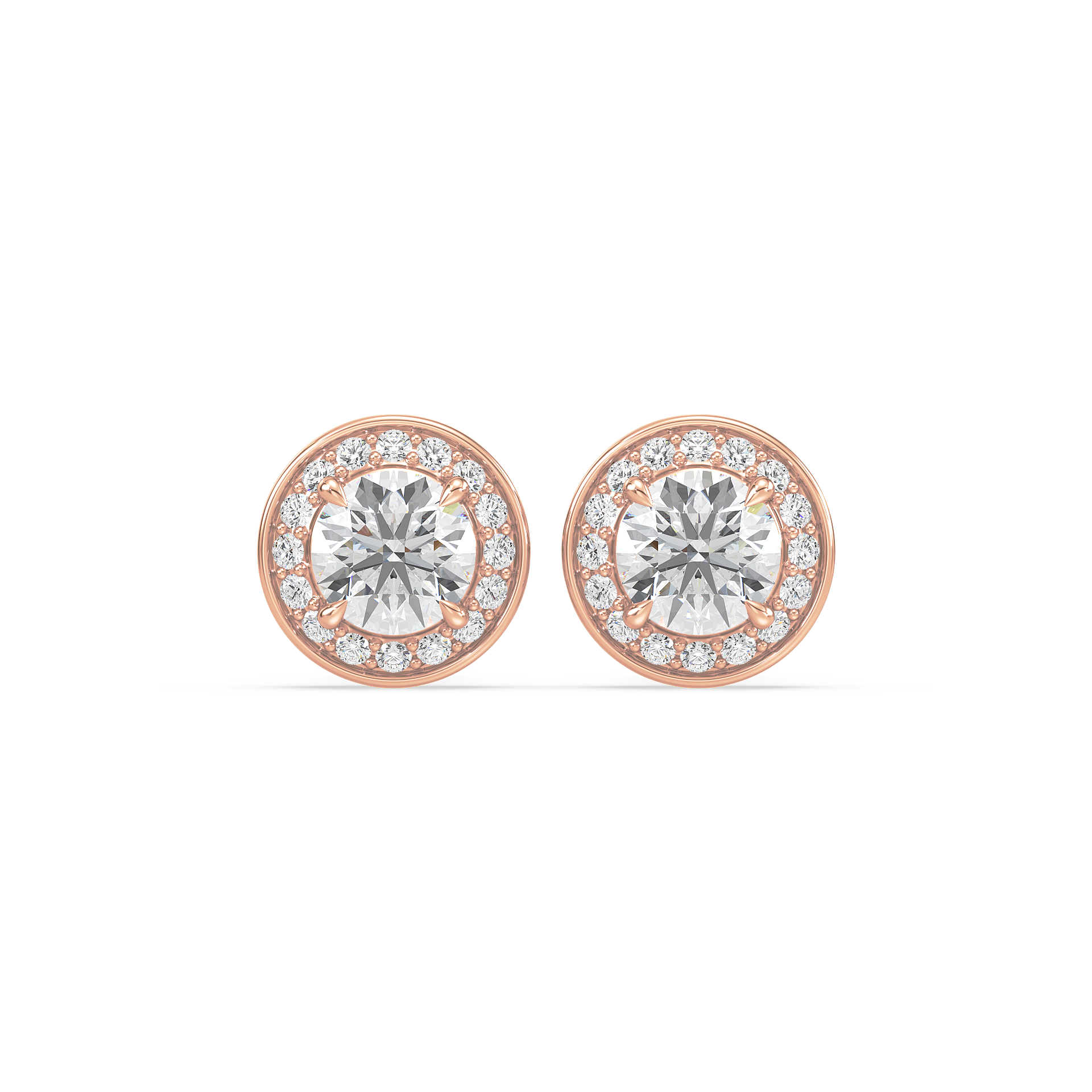 These striking stud earrings feature round diamonds in a classic solitaire halo setting, enhanced by a pavé diamond band for added brilliance. The pavé band provides an extra layer of sparkle, making these studs a glamorous and sophisticated choice for any occasion.
