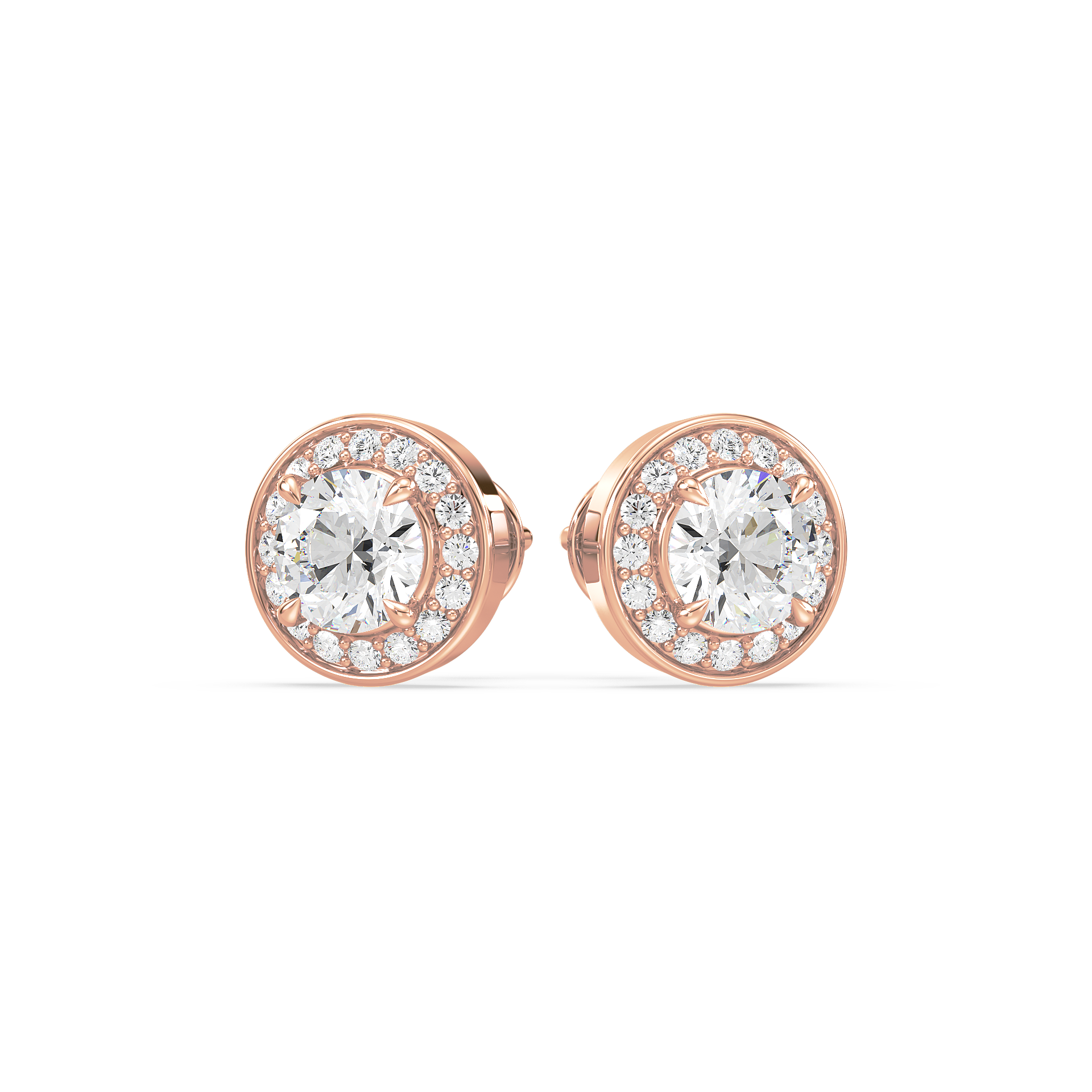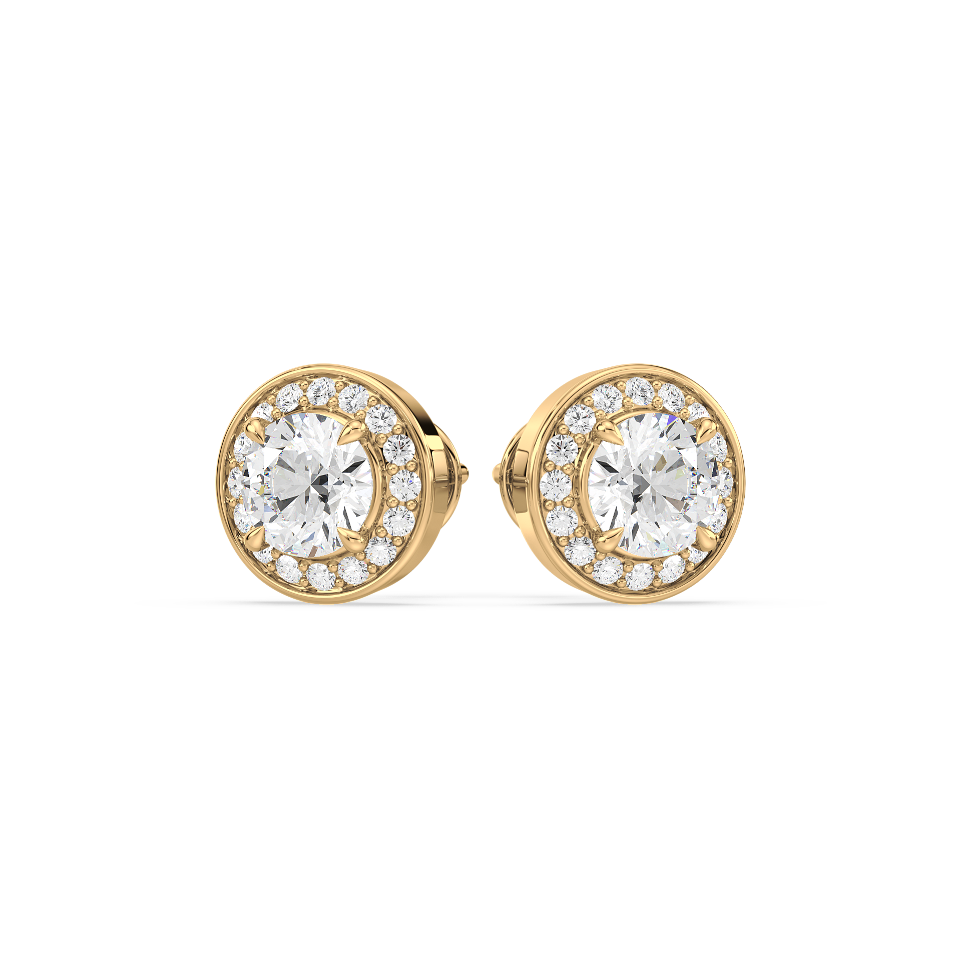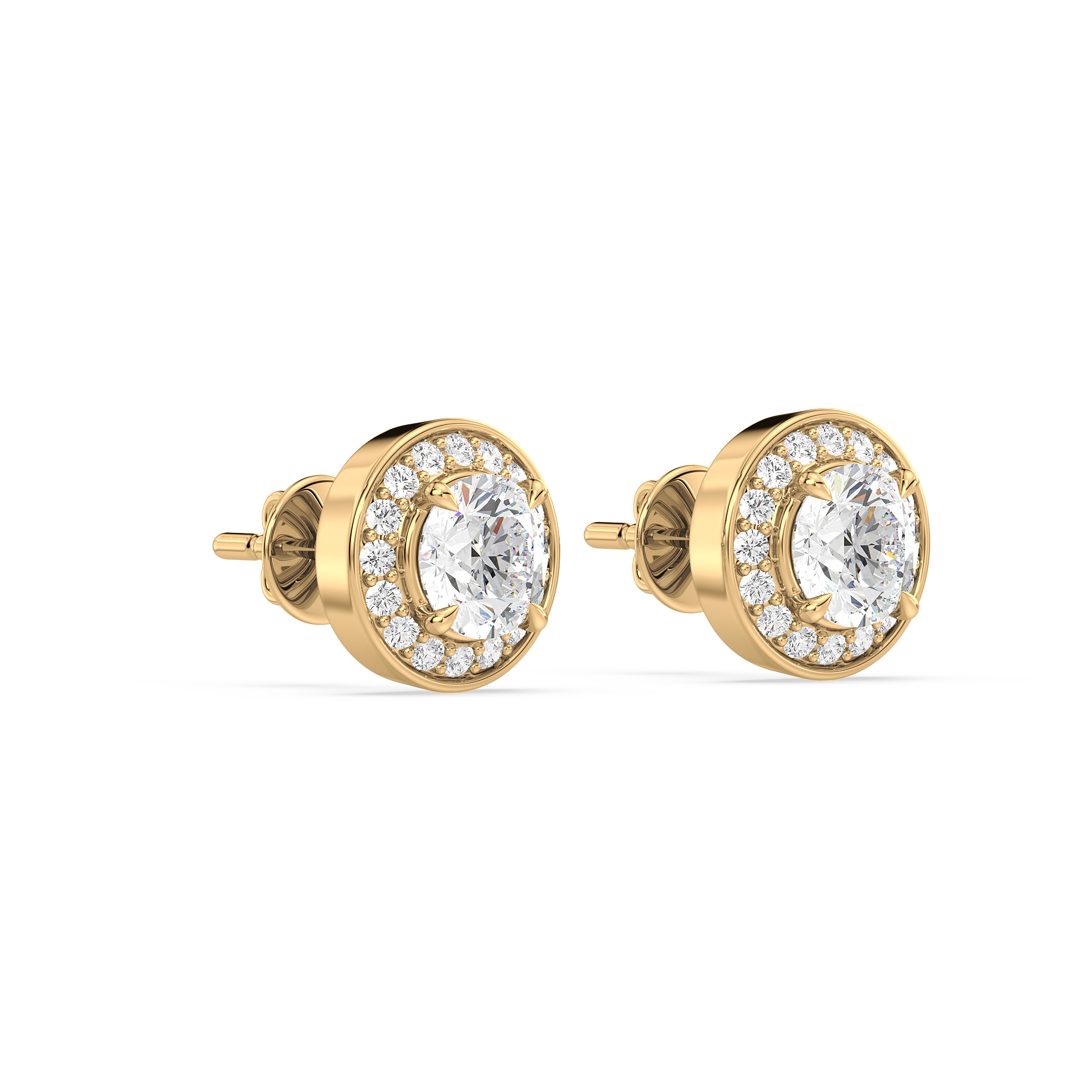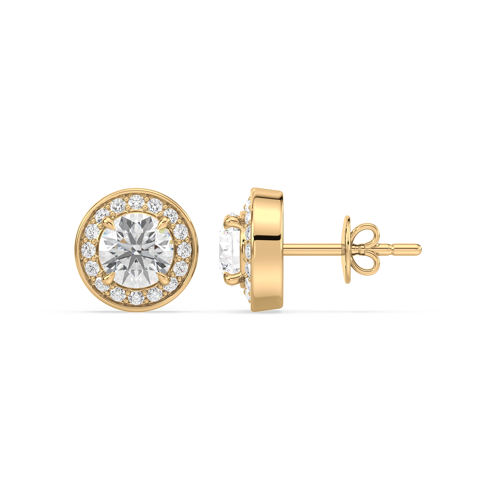 These striking stud earrings feature round diamonds in a classic solitaire halo setting, enhanced by a pavé diamond band for added brilliance. The pavé band provides an extra layer of sparkle, making these studs a glamorous and sophisticated choice for any occasion.
