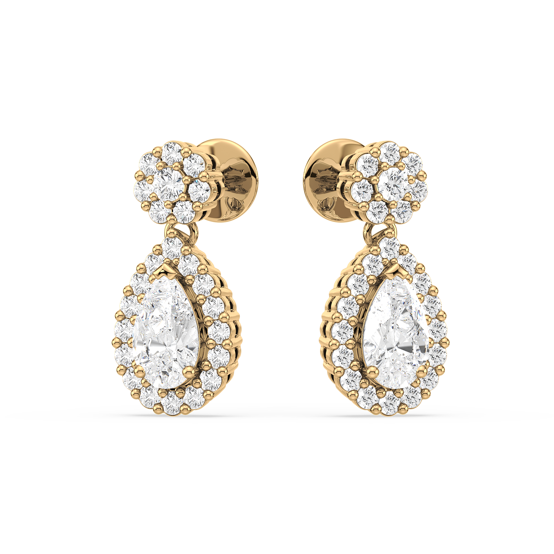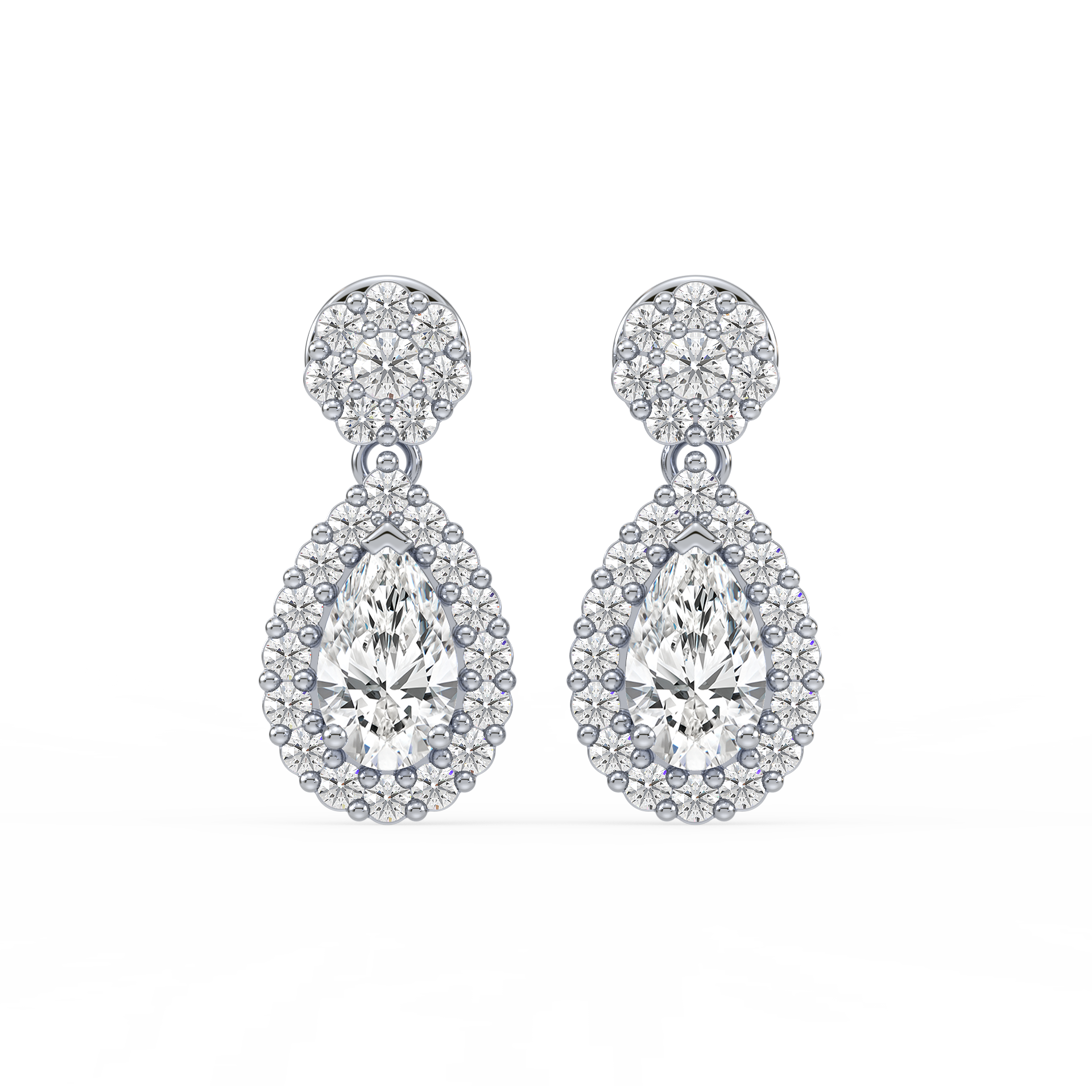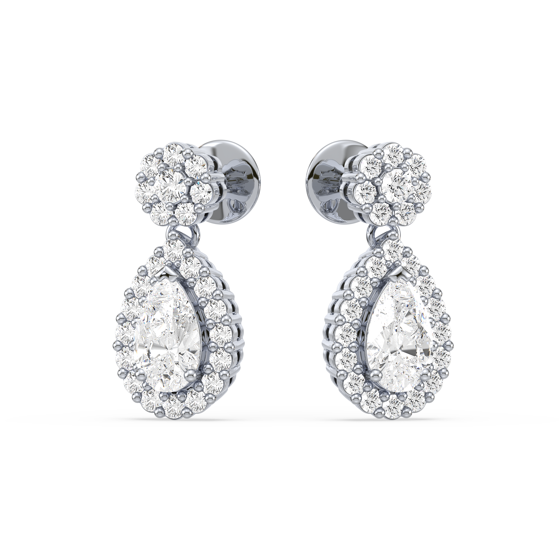 These graceful drop earrings feature pear shaped diamonds at the center, each surrounded by a halo of smaller diamonds. The elongated shape of the pear diamond creates a flattering effect, while the halo enhances the overall brilliance, making these earrings the perfect blend of elegance and sparkle.