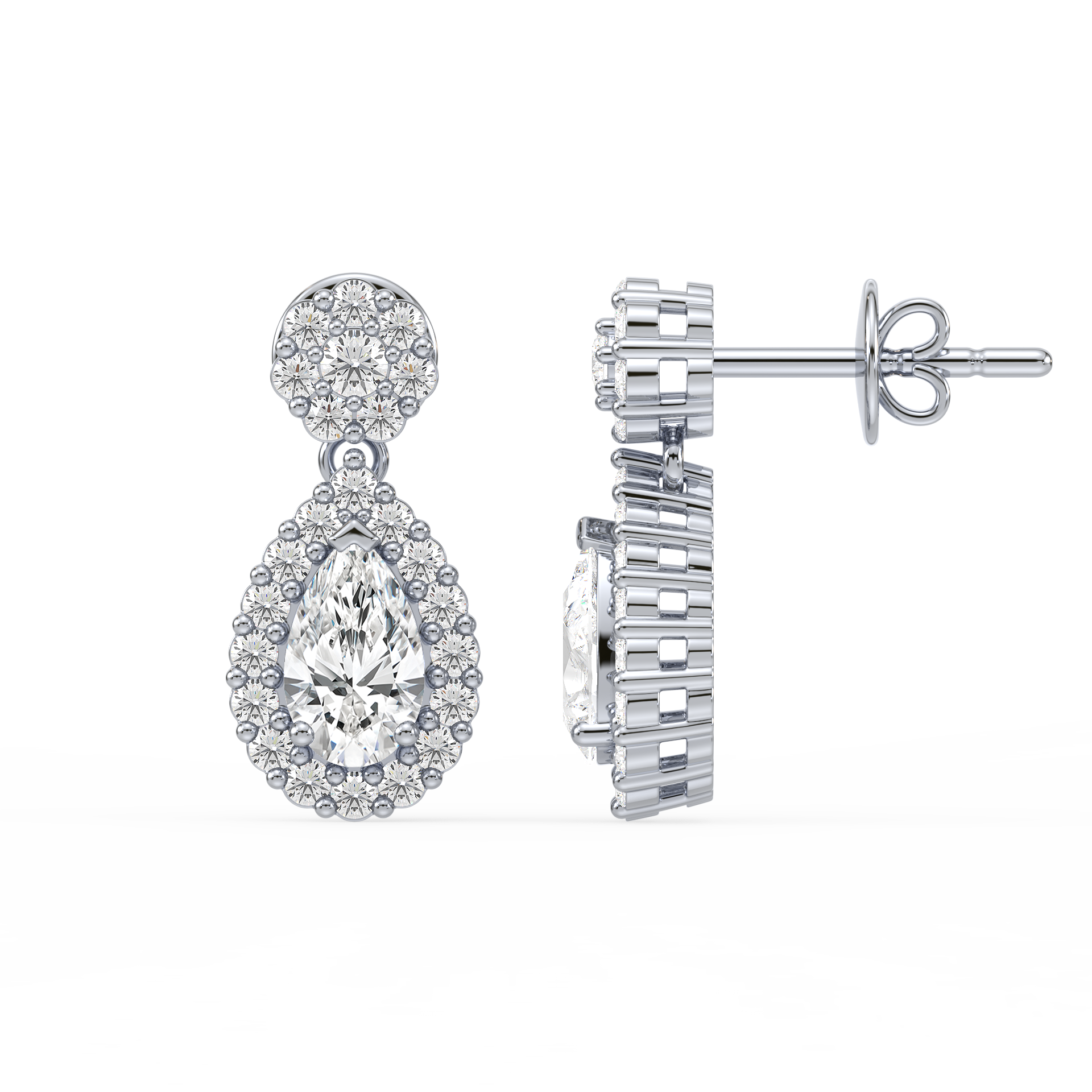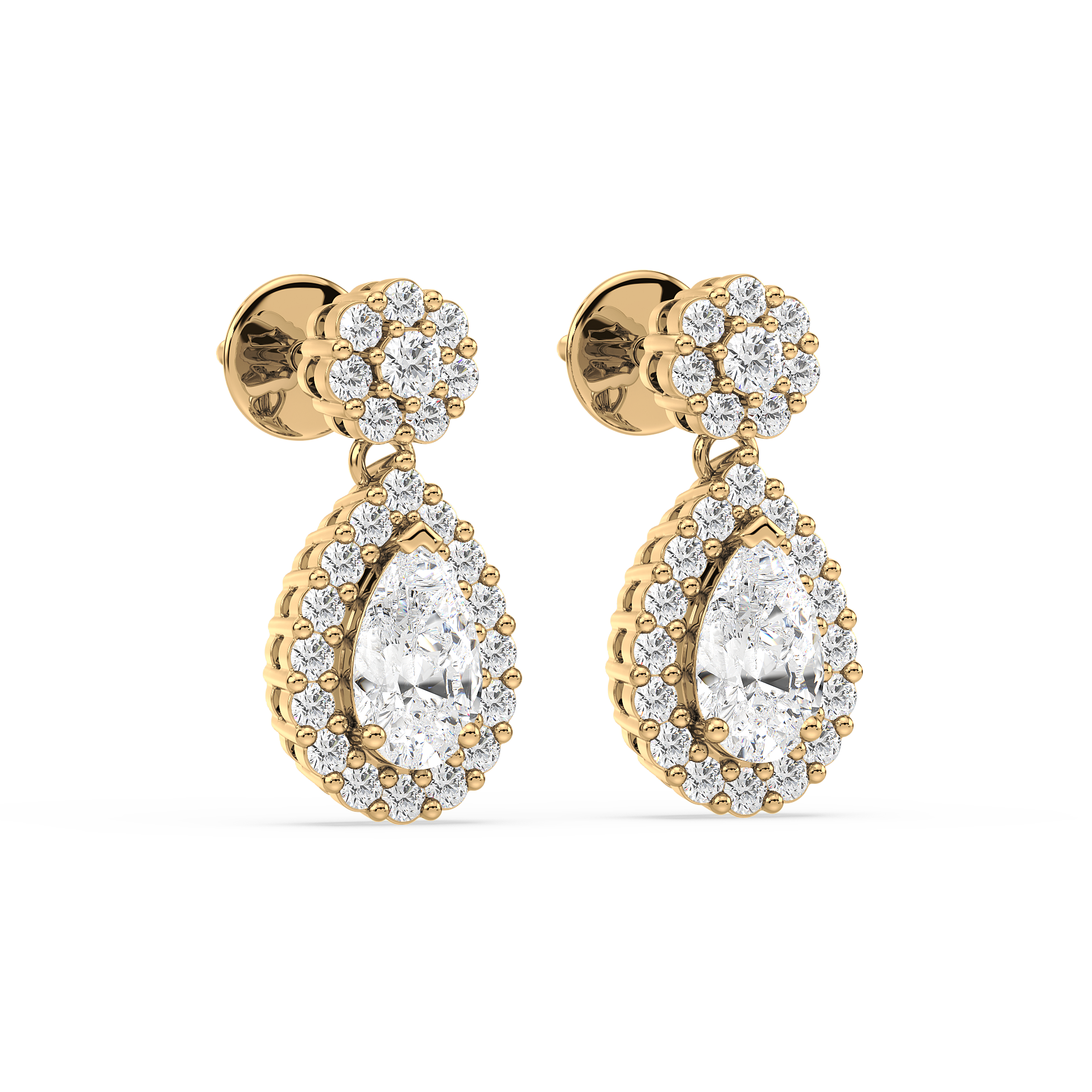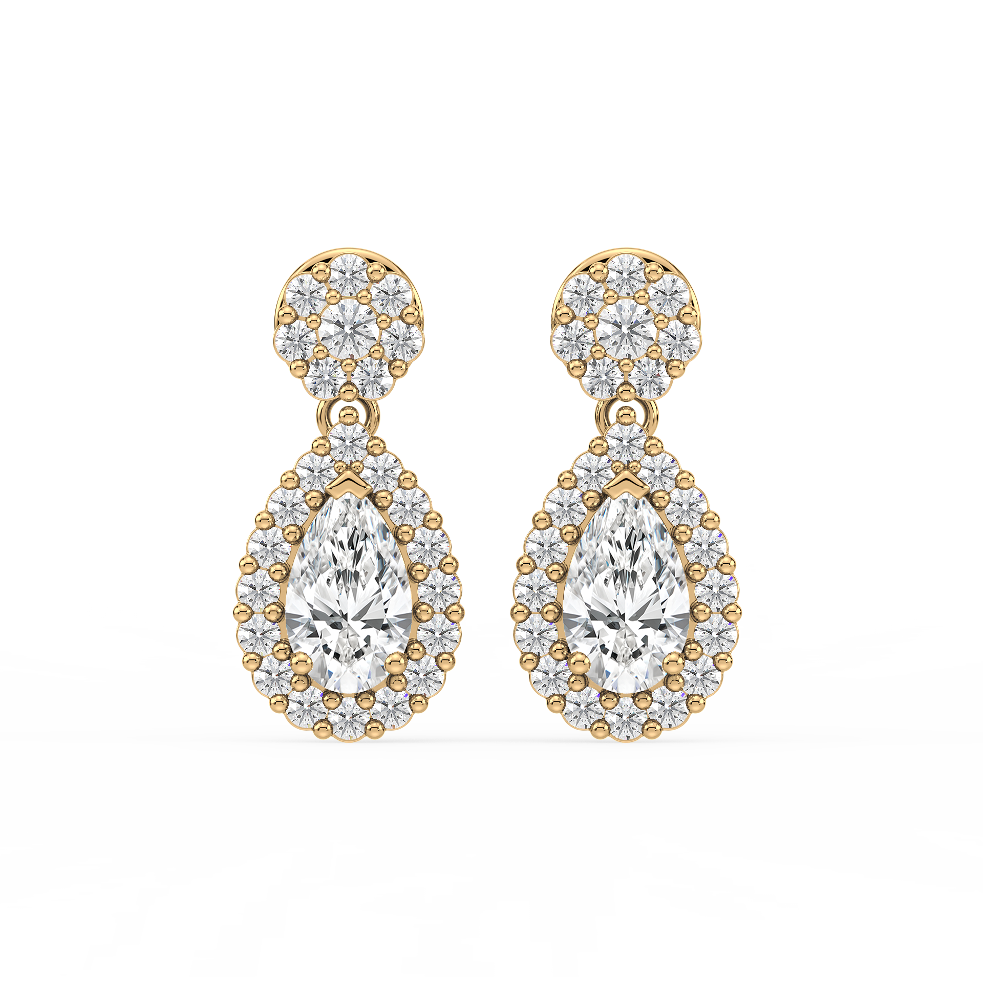 These graceful drop earrings feature pear shaped diamonds at the center, each surrounded by a halo of smaller diamonds. The elongated shape of the pear diamond creates a flattering effect, while the halo enhances the overall brilliance, making these earrings the perfect blend of elegance and sparkle.