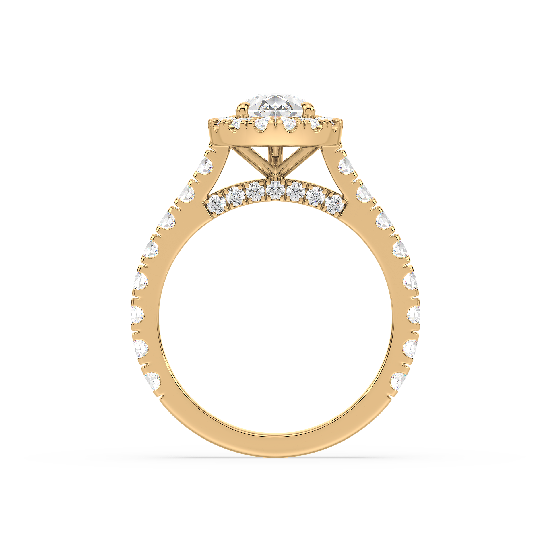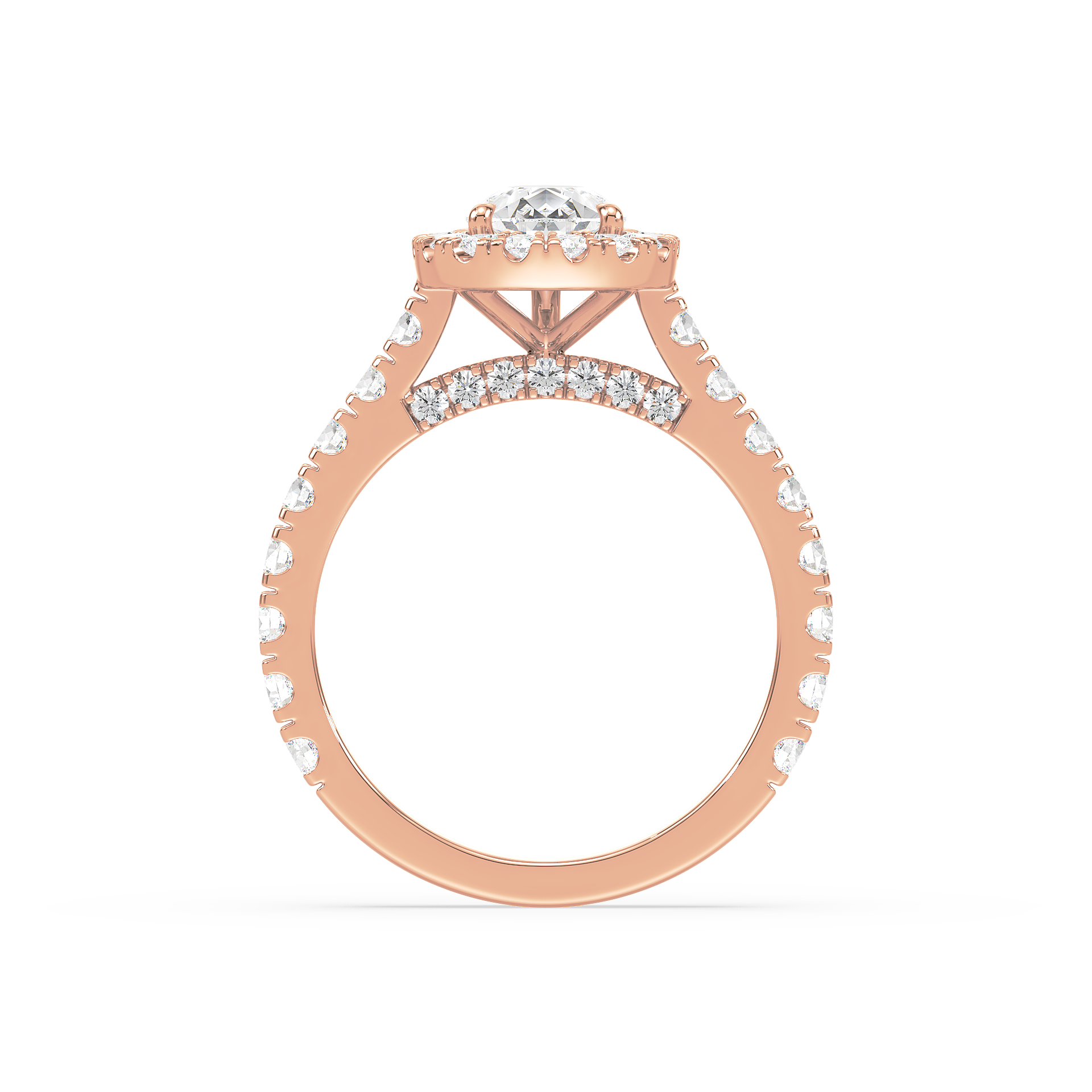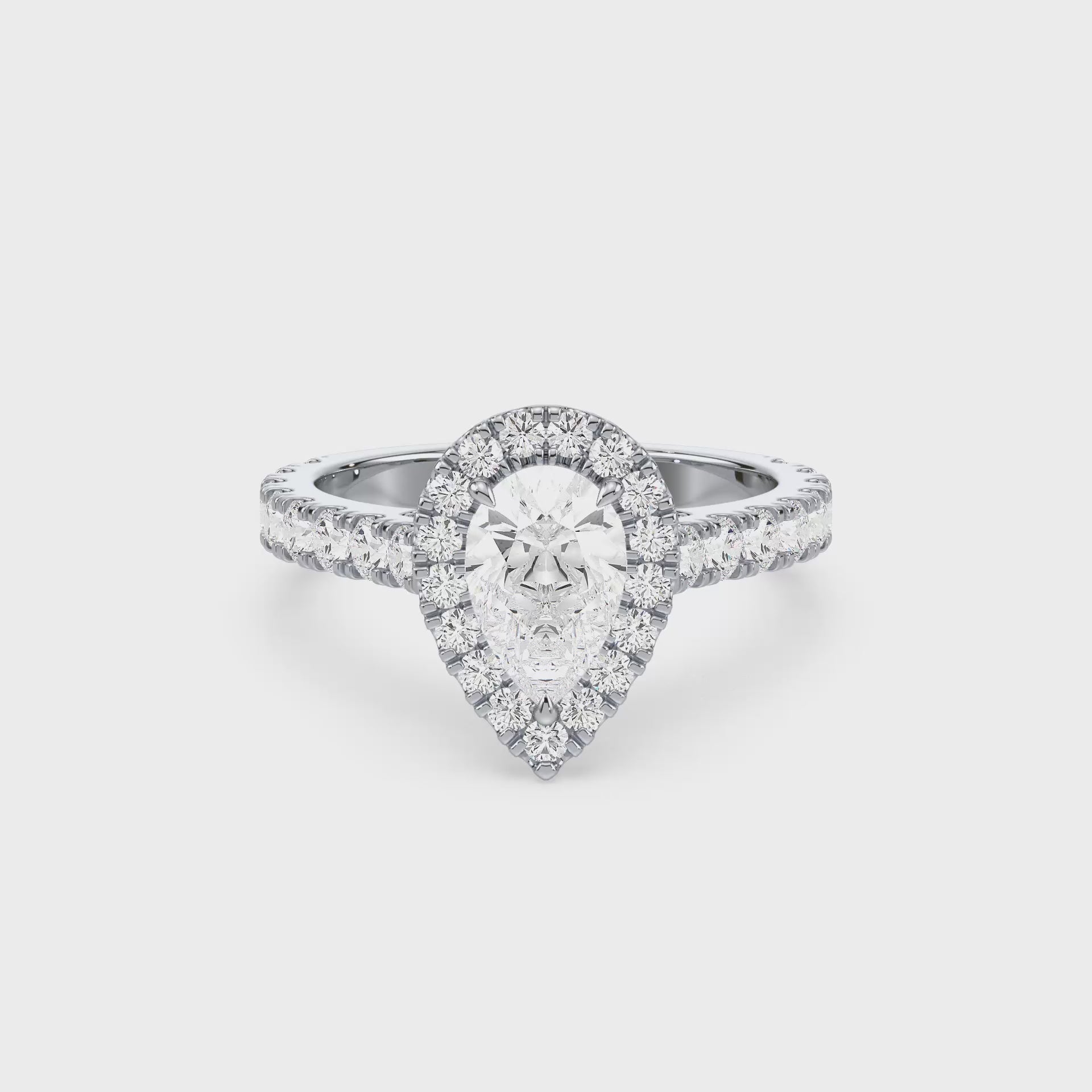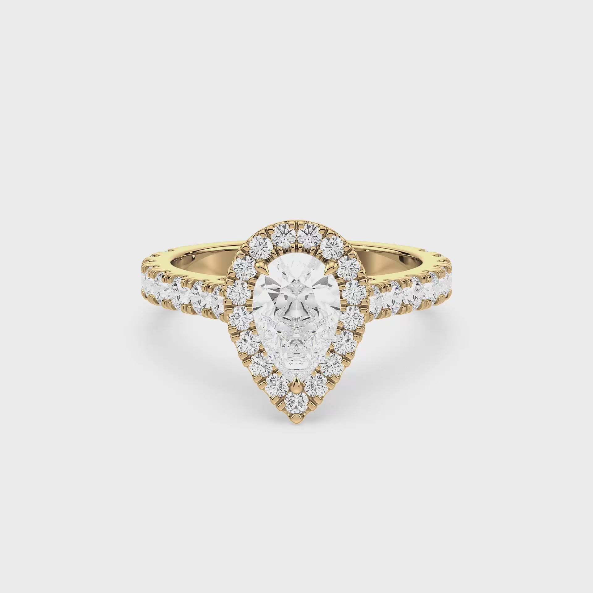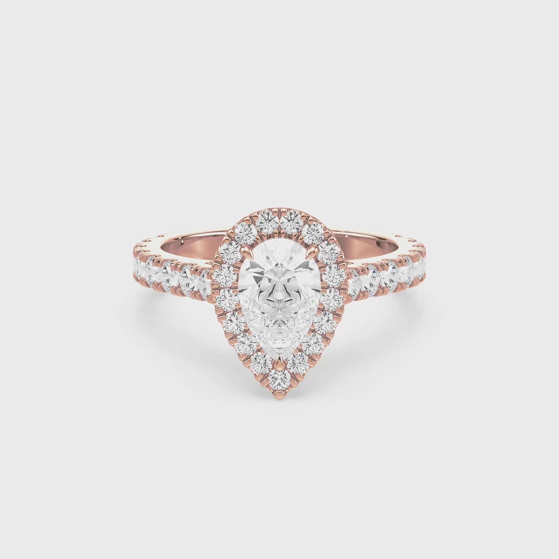The Pear Solitaire Halo Shank Ring features a pear-shaped diamond at its centre, surrounded by a delicate halo of diamonds. The unique shape of the pear-cut diamond enhances the ring’s elegance, while the halo setting adds extra brilliance and sophistication