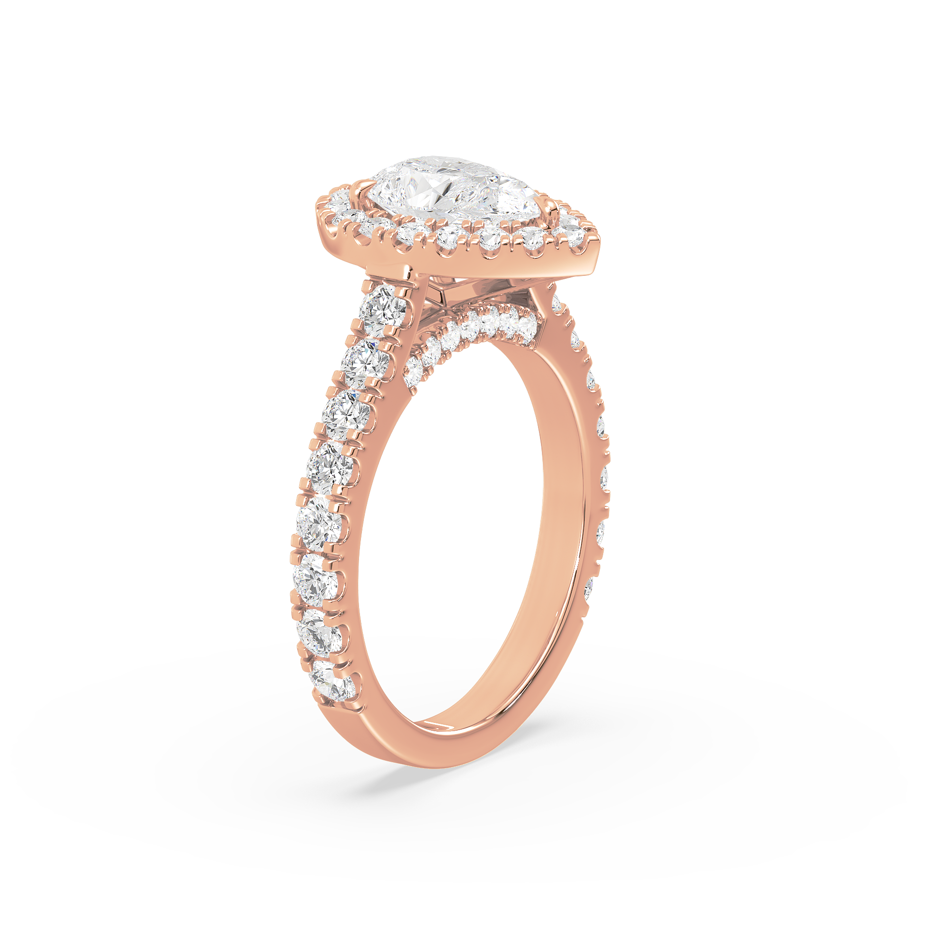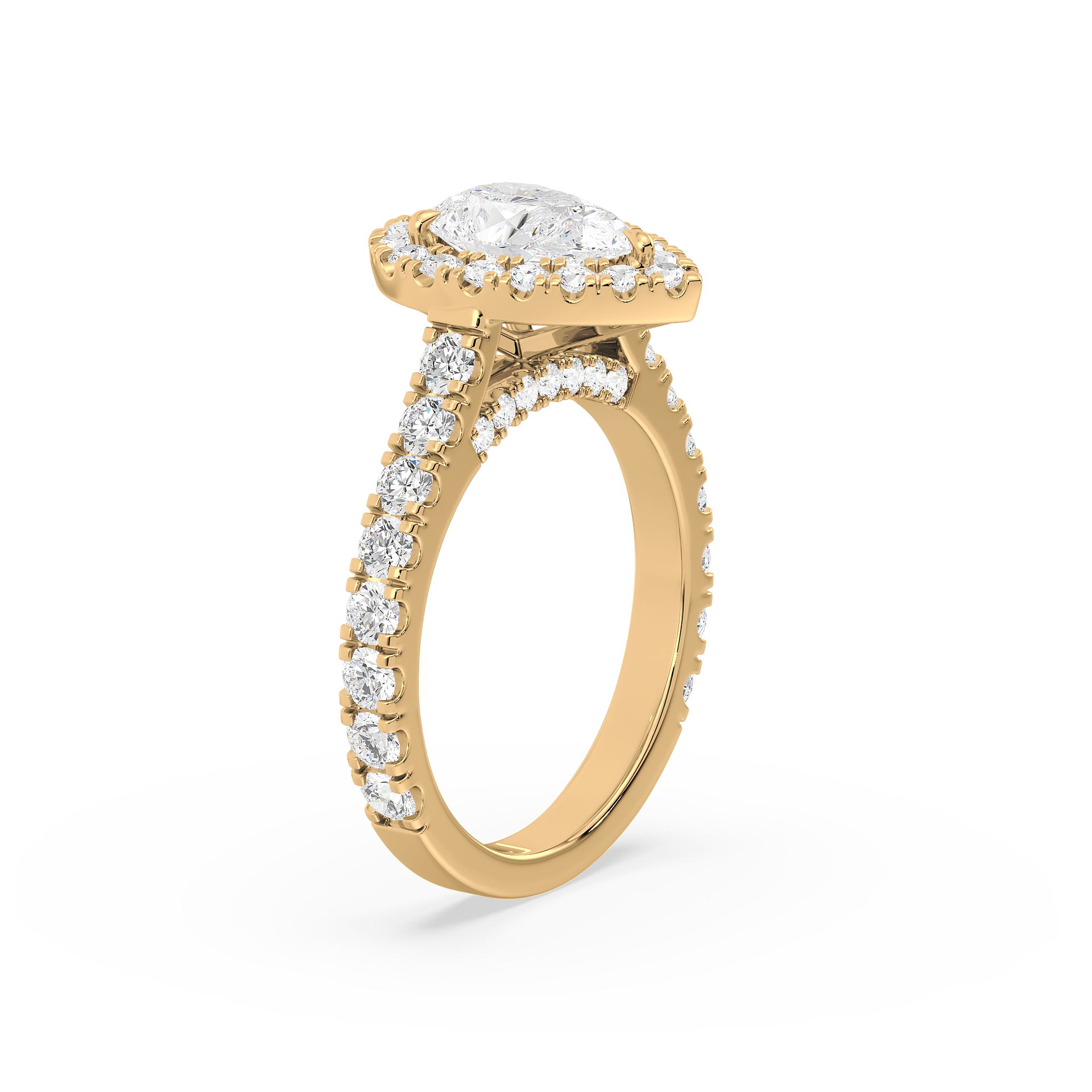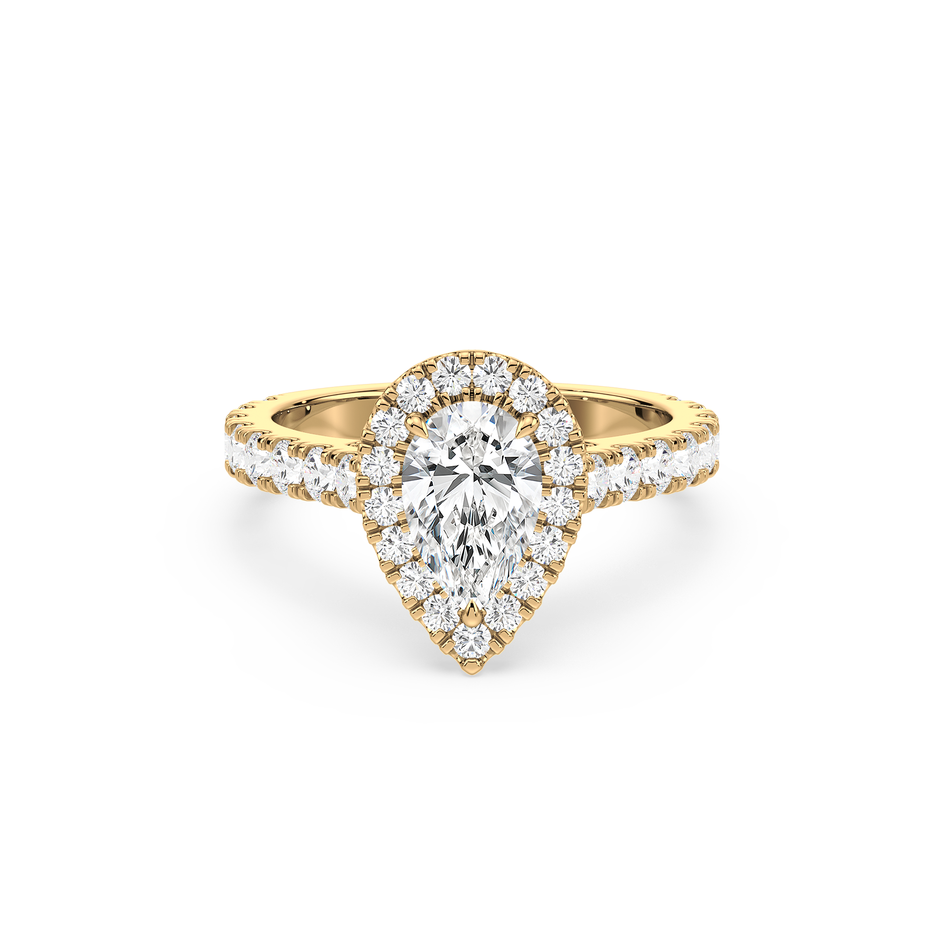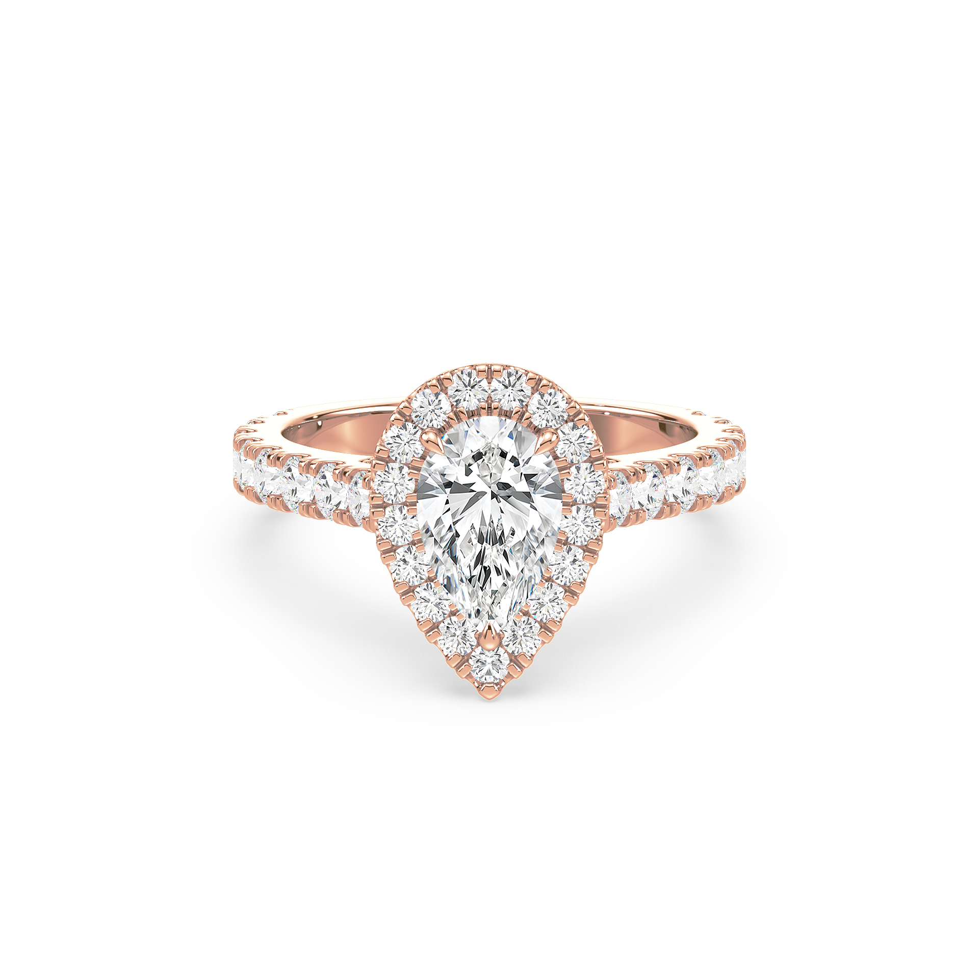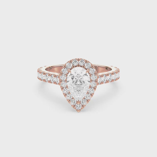 The Pear Solitaire Halo Shank Ring features a pear-shaped diamond at its centre, surrounded by a delicate halo of diamonds. The unique shape of the pear-cut diamond enhances the ring’s elegance, while the halo setting adds extra brilliance and sophistication