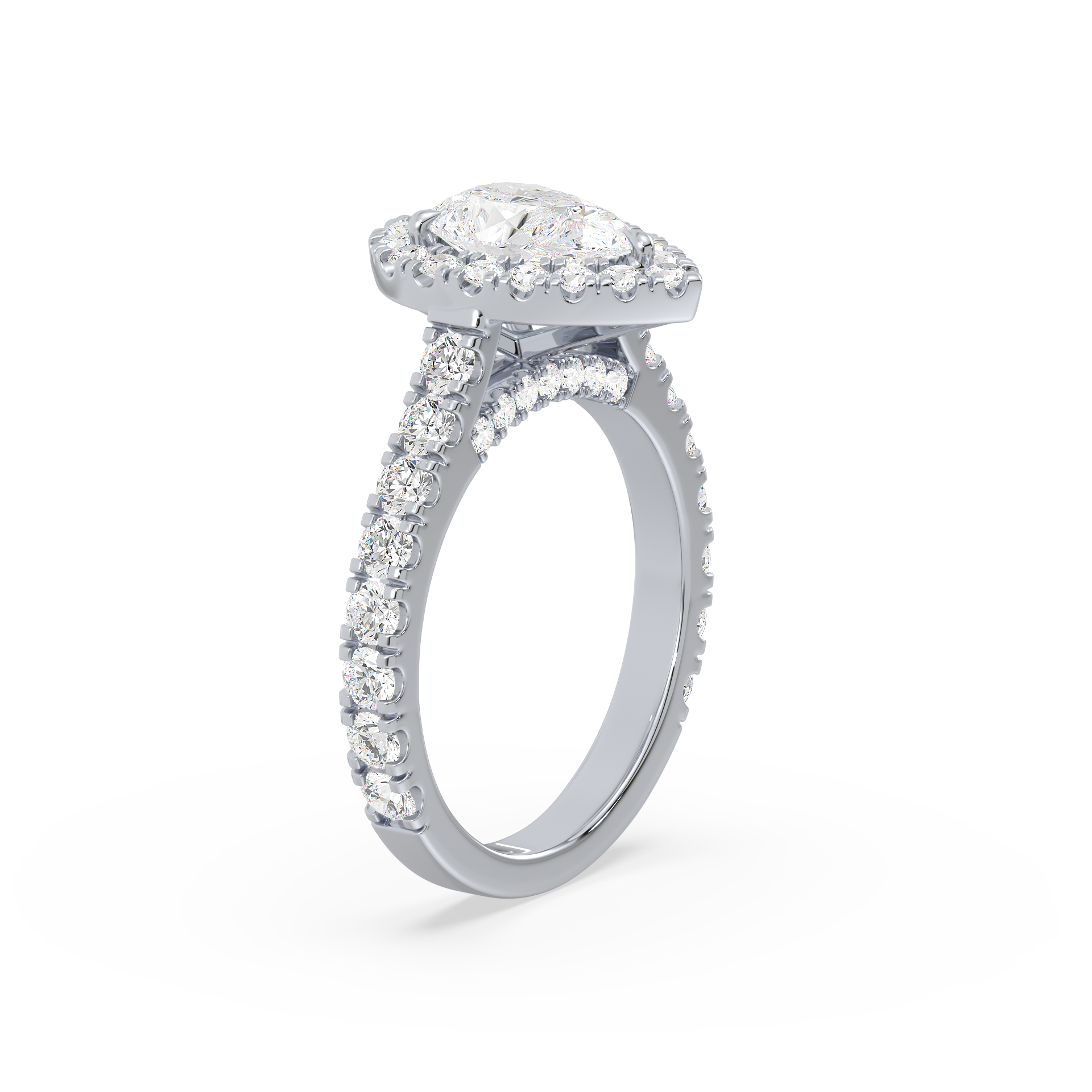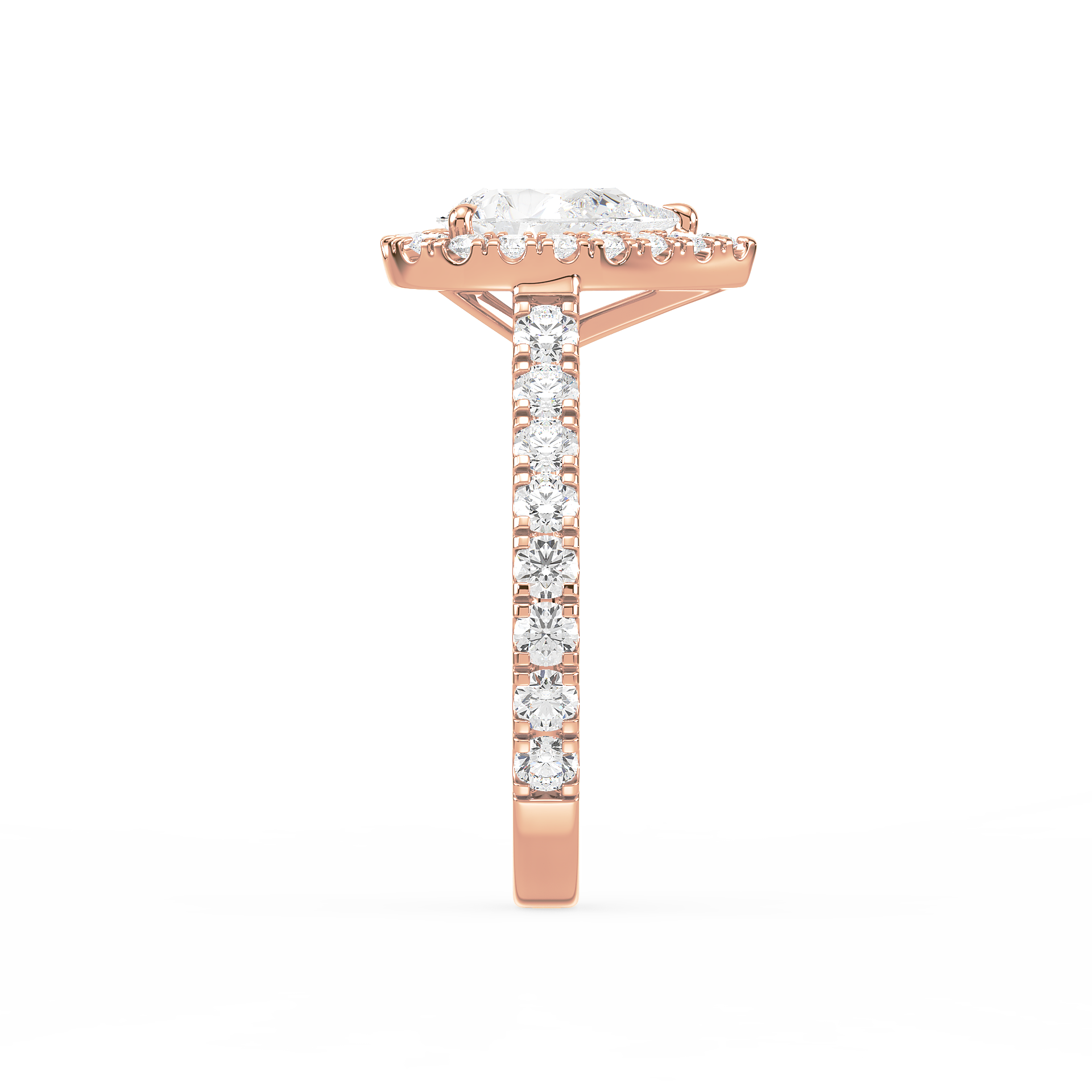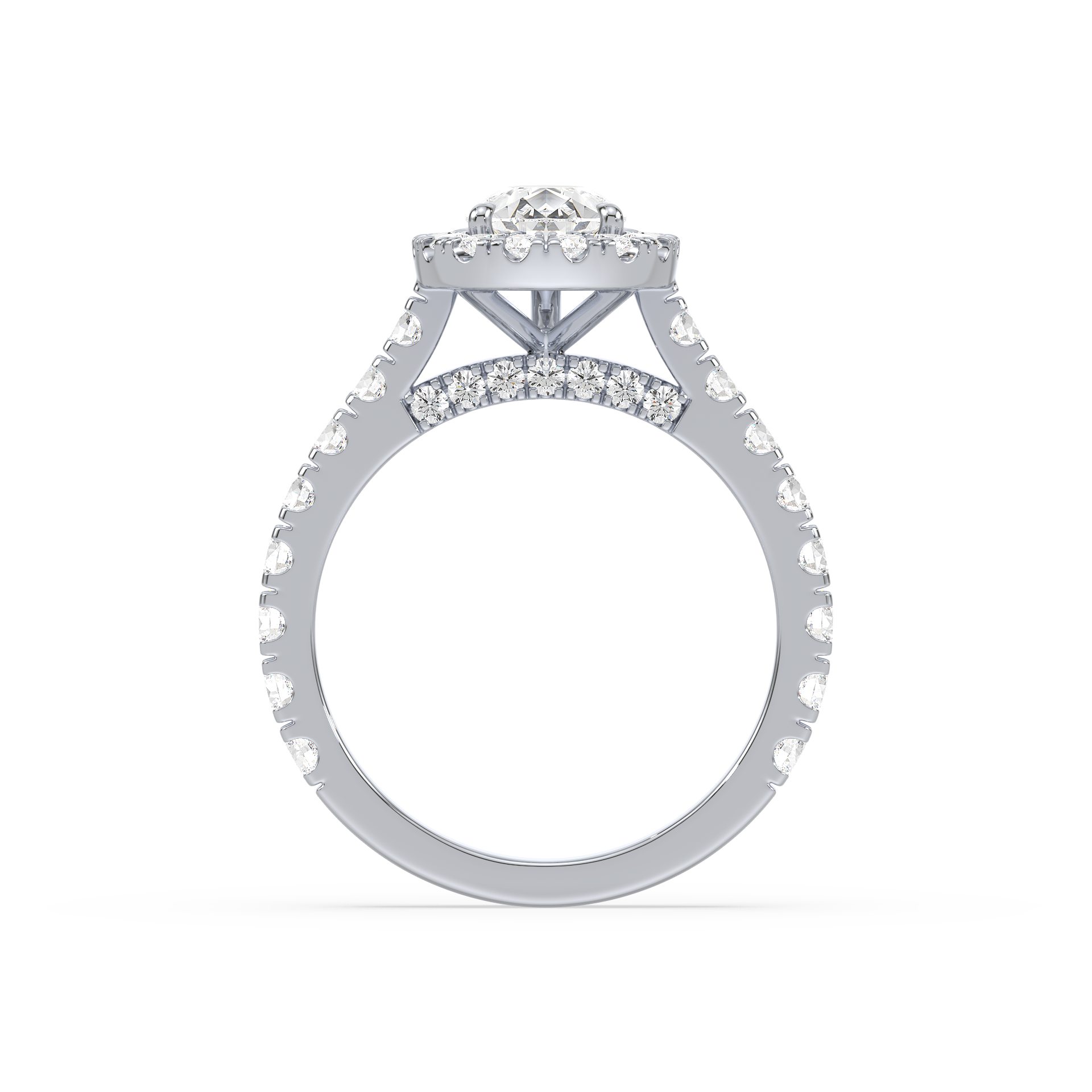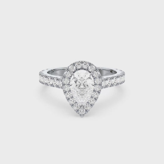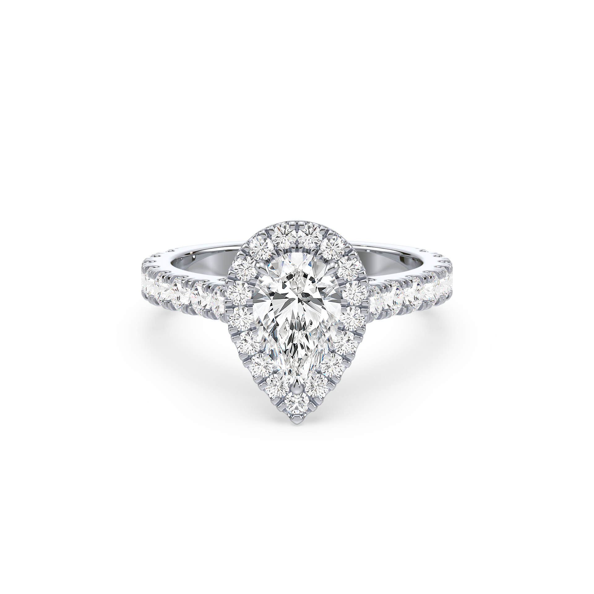 The Pear Solitaire Halo Shank Ring features a pear-shaped diamond at its centre, surrounded by a delicate halo of diamonds. The unique shape of the pear-cut diamond enhances the ring’s elegance, while the halo setting adds extra brilliance and sophistication