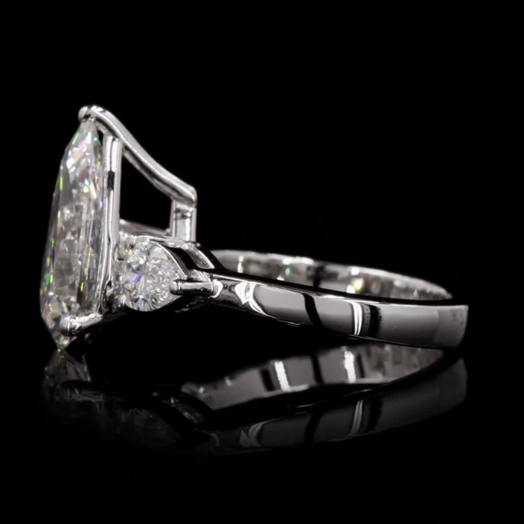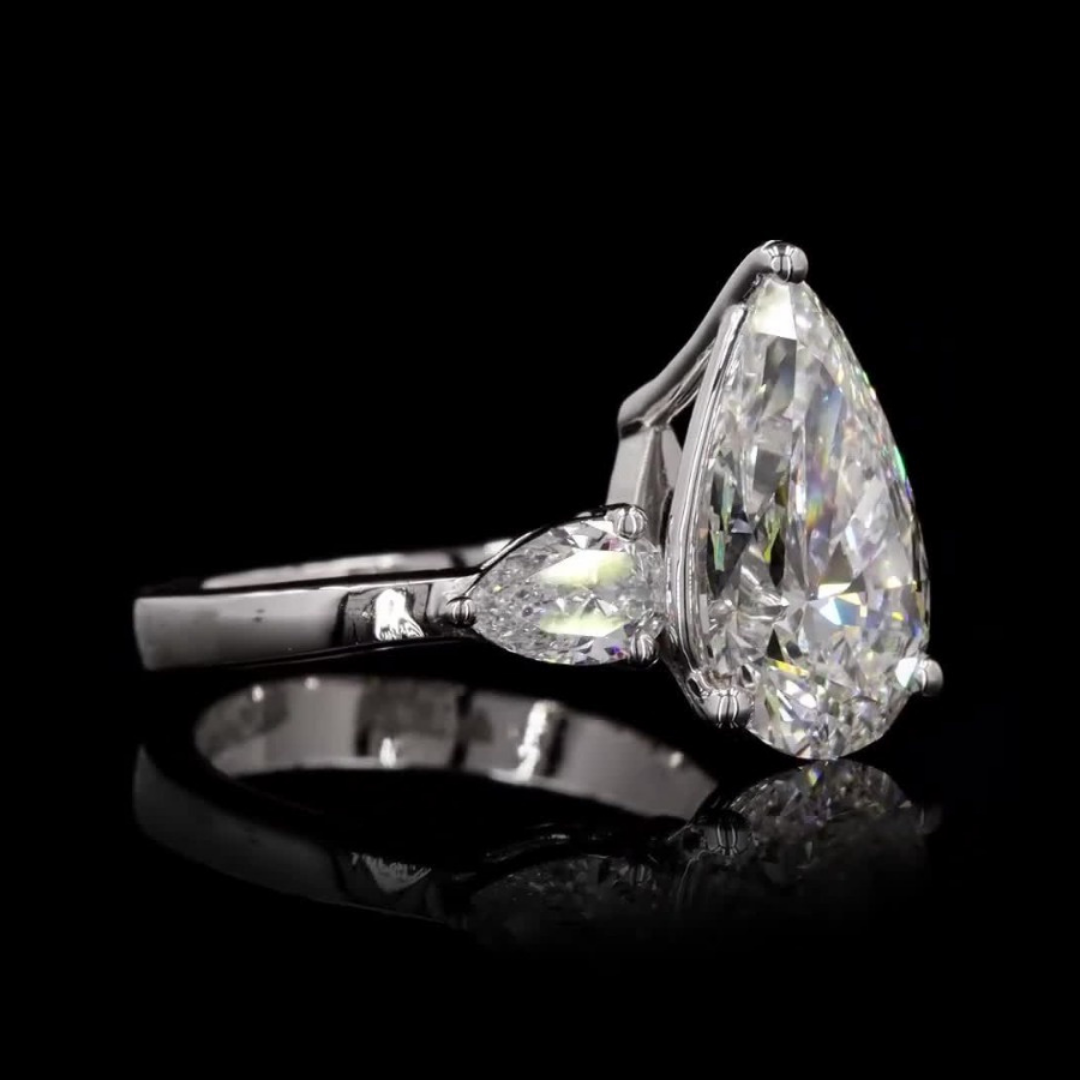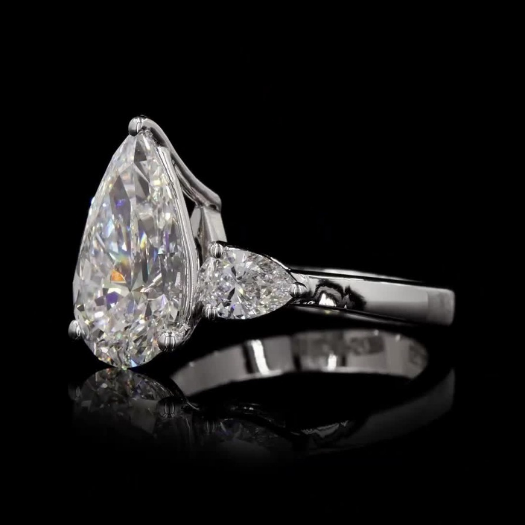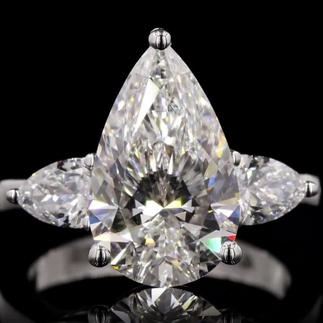 A stunning ring featuring a central pear-shaped diamond flanked by two exquisite pear-shaped side stones. Perfect for a timeless and elegant look.