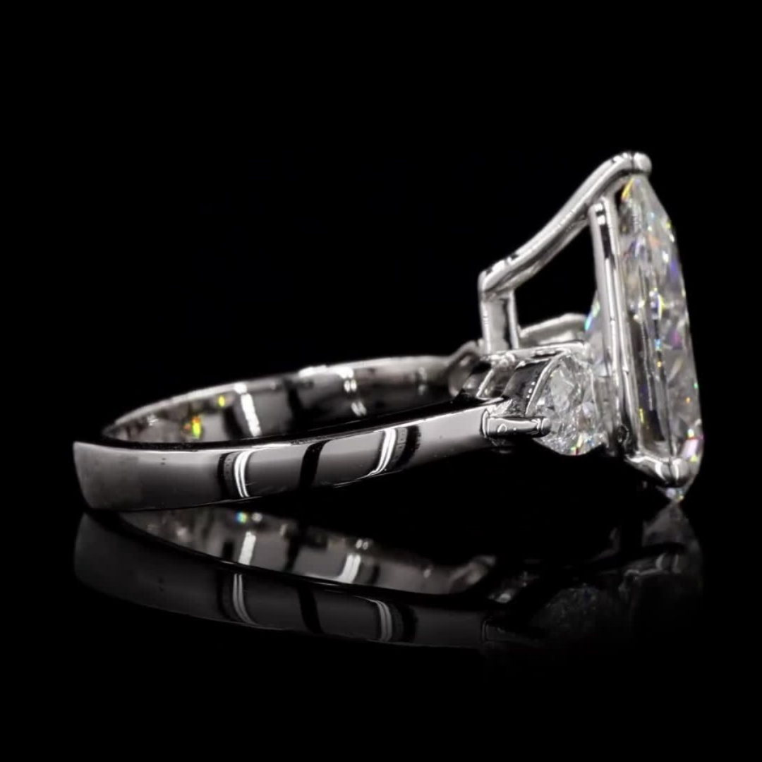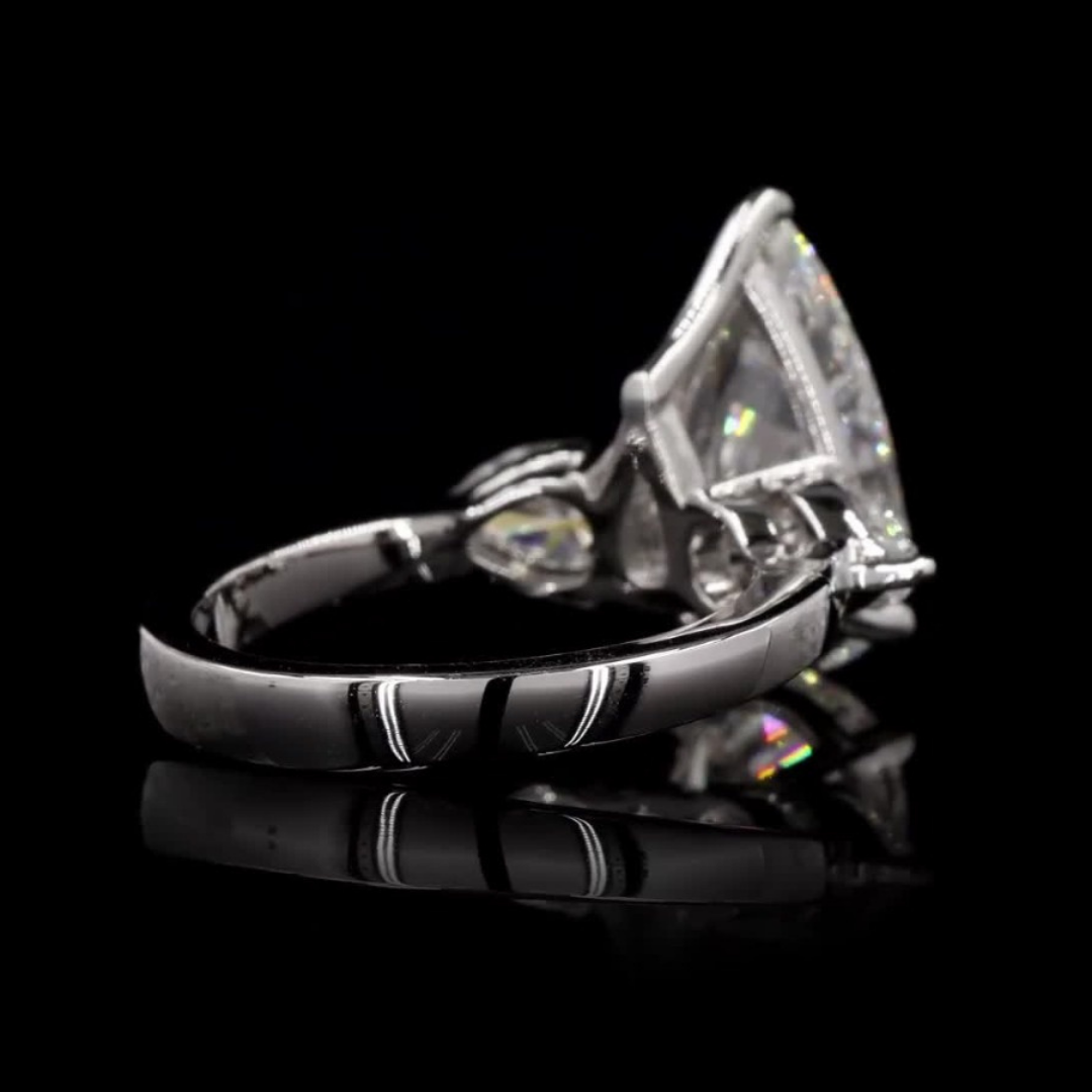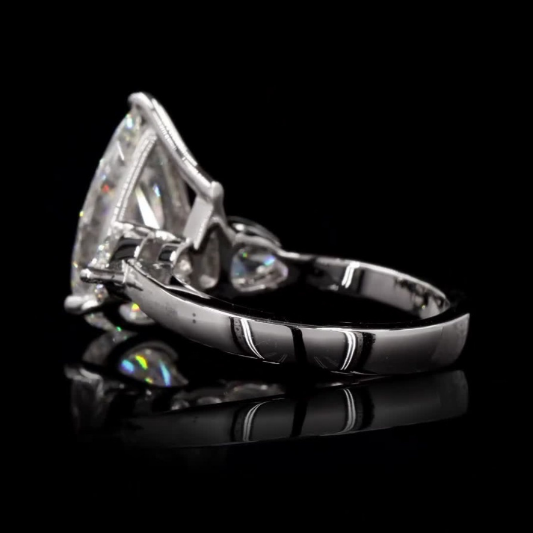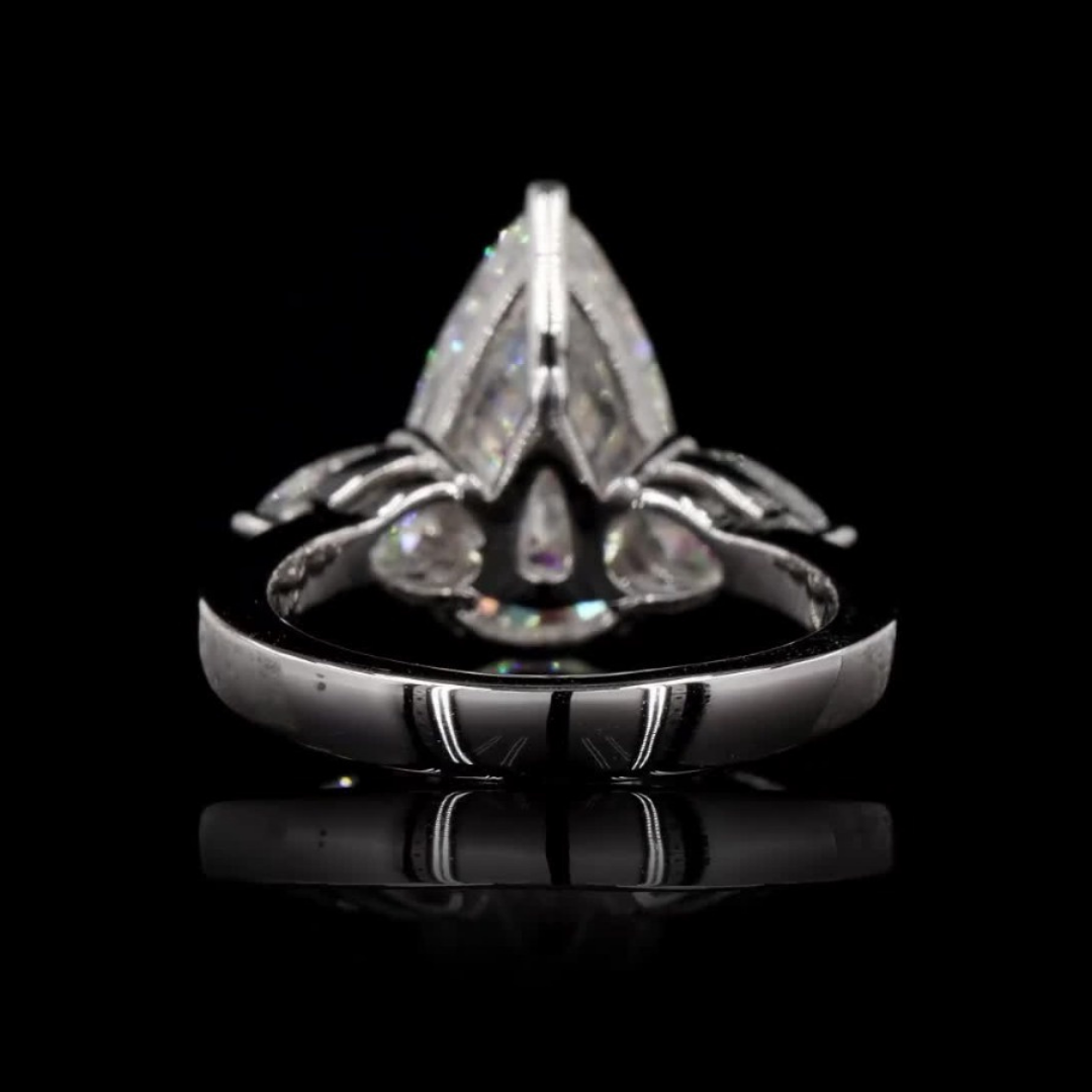 A stunning ring featuring a central pear-shaped diamond flanked by two exquisite pear-shaped side stones. Perfect for a timeless and elegant look.