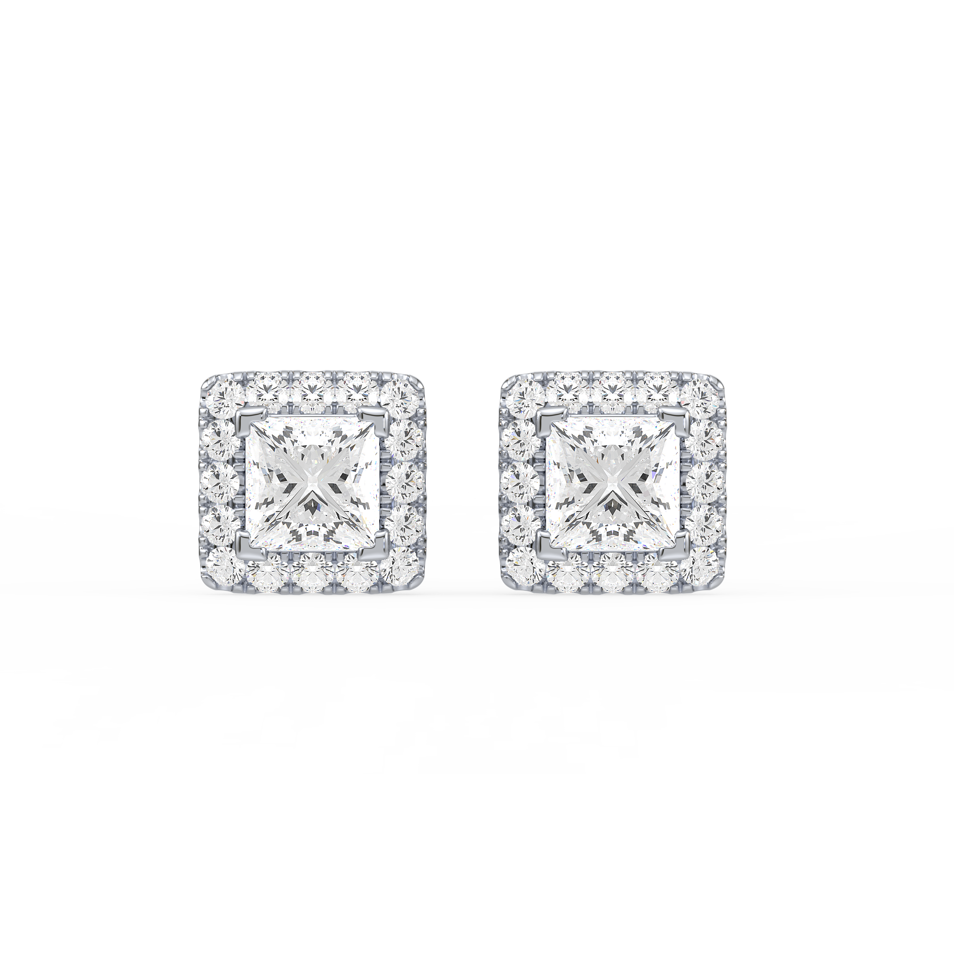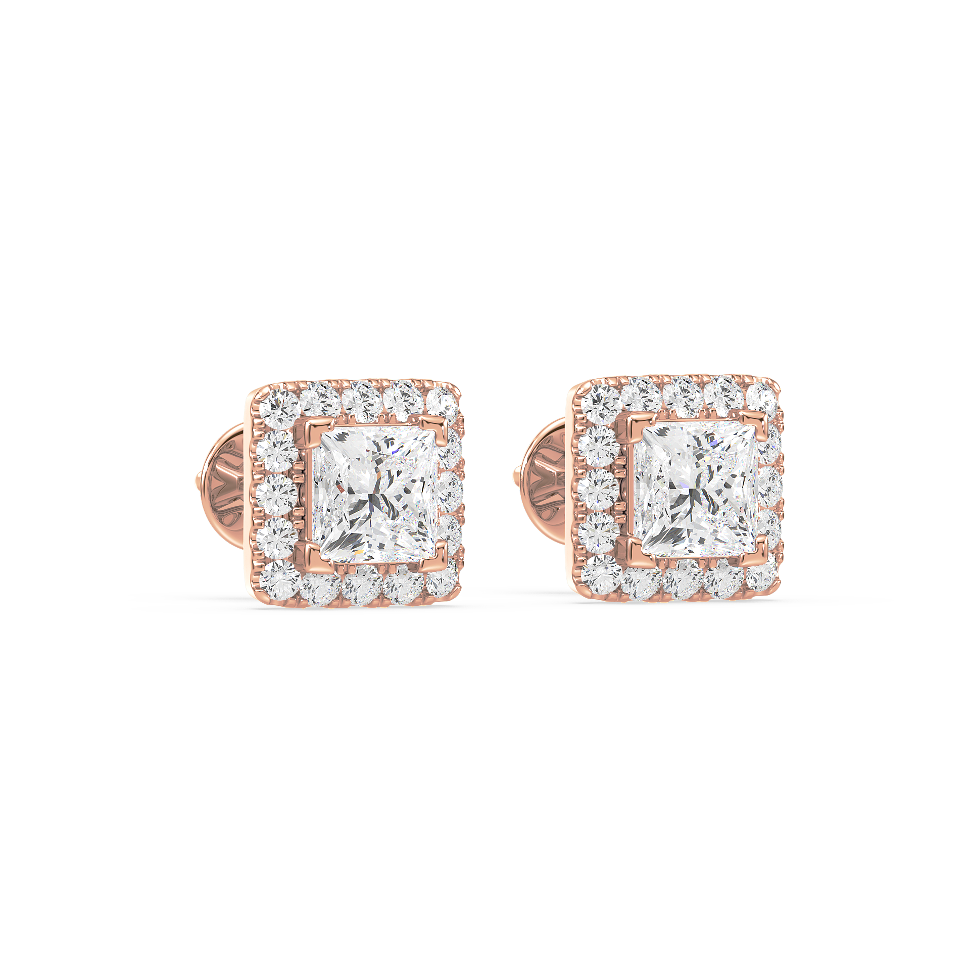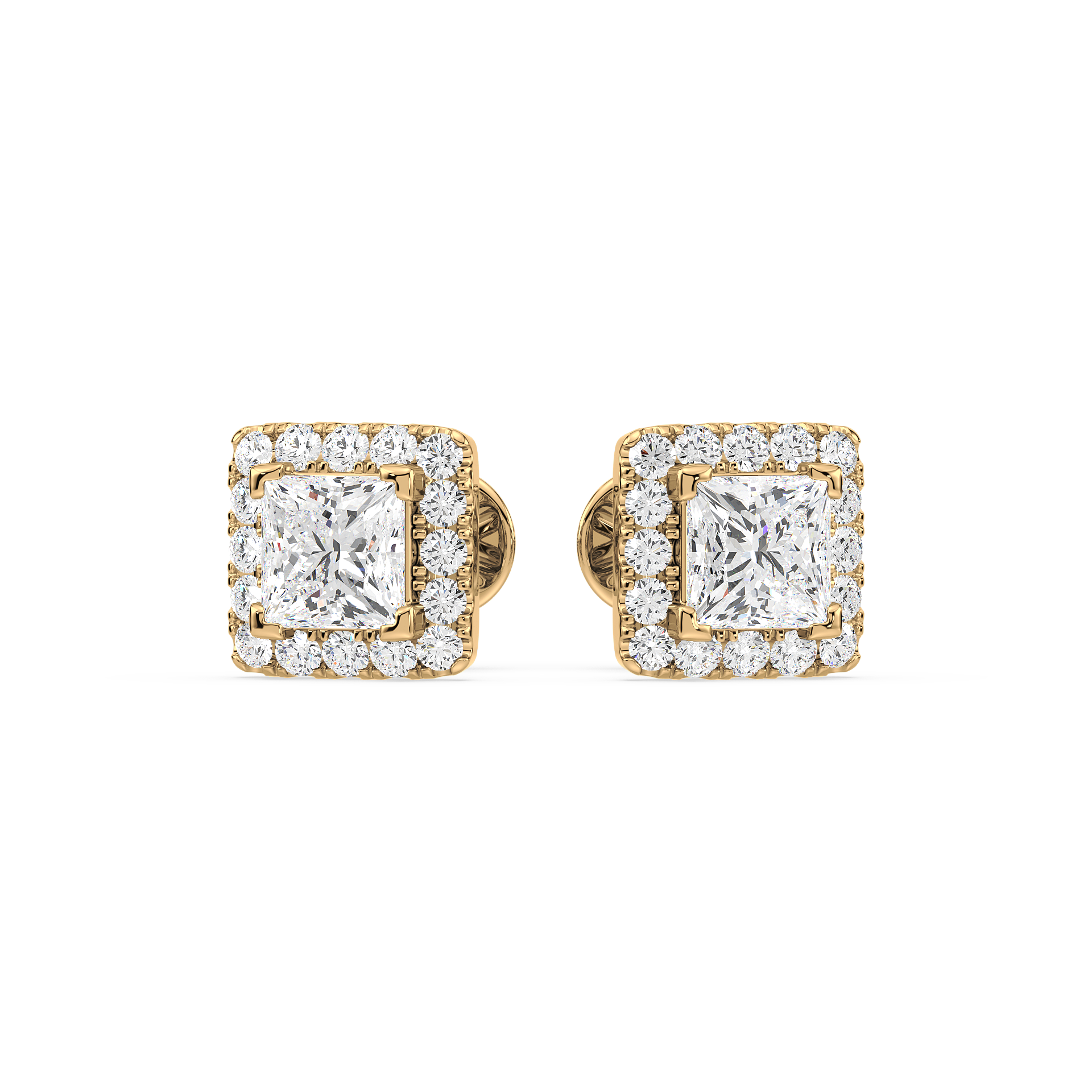 A beautiful pair of stud earrings featuring princess cut diamonds surrounded by a sparkling halo of smaller diamonds. The clean lines of the princess-cut combined with the radiant halo create a stunning visual effect, perfect for those who love geometric elegance with a touch of glamour.
