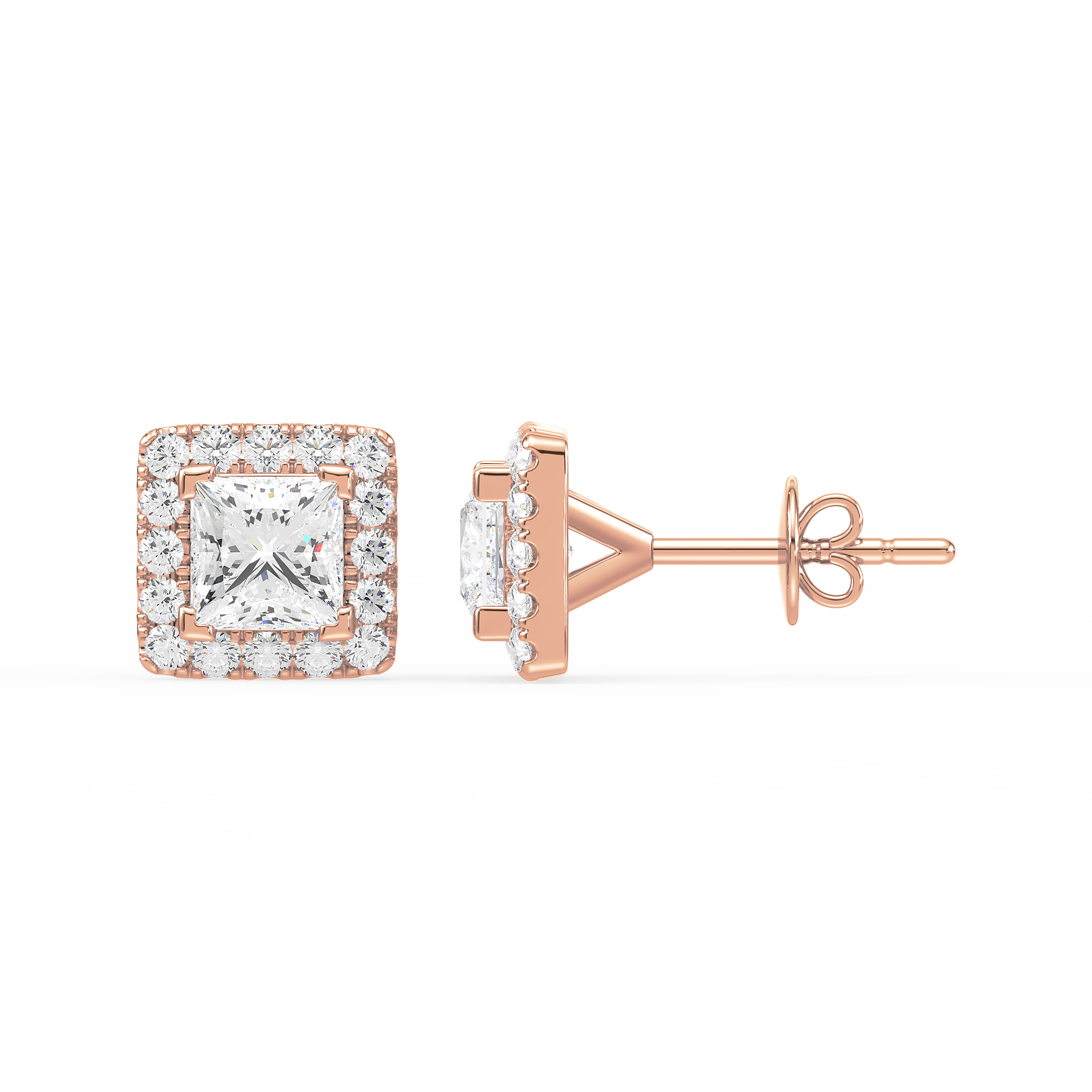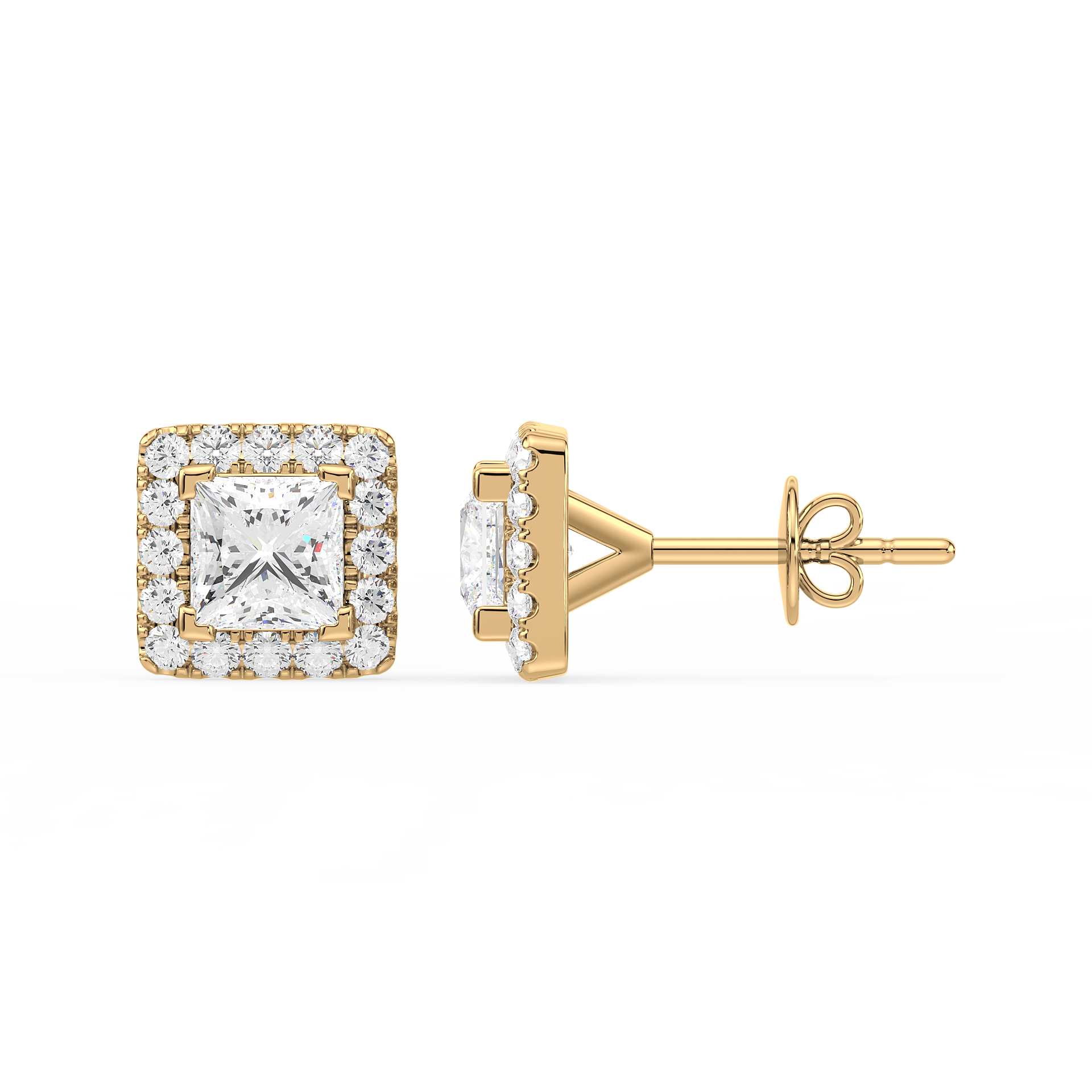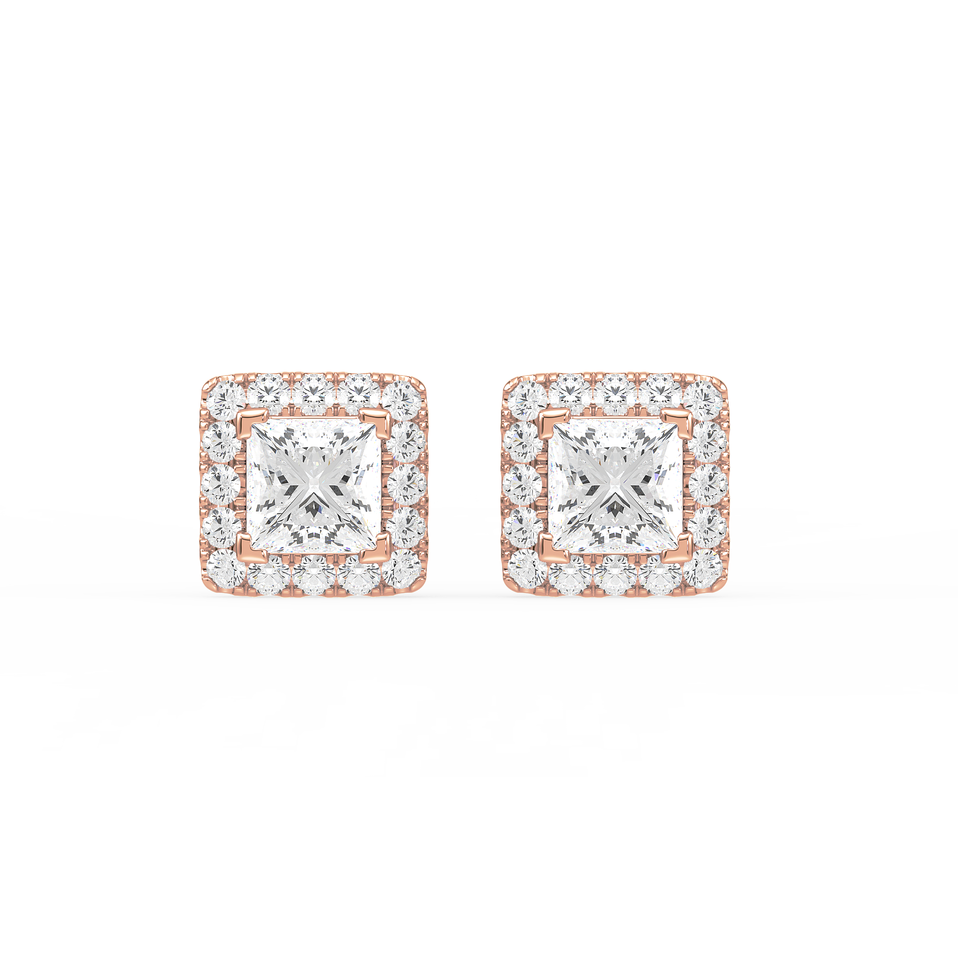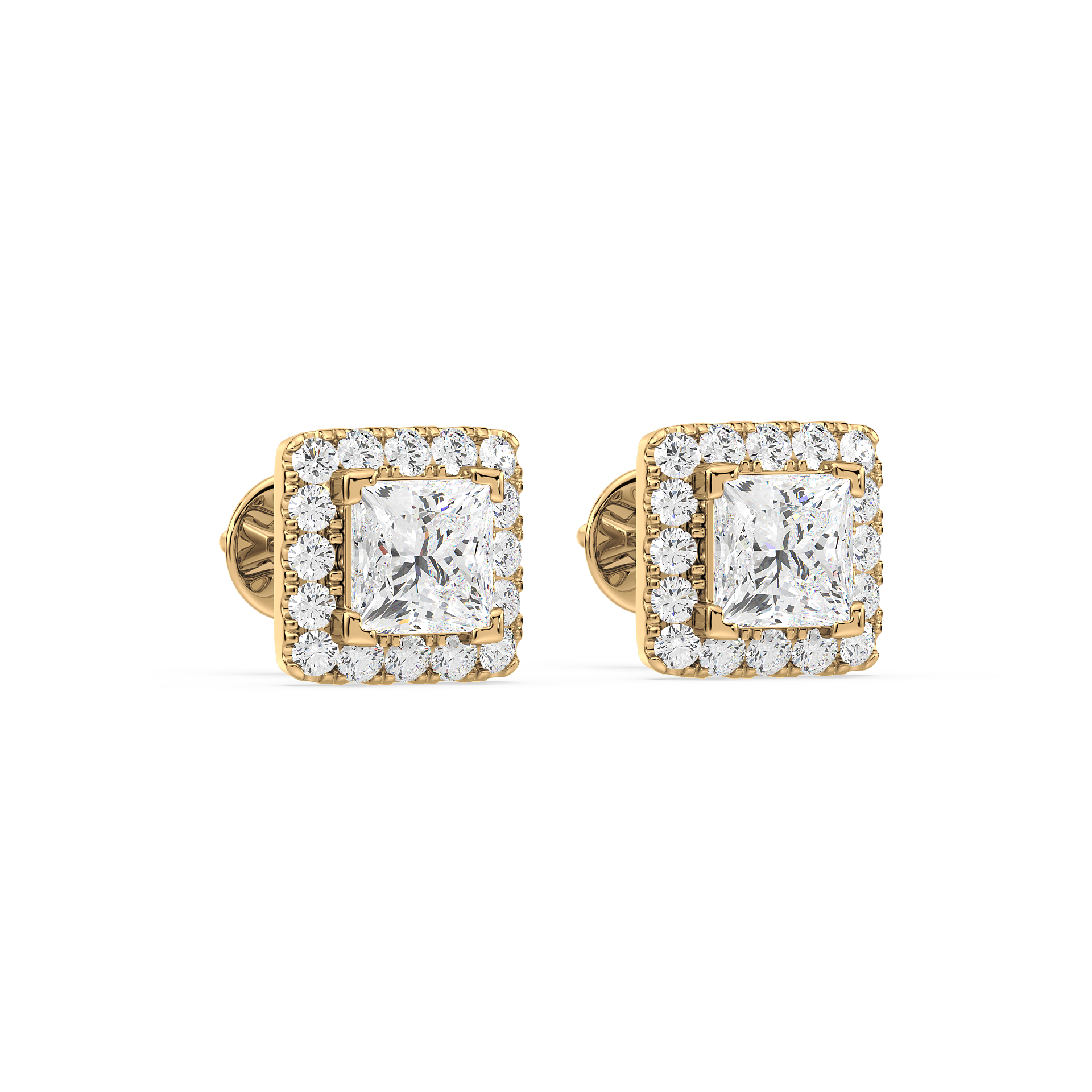 A beautiful pair of stud earrings featuring princess cut diamonds surrounded by a sparkling halo of smaller diamonds. The clean lines of the princess-cut combined with the radiant halo create a stunning visual effect, perfect for those who love geometric elegance with a touch of glamour.