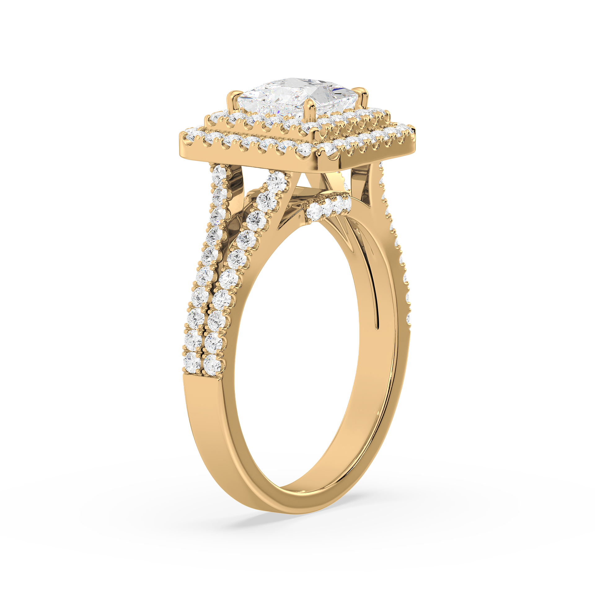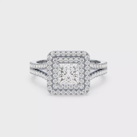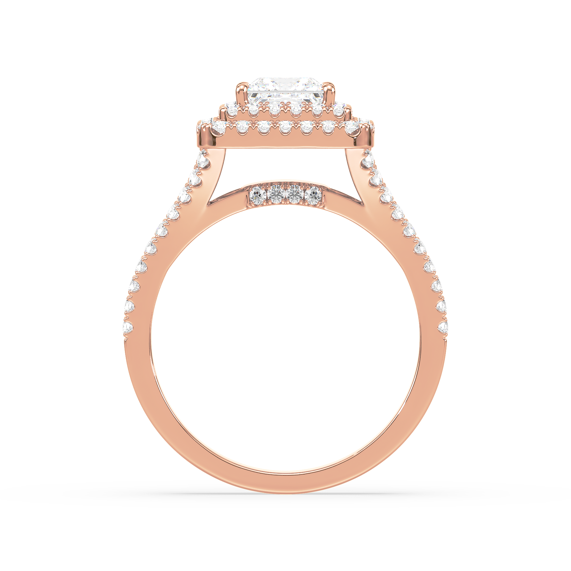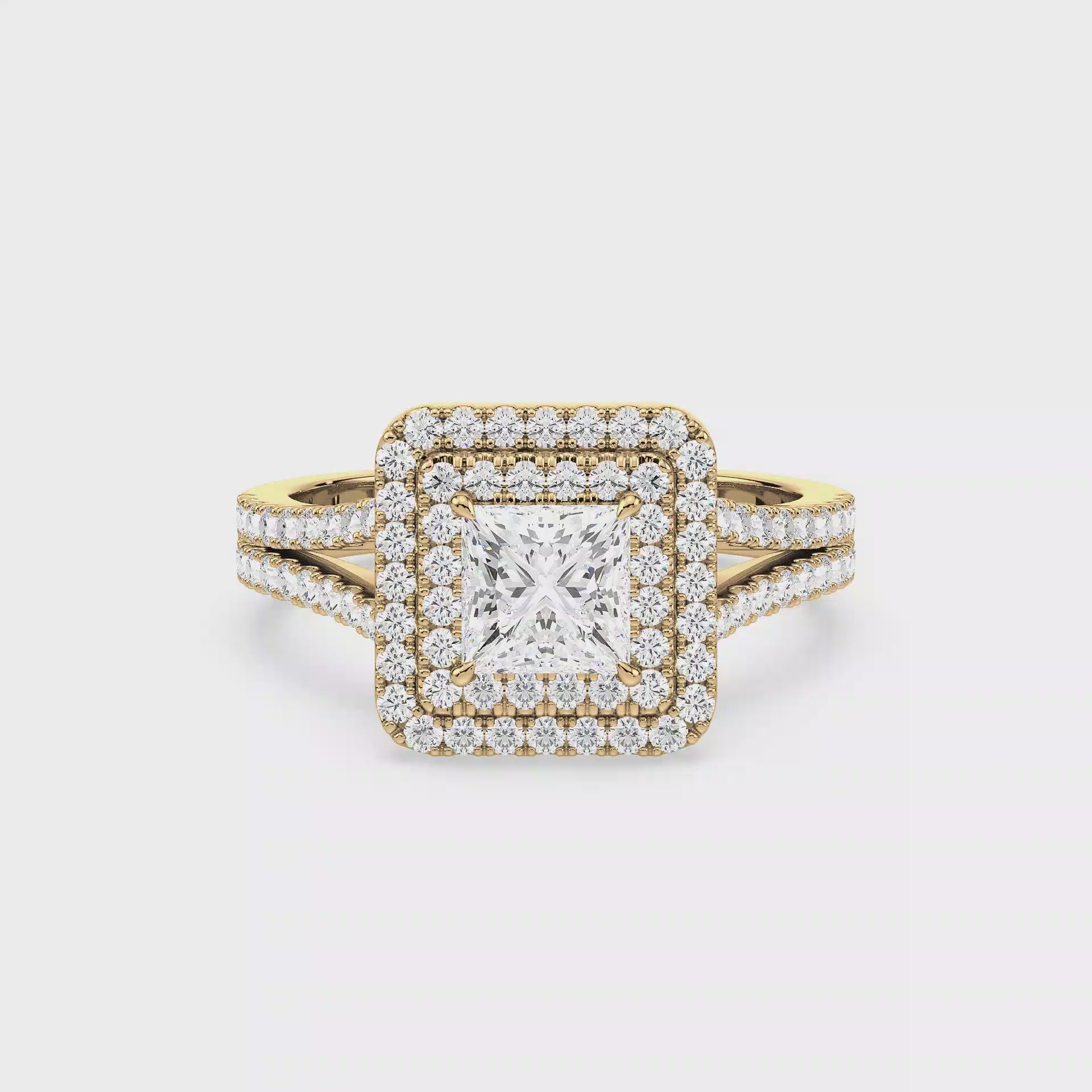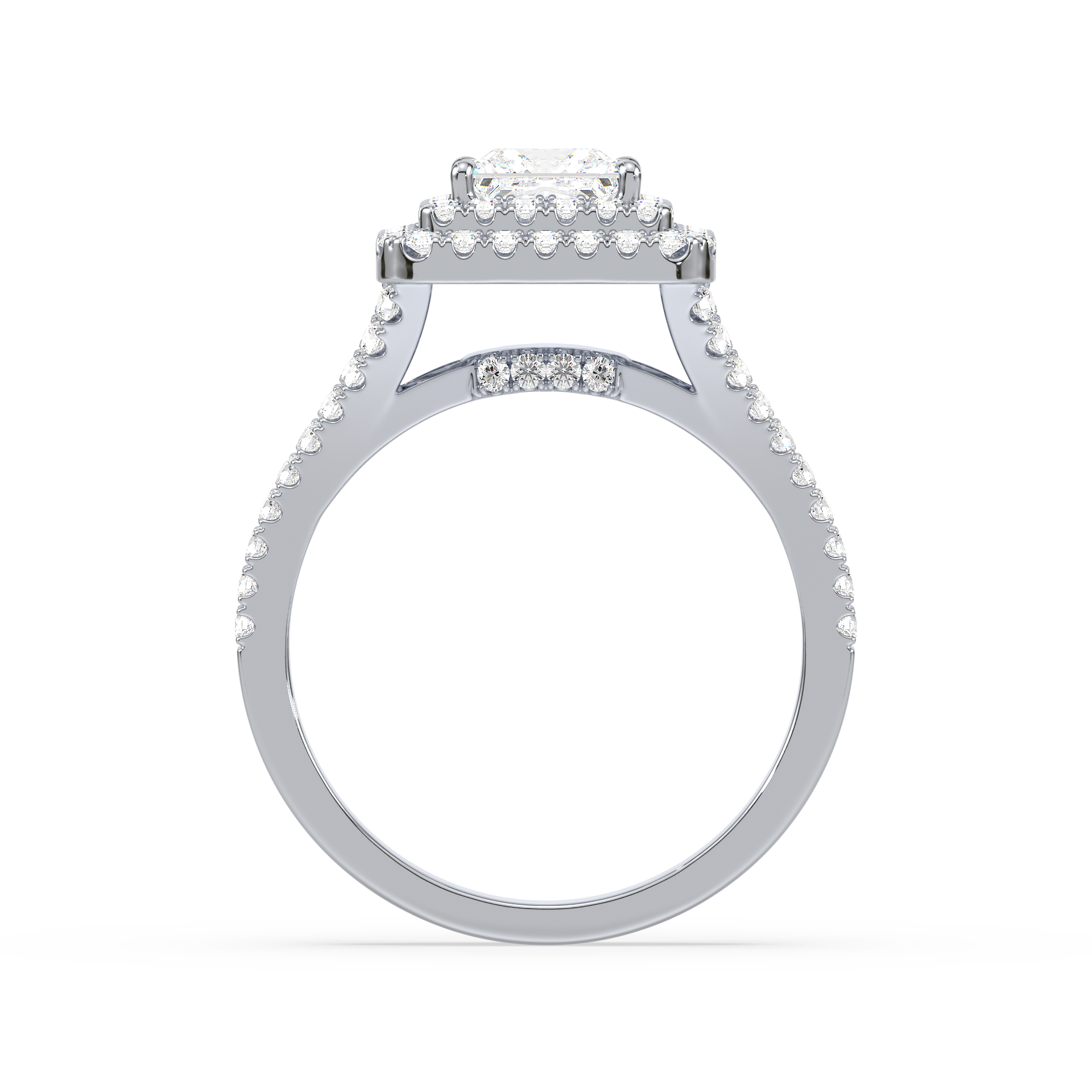 The Princess Solitaire Halo Shank Ring features a radiant princess-cut diamond at its center, surrounded by a halo of sparkling diamonds. The sleek band and halo setting enhance the central stone’s brilliance, creating a ring that’s both modern and timeless.