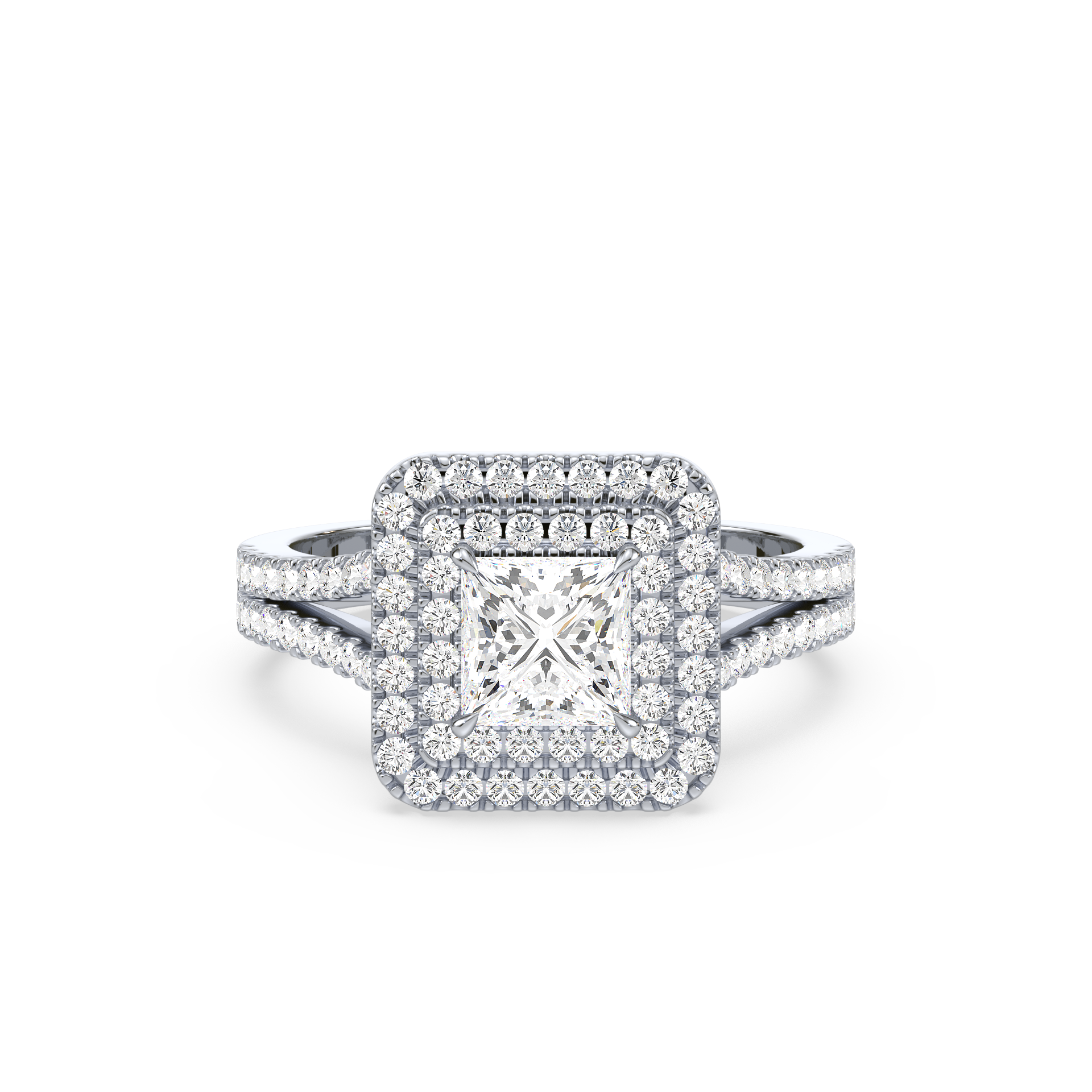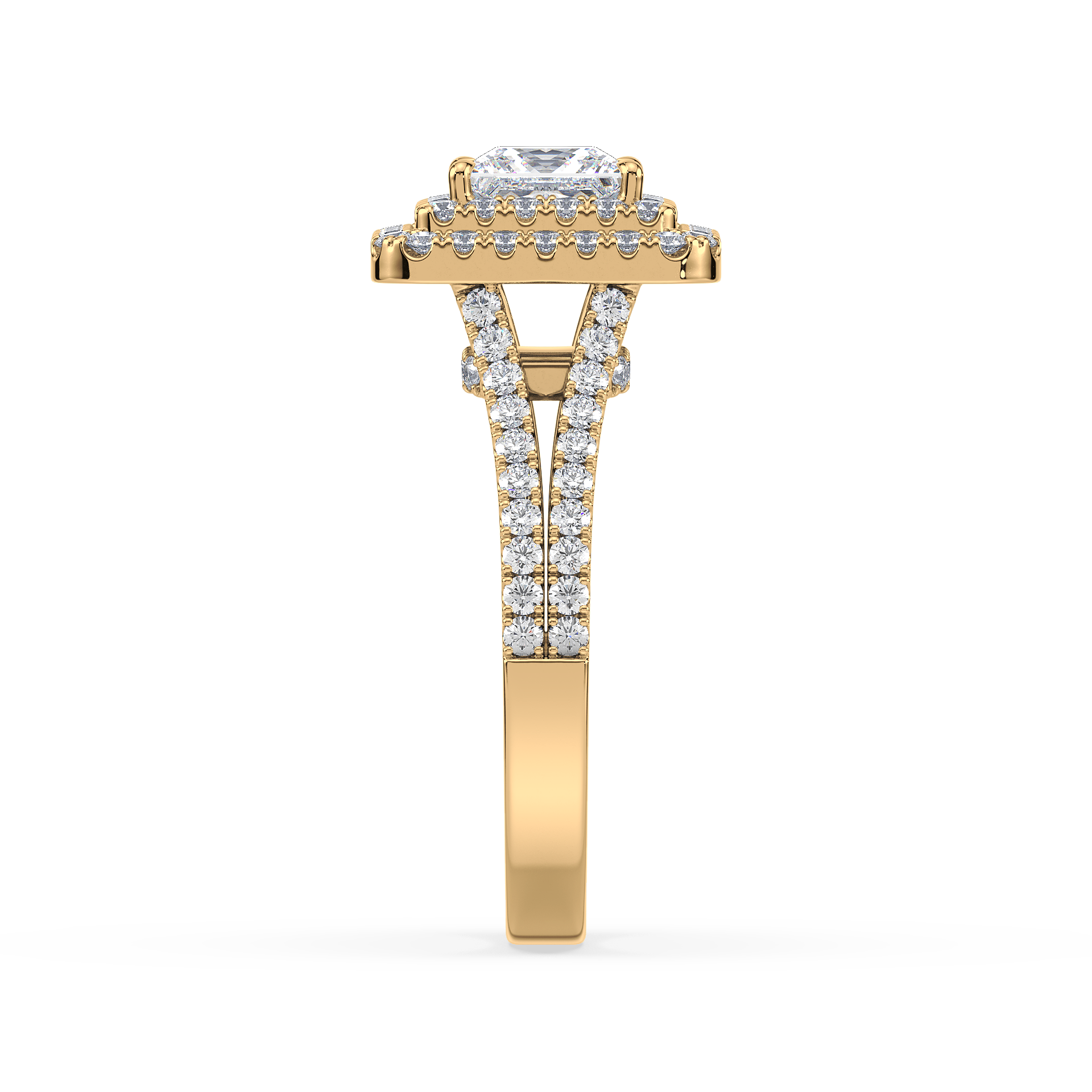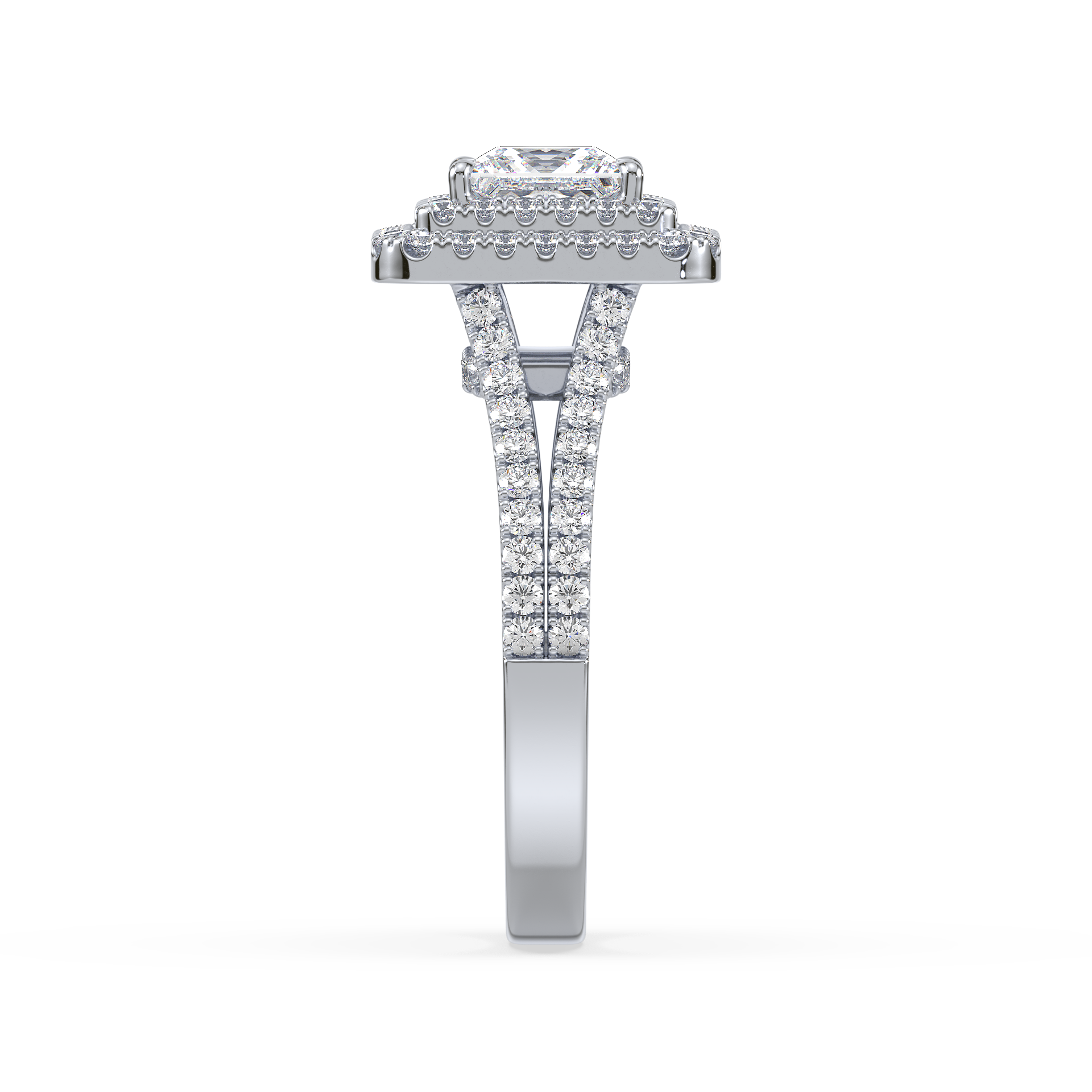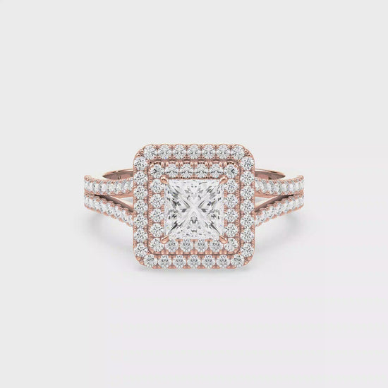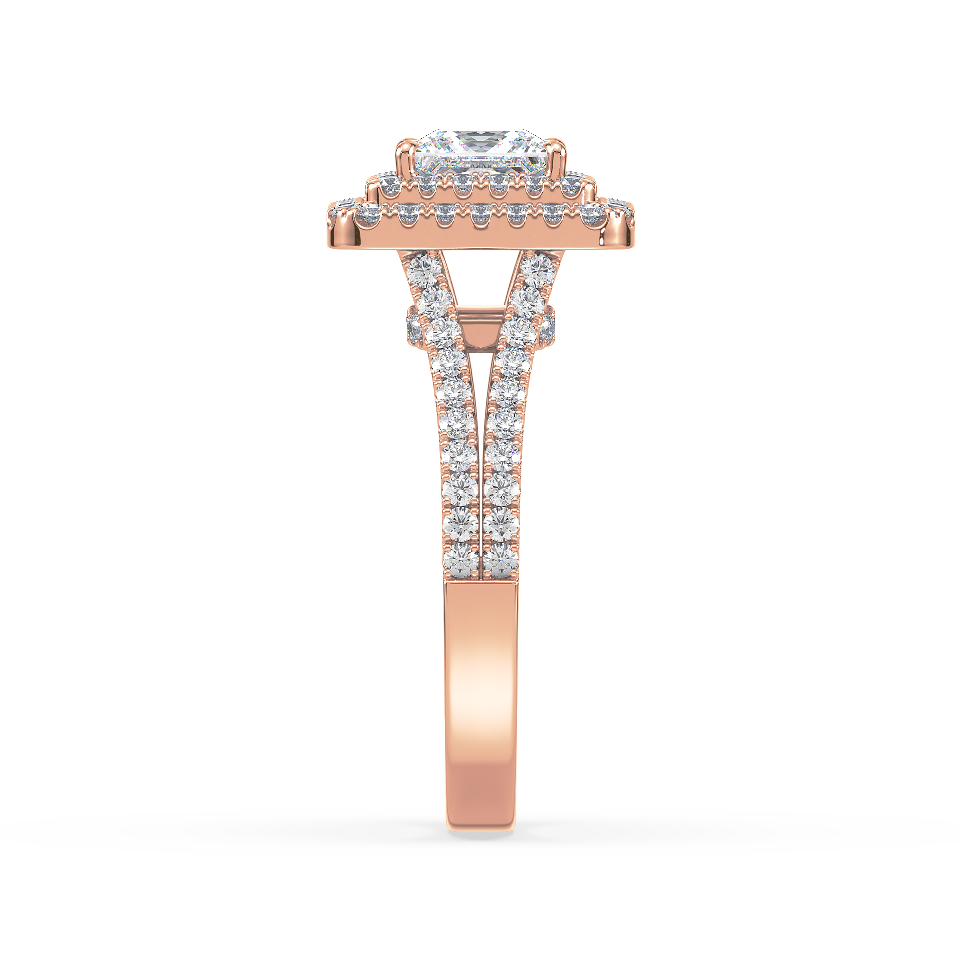 The Princess Solitaire Halo Shank Ring features a radiant princess-cut diamond at its center, surrounded by a halo of sparkling diamonds. The sleek band and halo setting enhance the central stone’s brilliance, creating a ring that’s both modern and timeless.