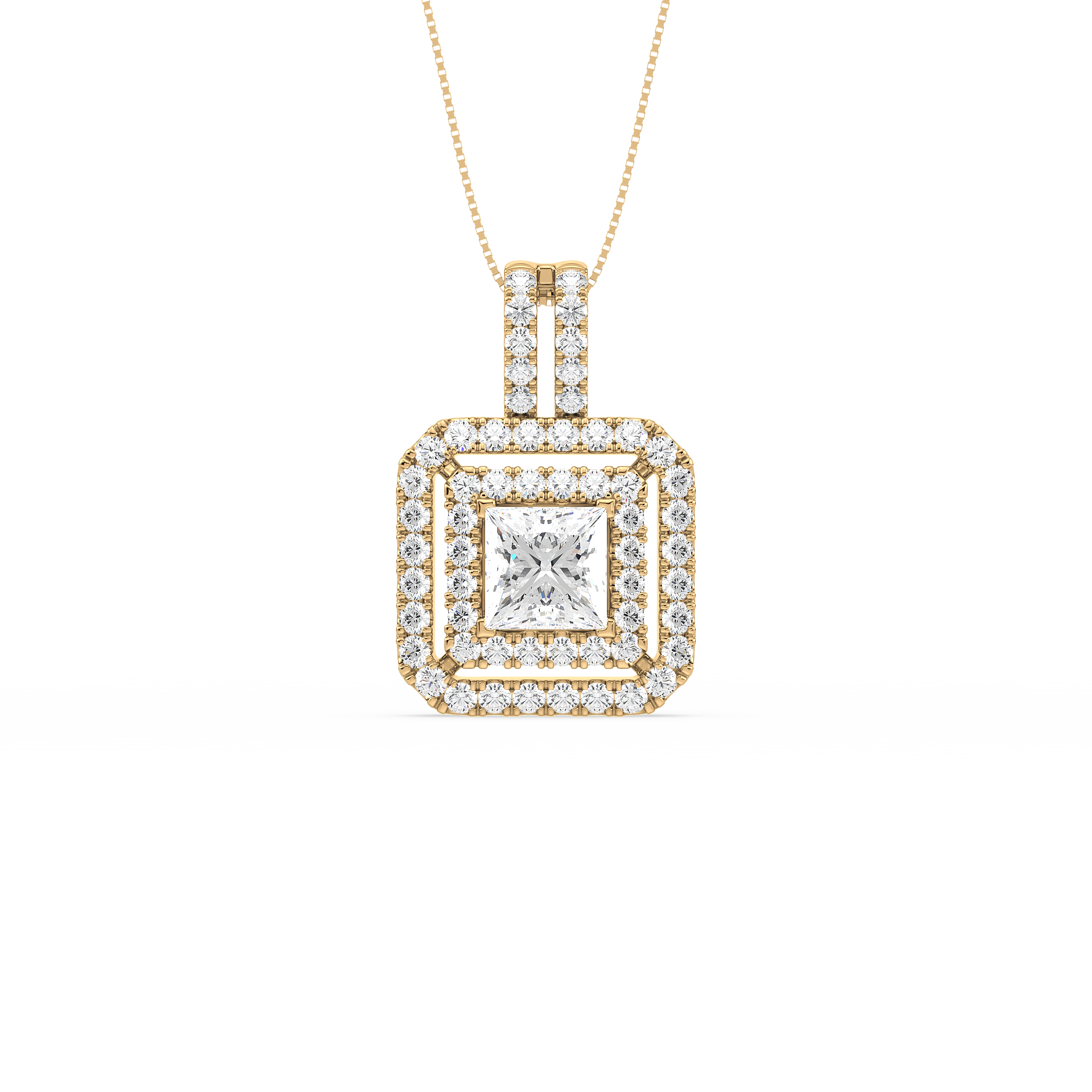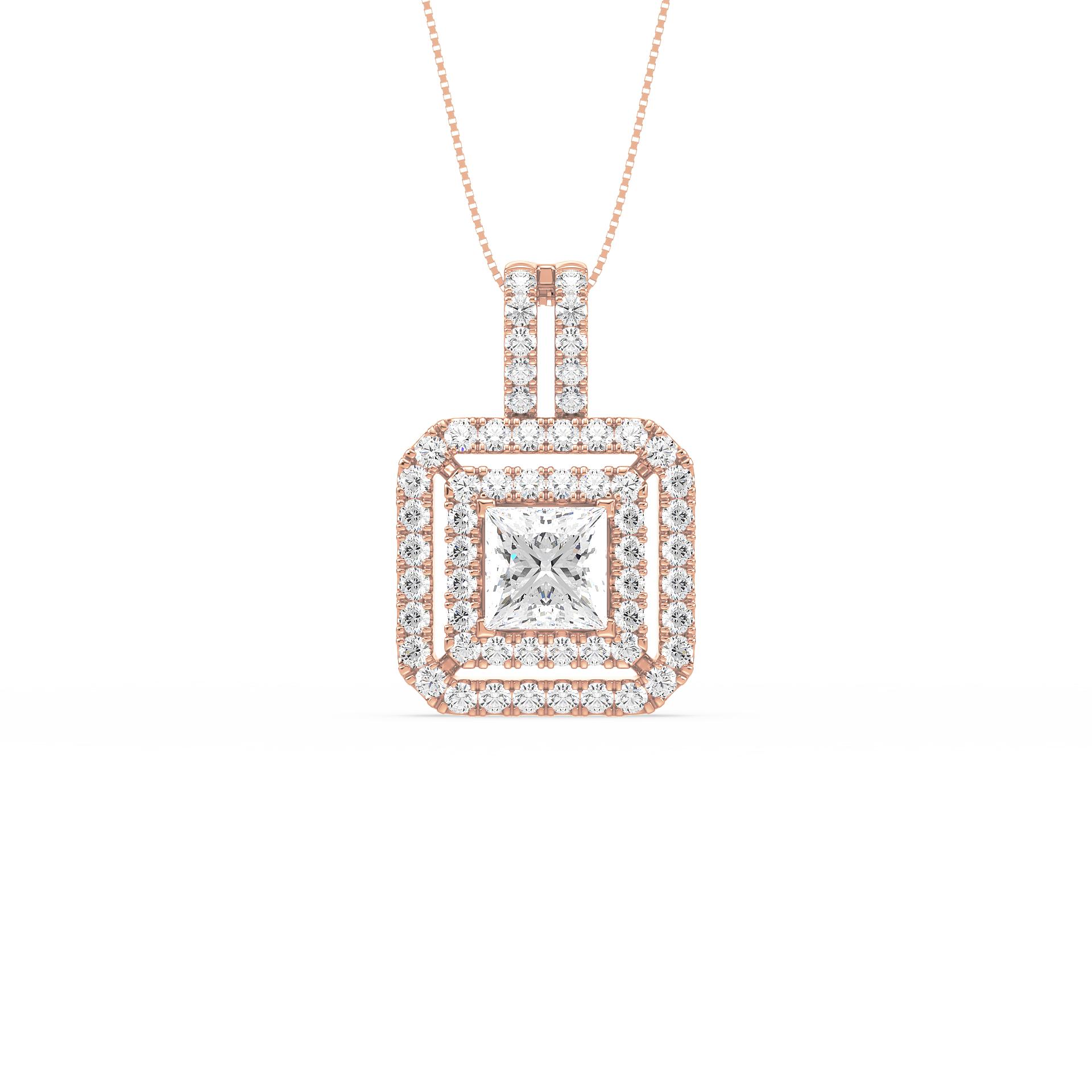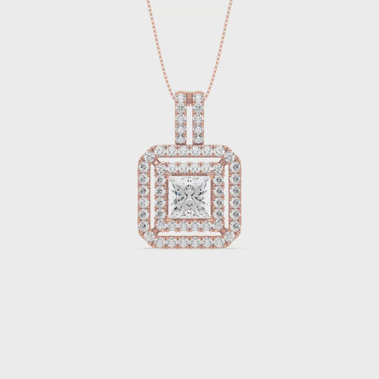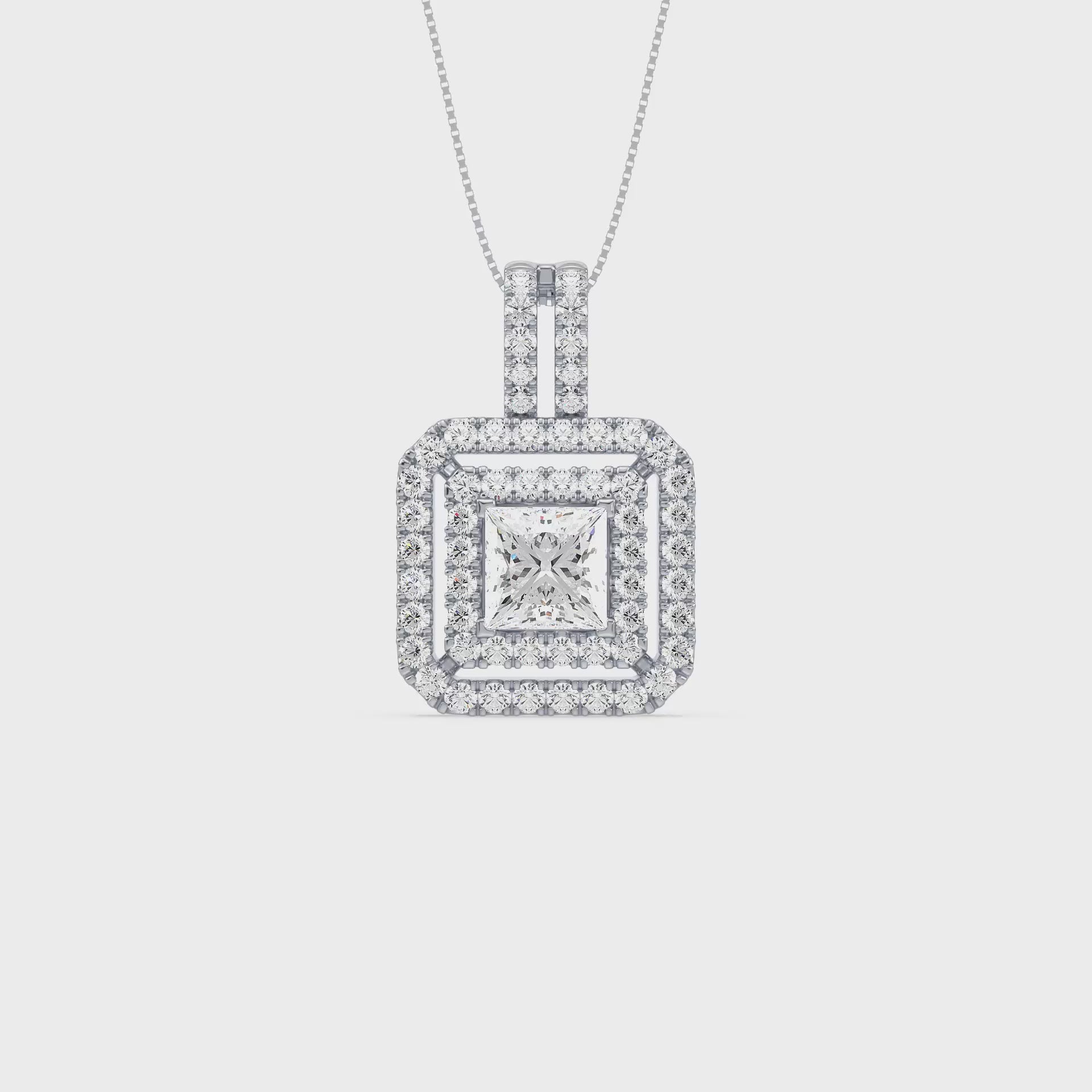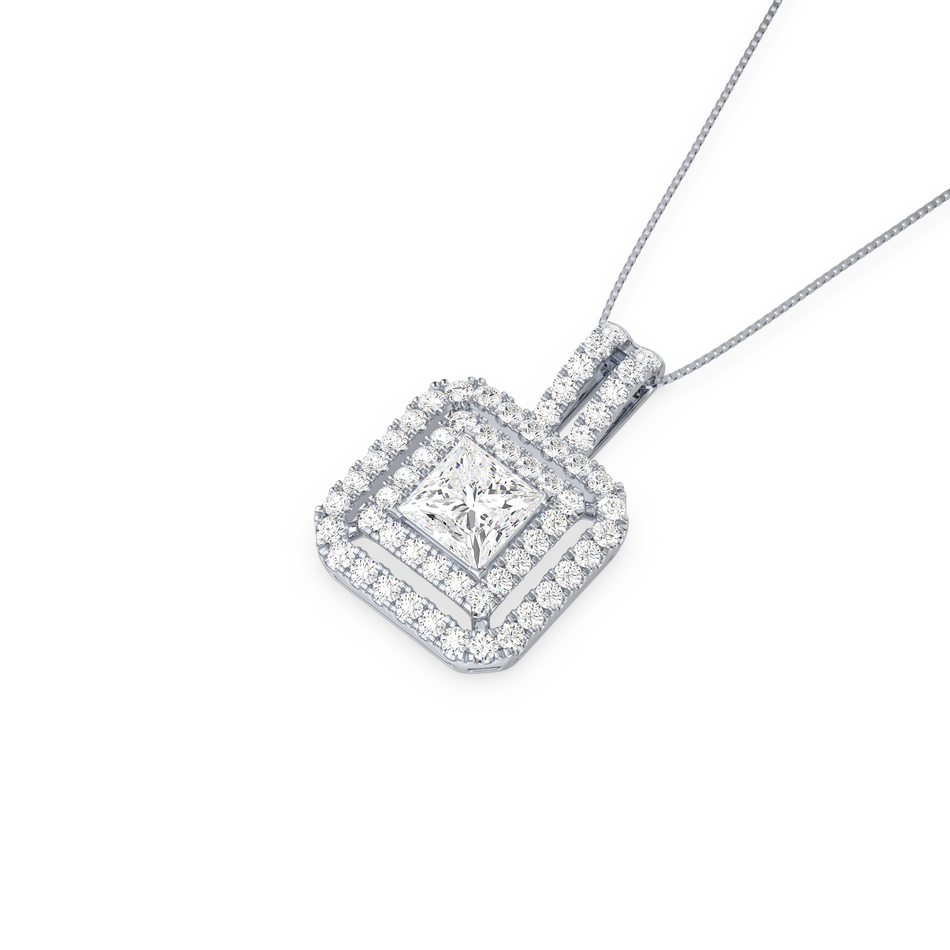 This pendant showcases a brilliant princess cut diamond, set simply to let its shape and sparkle shine. The clean, sharp lines of the diamond make it an elegant and modern choice for any occasion.